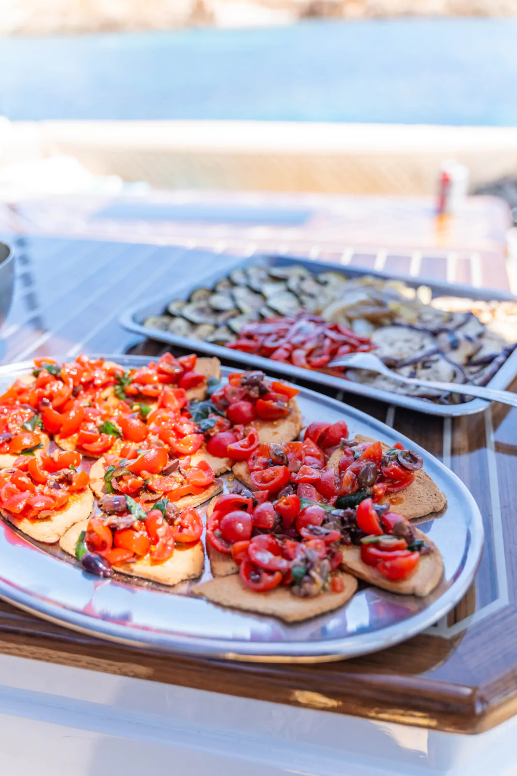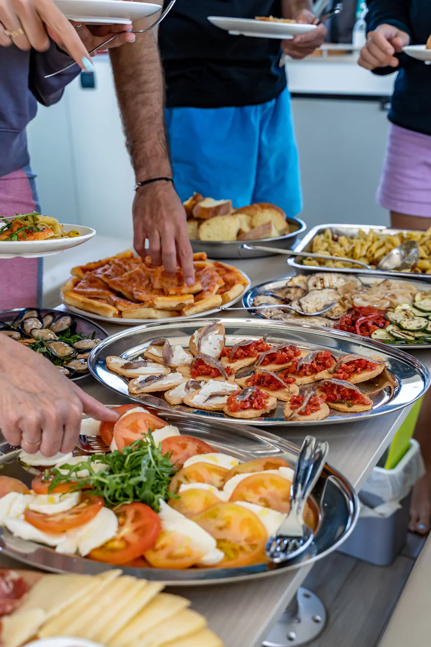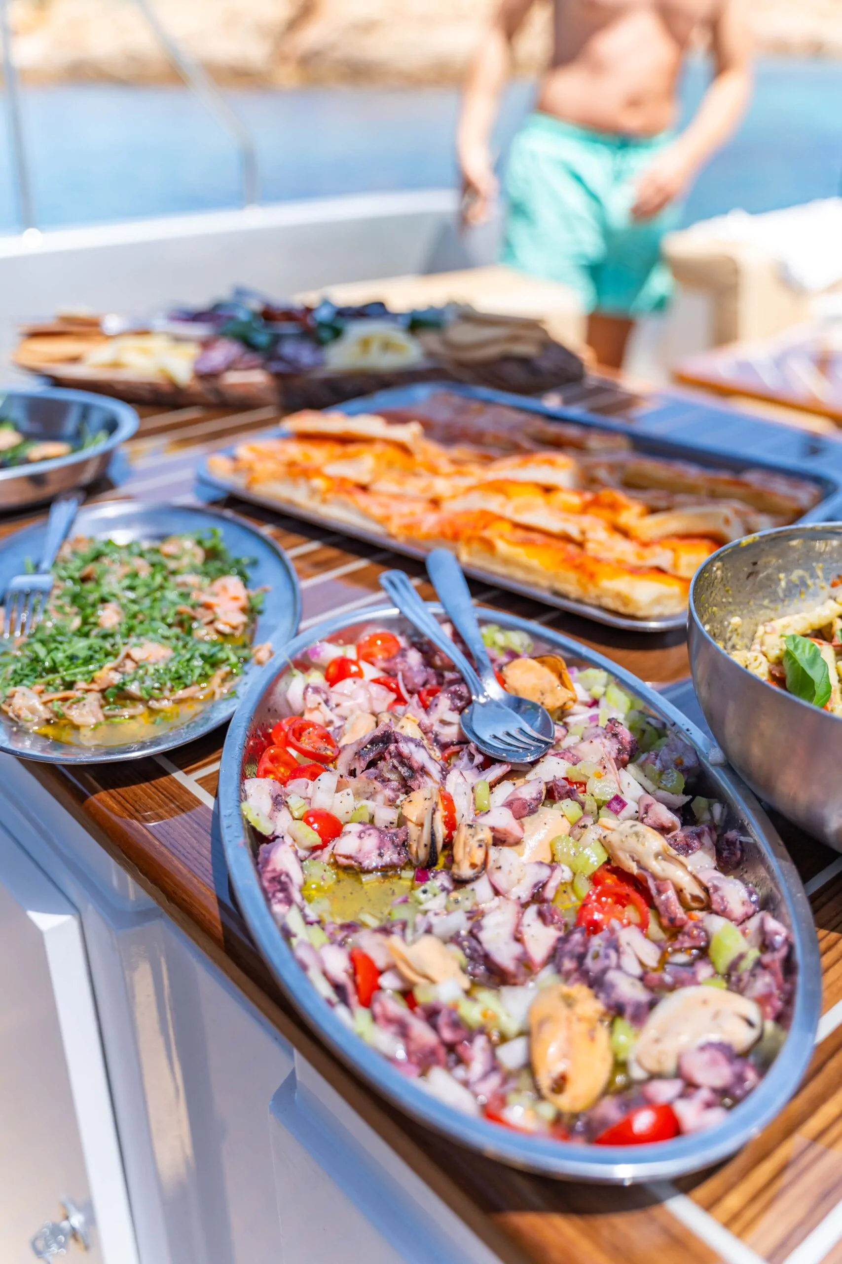 Na pokładzie, przy szumie fal zjecie pyszny obiad z formie bufetu – deska lokalnych serów i wędlin i marmoladą, makaron z pesto i suszonymi pomidorami, małże w sosie własnym, pizza margherita, grillowane sezonowe warzywa, sałatka caprese, rukola z łososiem, bruschetta z pomidorkami anchois oraz z kremowym serkiem i anchois, ricotta z miodem. Po obiedzie czeka nas leniwy relaks i słoneczne kąpiele na pokładzie oraz podziwianie niepowtarzalnych krajobrazów.