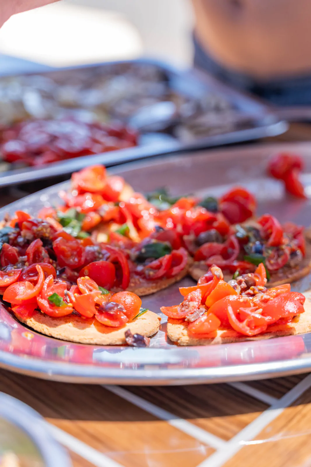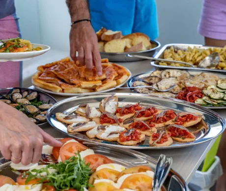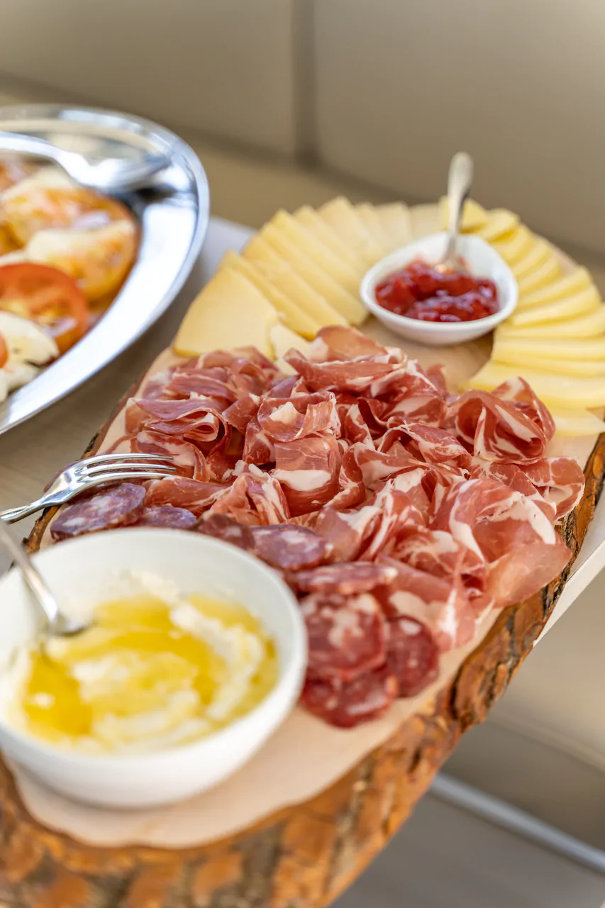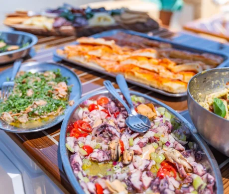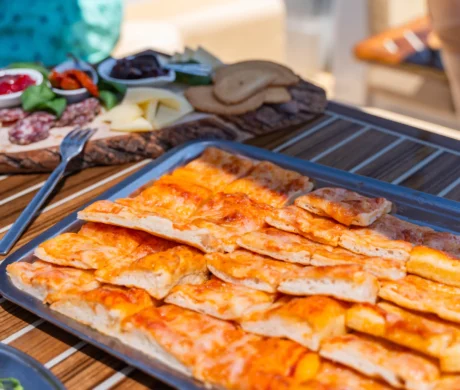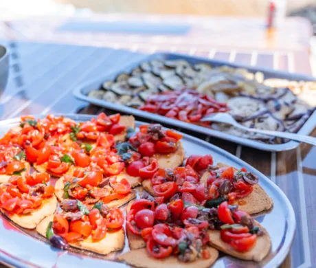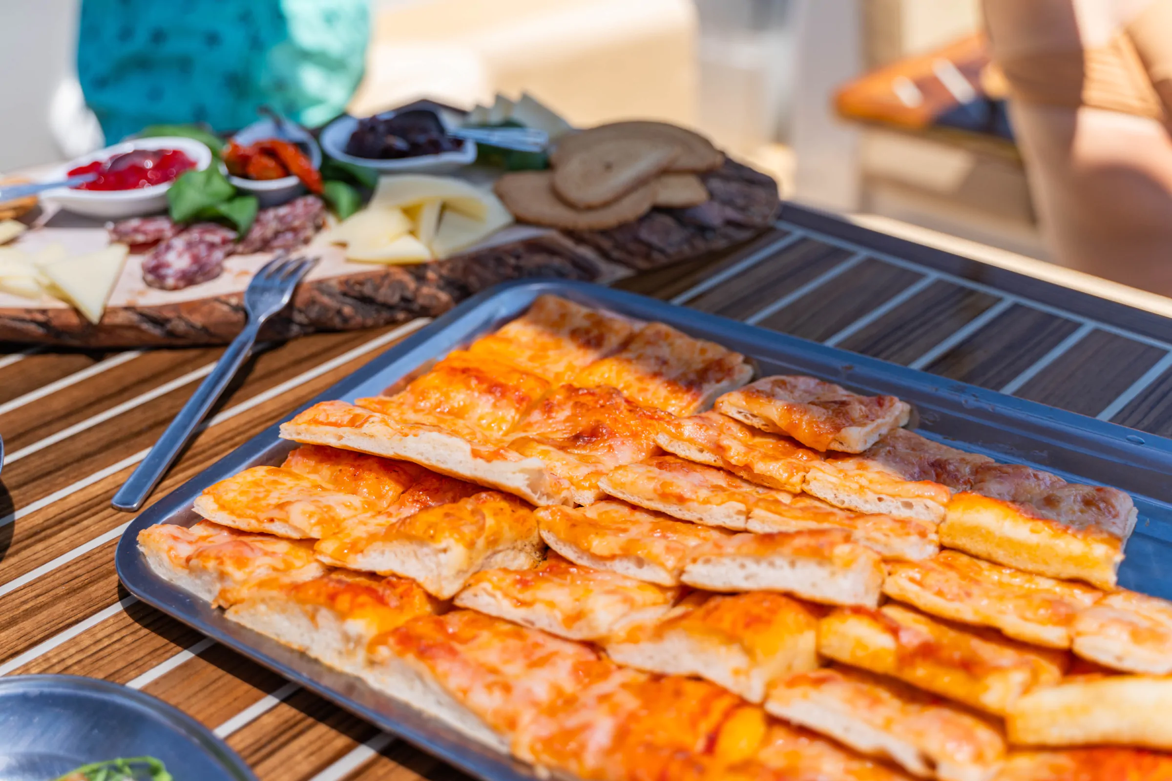Na pokładzie, przy szumie fal zjecie pyszny obiad z formie bufetu – deska lokalnych serów i wędlin i marmoladą, makaron z pesto i suszonymi pomidorami, małże w sosie własnym, pizza margherita, grillowane sezonowe warzywa, sałatka caprese, rukola z łososiem, bruschetta z pomidorkami anchois oraz z kremowym serkiem i anchois, ricotta z miodem. Po obiedzie czeka nas leniwy relaks i słoneczne kąpiele na pokładzie oraz podziwianie niepowtarzalnych krajobrazów.