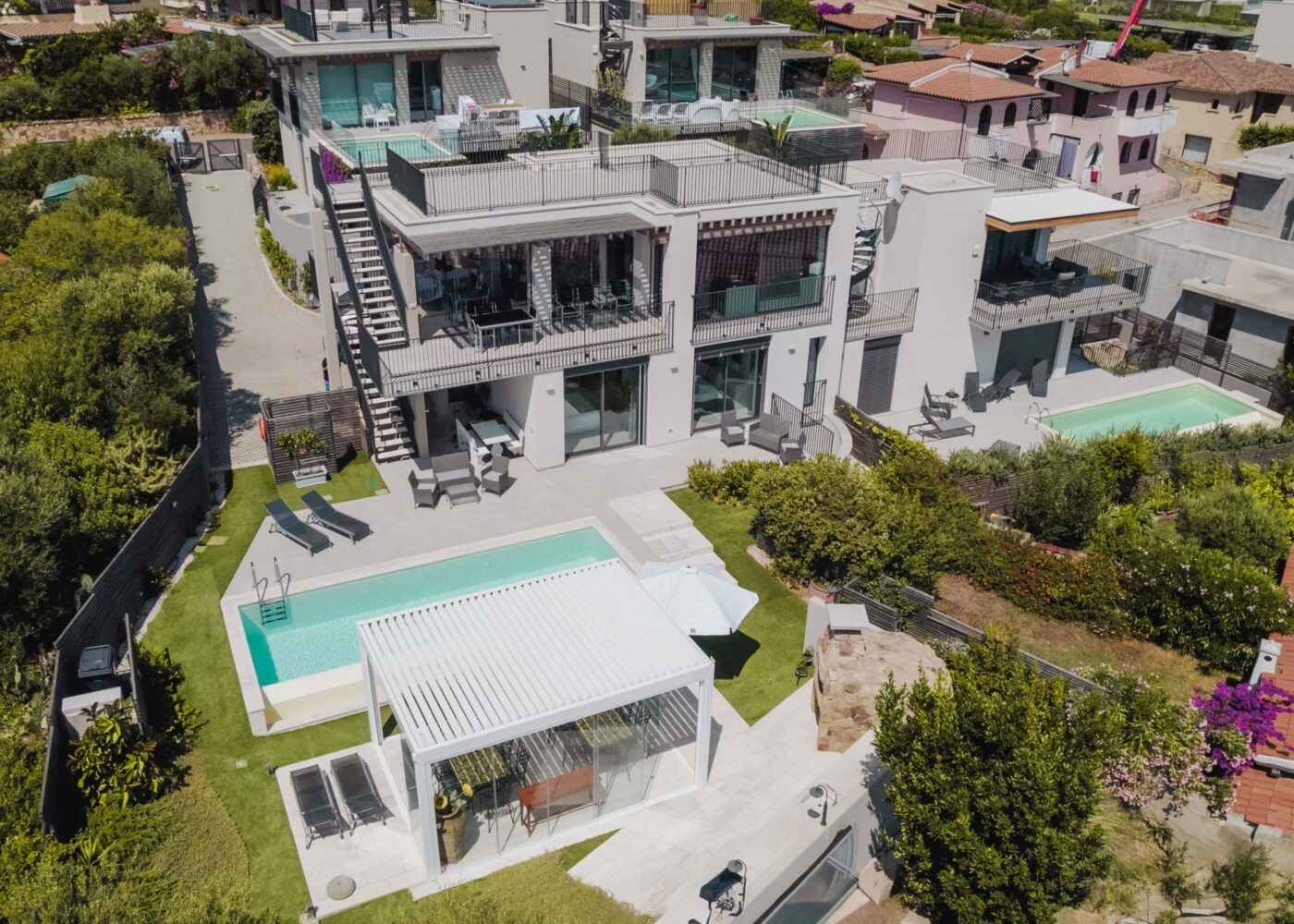 Nowoczesna, świetnie wyposażona willa idealna dla dużej grupy, położona 500 m od plaży. Dzięki dużym przeszkleniom wnętrza są pełne naturalnego światła, a drewniane belki sufitowe nadają willi ciepłej atmosfery. Pomieszczenia willi zostały rozłożone na 4 piętrach – 4 sypialnie, 6 łazienek, w pełni wyposażona kuchnia, taras na dachu z widokiem na morze. Na zewnątrz znajduje się prywatny basen i zadaszona altana.