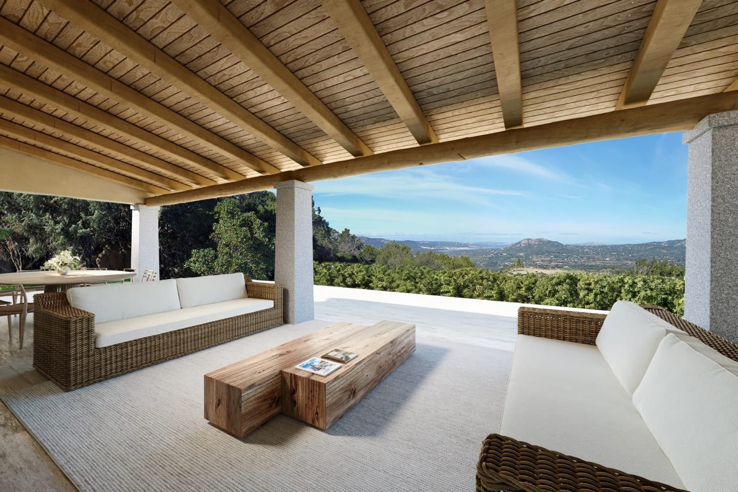 Przestronny suite z widokiem na basen, podwójną rozkładaną sofą, tarasem umeblowanym w wygodne i eleganckie meble z litego drewna.
