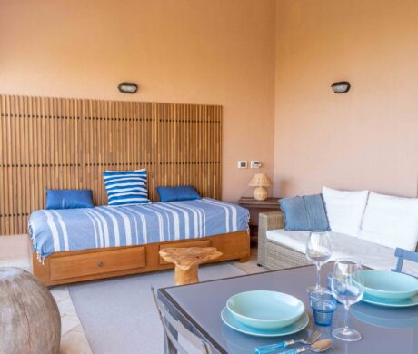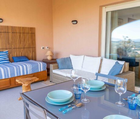 Apartament składa się z sypialni z łóżkiem małżeńskim oraz drugiej sypialni z łóżkiem piętrowym – czyli dwoma łóżkami pojedynczymi. W jasnym salonie znajduje się podwójna rozkładana sofa, która może służyć jako miejsce do spania dla dwóch osób. W pełni wyposażony aneks kuchenny daje możliwość samodzielnego przygotowywania posiłków, do dyspozycji jest jedna łazienka z prysznicem. Na zewnątrz znajdziecie piękny, zadaszony taras z pełnym umeblowaniem – stół, krzesła oraz sofę. Rozciera się stąd zachwycający widok na morze i pobliskie wyspy. Możecie tu korzystać z basenu znajdującego się w rezydencji.