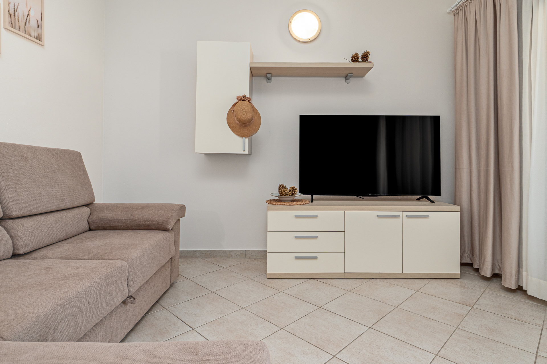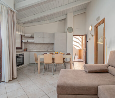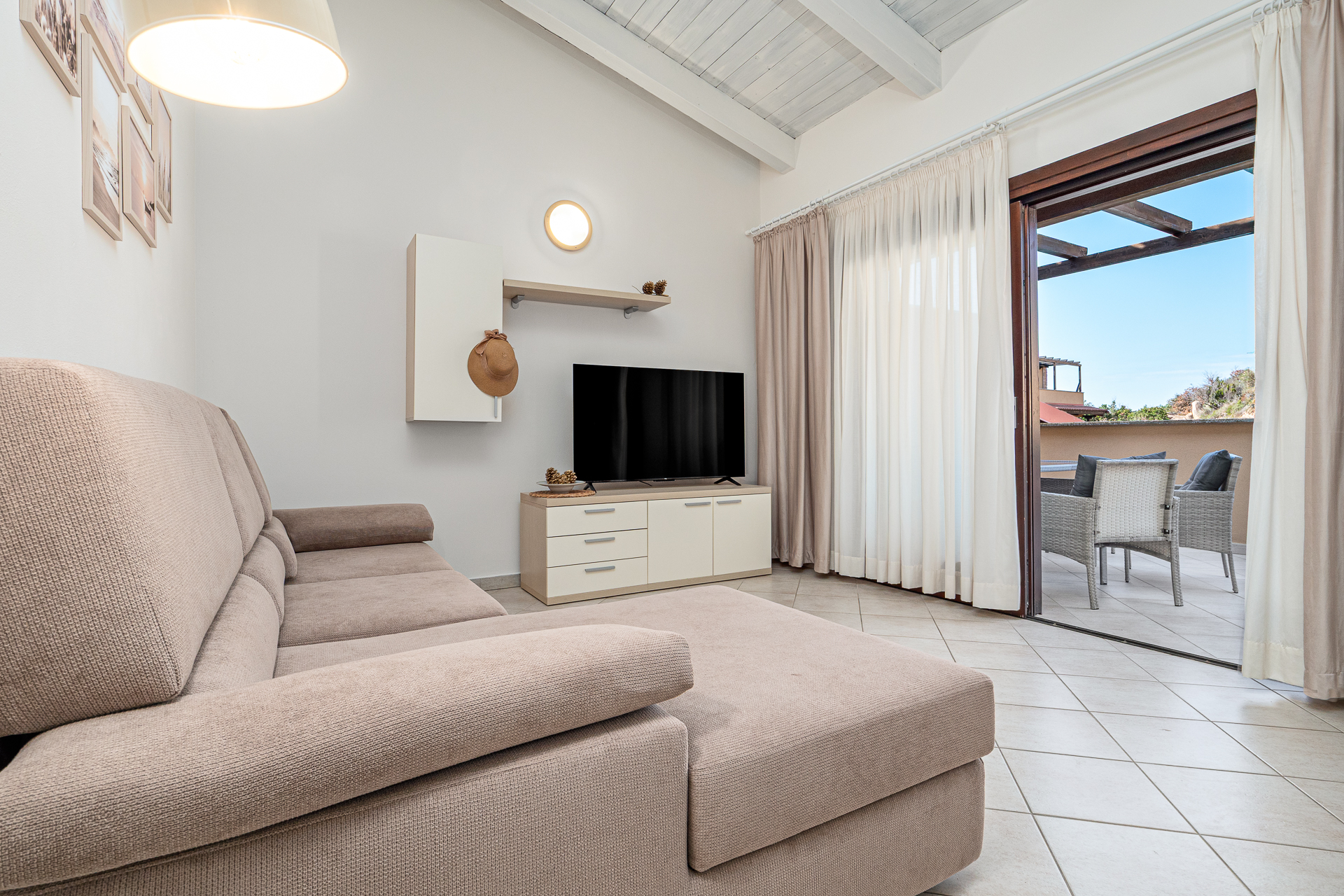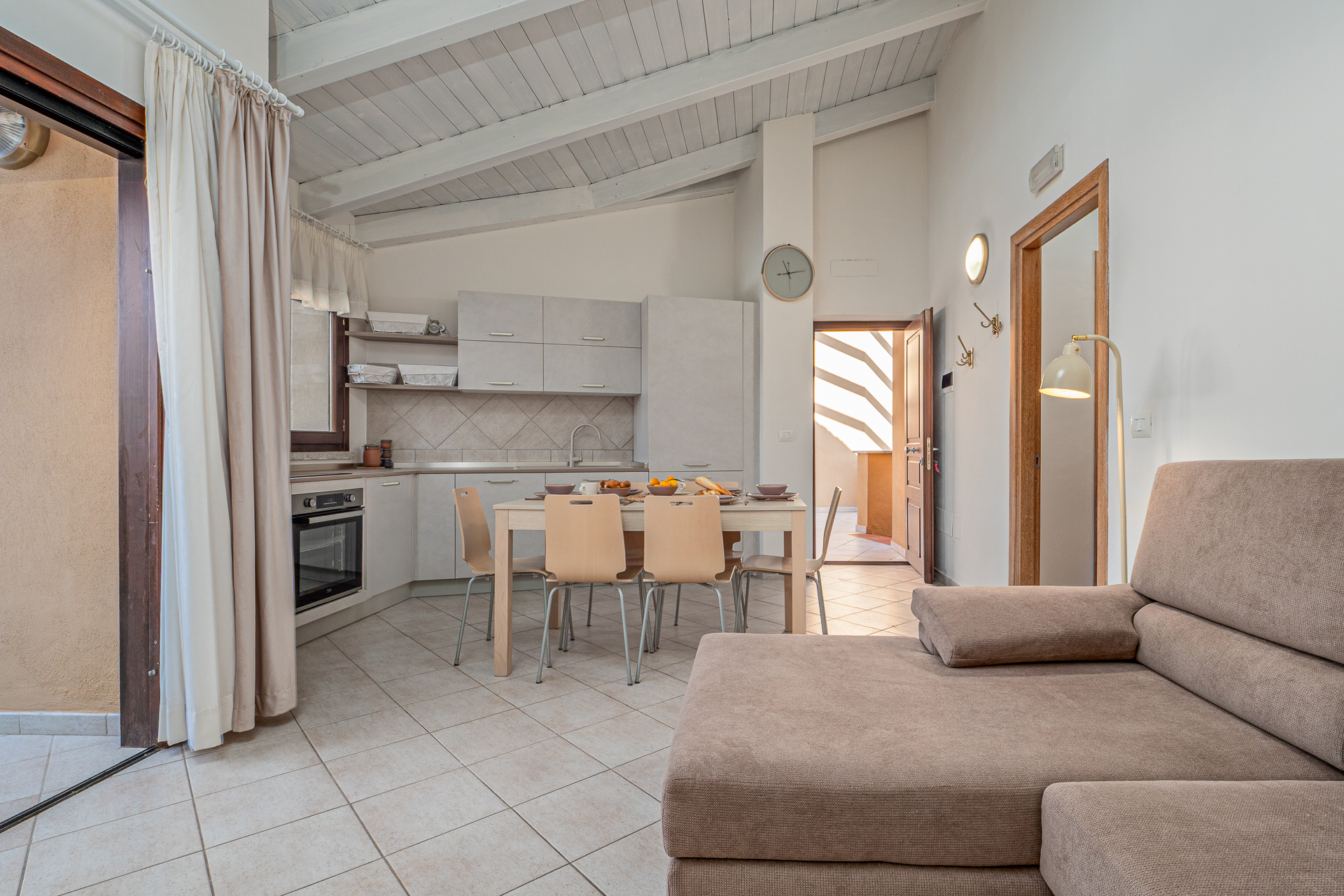 Apartament oferuje salon połączony z jadalnią i w pełni wyposażoną kuchnią, dwie sypialnie i łazienkę. Z salonu prowadzi wyjście na jeden z dwóch tarasów, natomiast z jednej z sypialni można bezpośrednio wyjść na drugi taras. Dodatkowo do dyspozycji gości jest zadaszona weranda, idealna do spożywania posiłków na świeżym powietrzu. W obu sypialniach znajduje się duże łóżko typu king size, a w salonie rozkładana sofa, która stanowi dodatkowe miejsce do spania dla dwóch osób. Na życzenie dostępne jest także łóżeczko turystyczne dla dziecka.