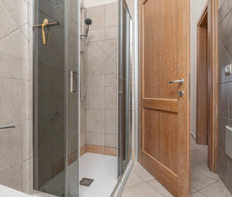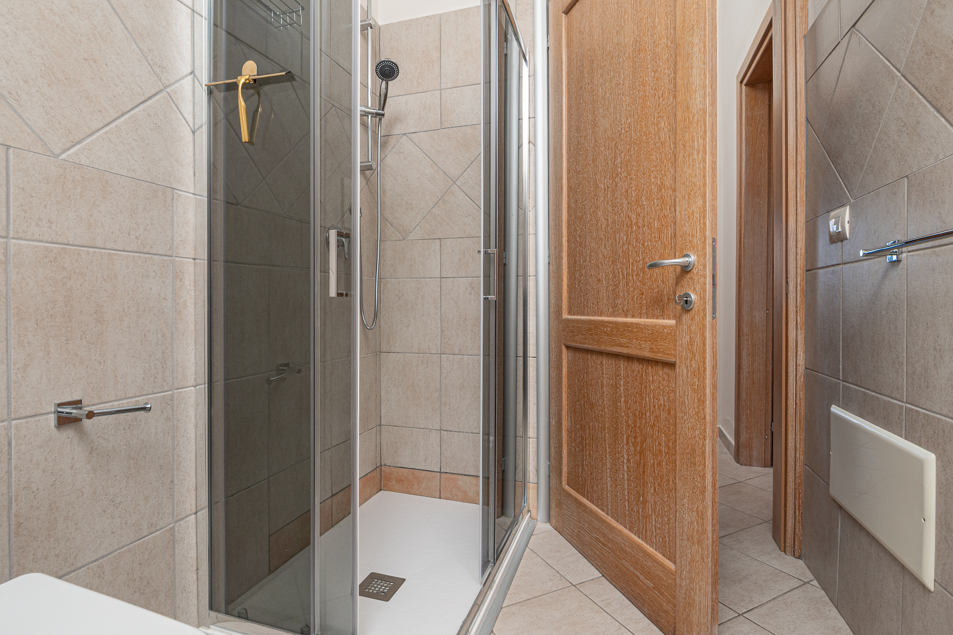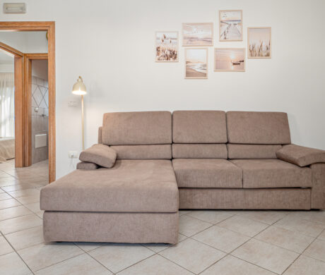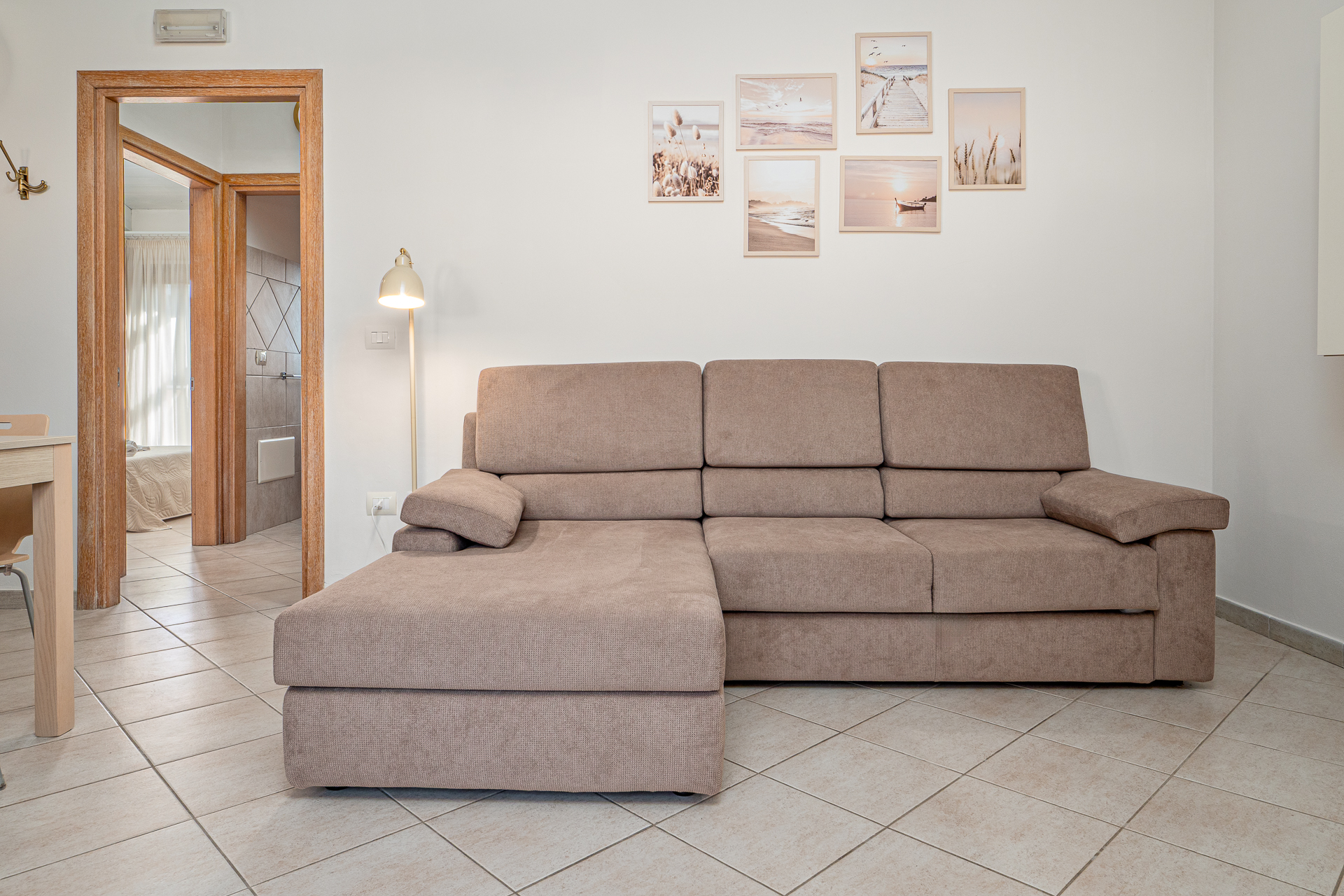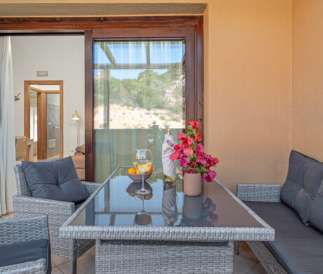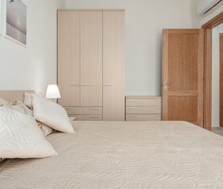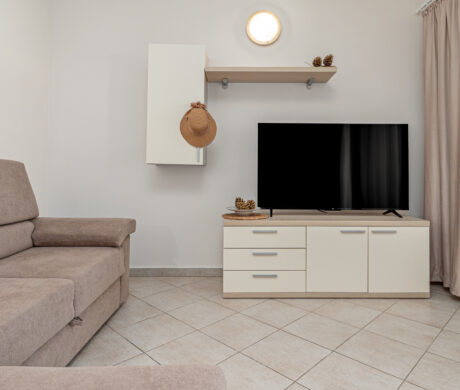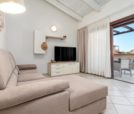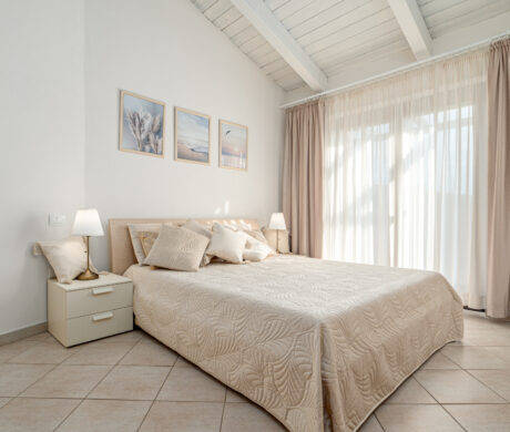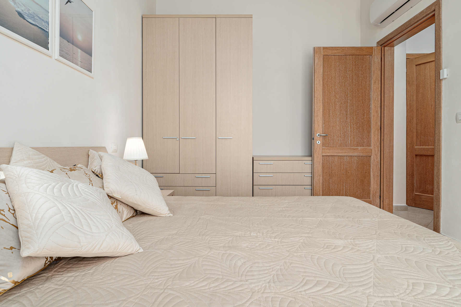 Apartament oferuje salon połączony z jadalnią i w pełni wyposażoną kuchnią, dwie sypialnie i łazienkę. Z salonu prowadzi wyjście na jeden z dwóch tarasów, natomiast z jednej z sypialni można bezpośrednio wyjść na drugi taras. Dodatkowo do dyspozycji gości jest zadaszona weranda, idealna do spożywania posiłków na świeżym powietrzu. W obu sypialniach znajduje się duże łóżko typu king size, a w salonie rozkładana sofa, która stanowi dodatkowe miejsce do spania dla dwóch osób. Na życzenie dostępne jest także łóżeczko turystyczne dla dziecka.