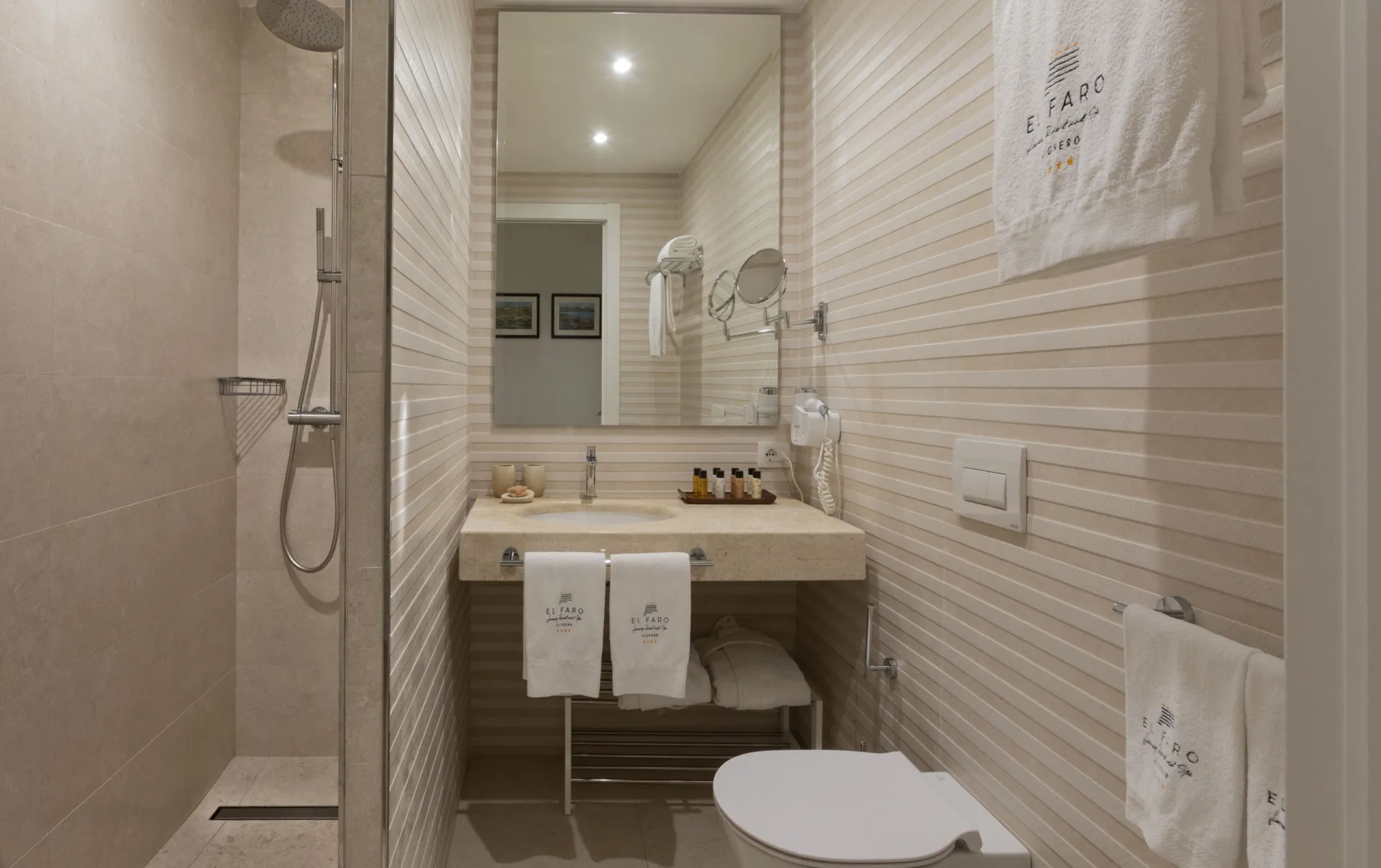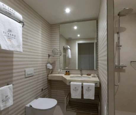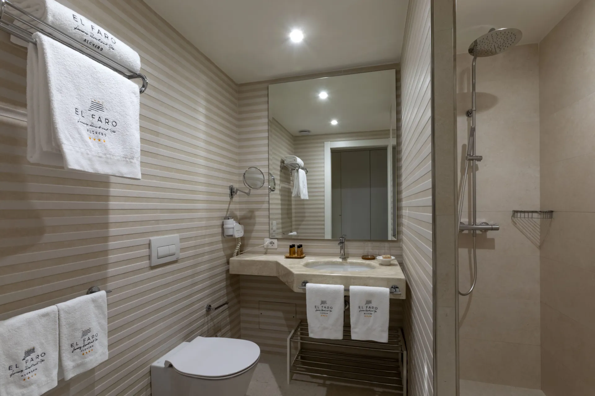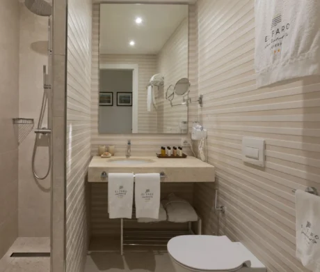 Komfort i prywatność charakteryzują 90 pokoi hotelu El Faro, z których większość ma okna, balkony lub tarasy ze spektakularnymi widokami na krystalicznie czyste morze zatoki Baia delle Ninfe i Capo Caccia. Wyjątkowe lokalne kamienne podłogi i piękne marmurowe łazienki to tylko niektóre szczegóły tych elegancko i prosto urządzonych pokoi, wyposażonych we wszystkie udogodnienia wyrafinowanego i luksusowego hotelu.