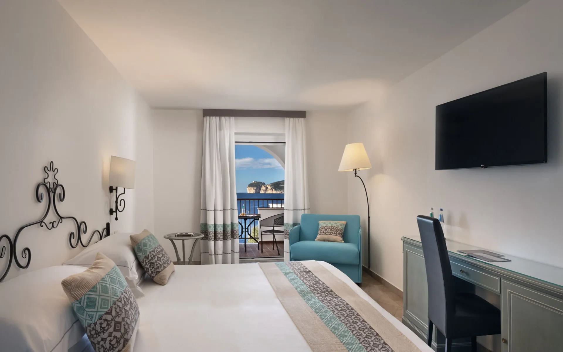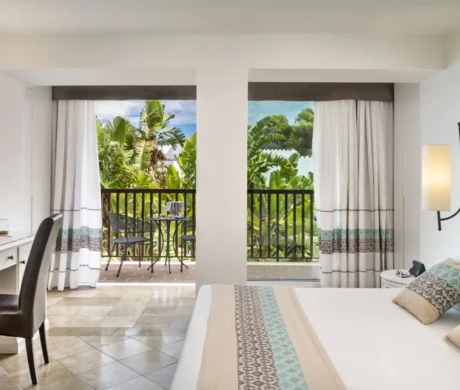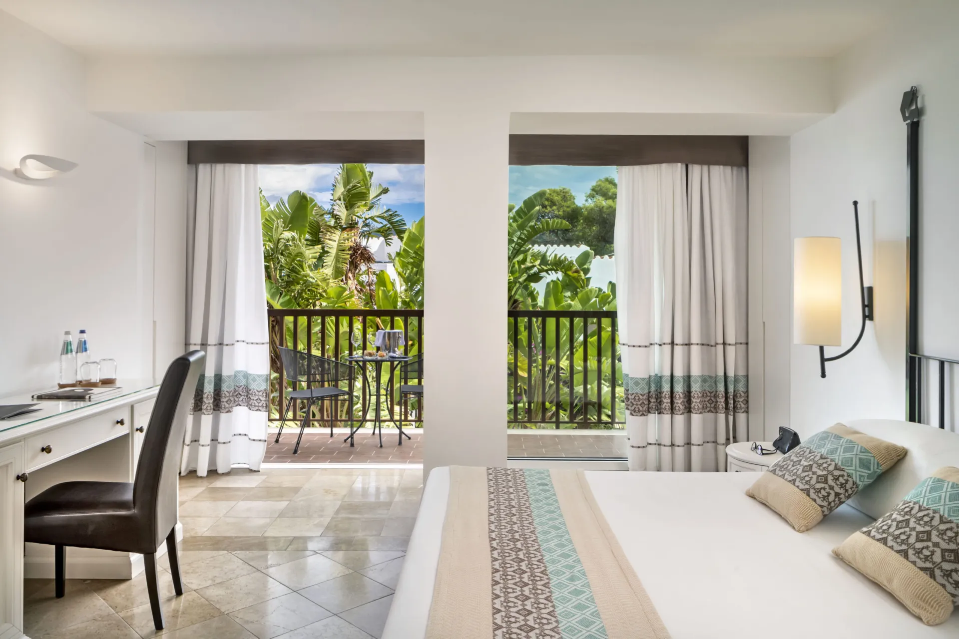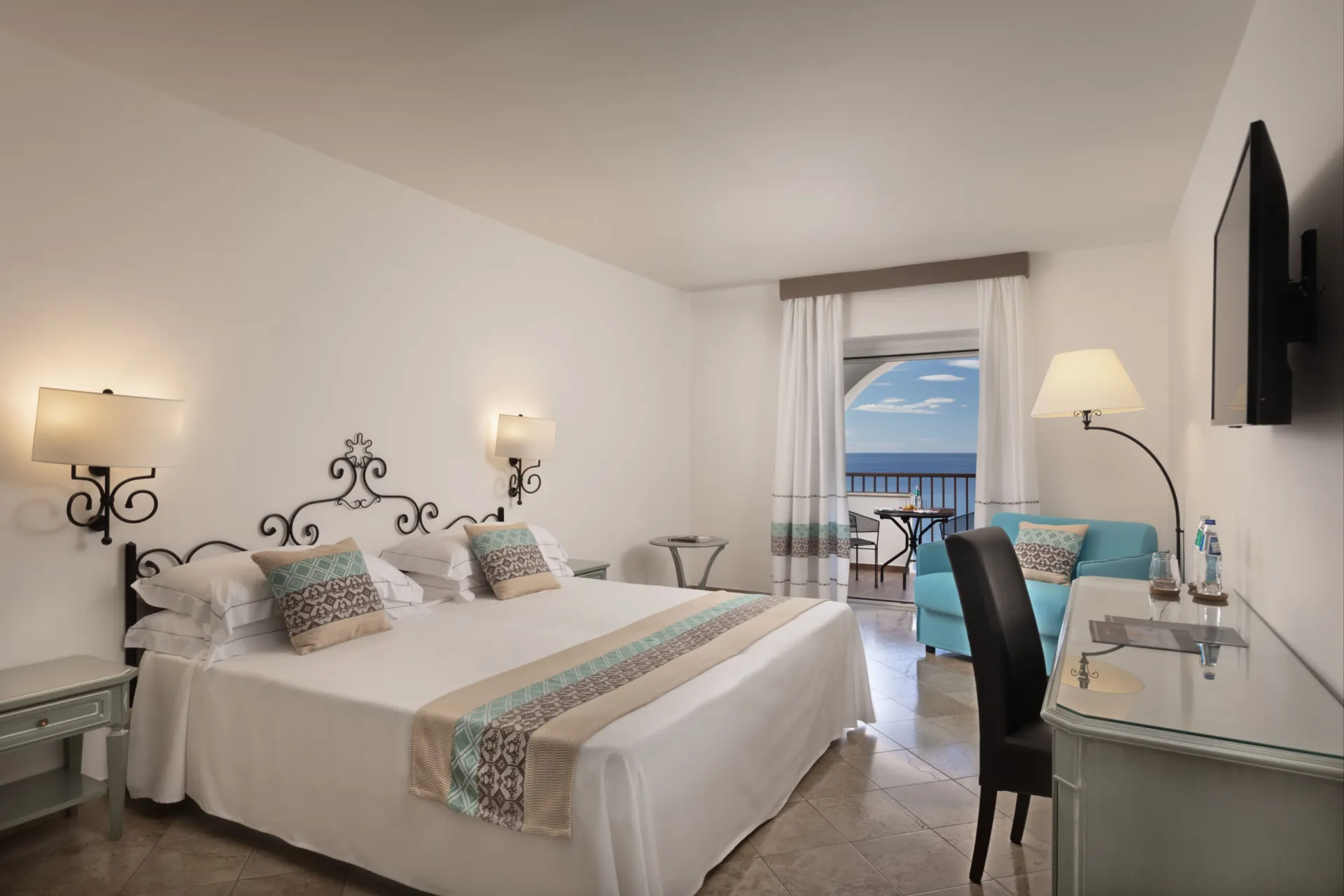 Pokoje typu twin lub pokoje dwuosobowe, wszystkie posiadają balkon lub taras ze stołem i krzesłami, z widokiem na wewnętrzny ogród hotelu i wspaniałym bocznym widokiem na zatokę. Przeznaczone dla 2 osób.