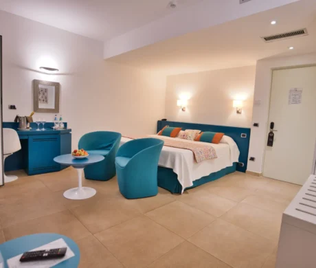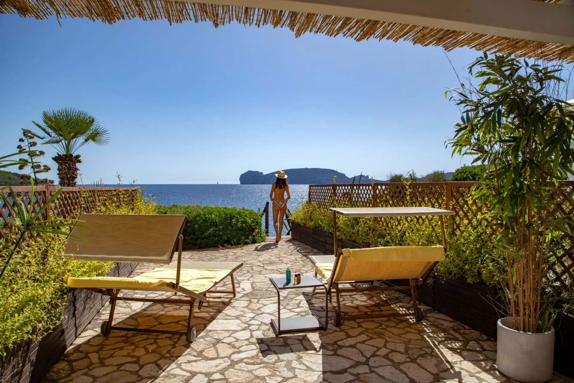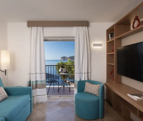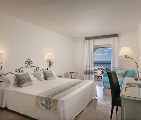Zlokalizowany w zarezerwowanej części hotelu, z prywatnym dostępem do plaży. Niedawno odnowiony, głównym elementem jest panorama wybrzeża Sardynii. Posiada sypialnię z łóżkiem typu king-size i kącikiem do czytania, salon posiada tv i podwójną rozkładaną sofę. Do dyspozycji 2 łazienki. Prywatne patio wyposażone jest w stół i krzesła, leżaki i parasole. Przeznaczony dla 4 osób.