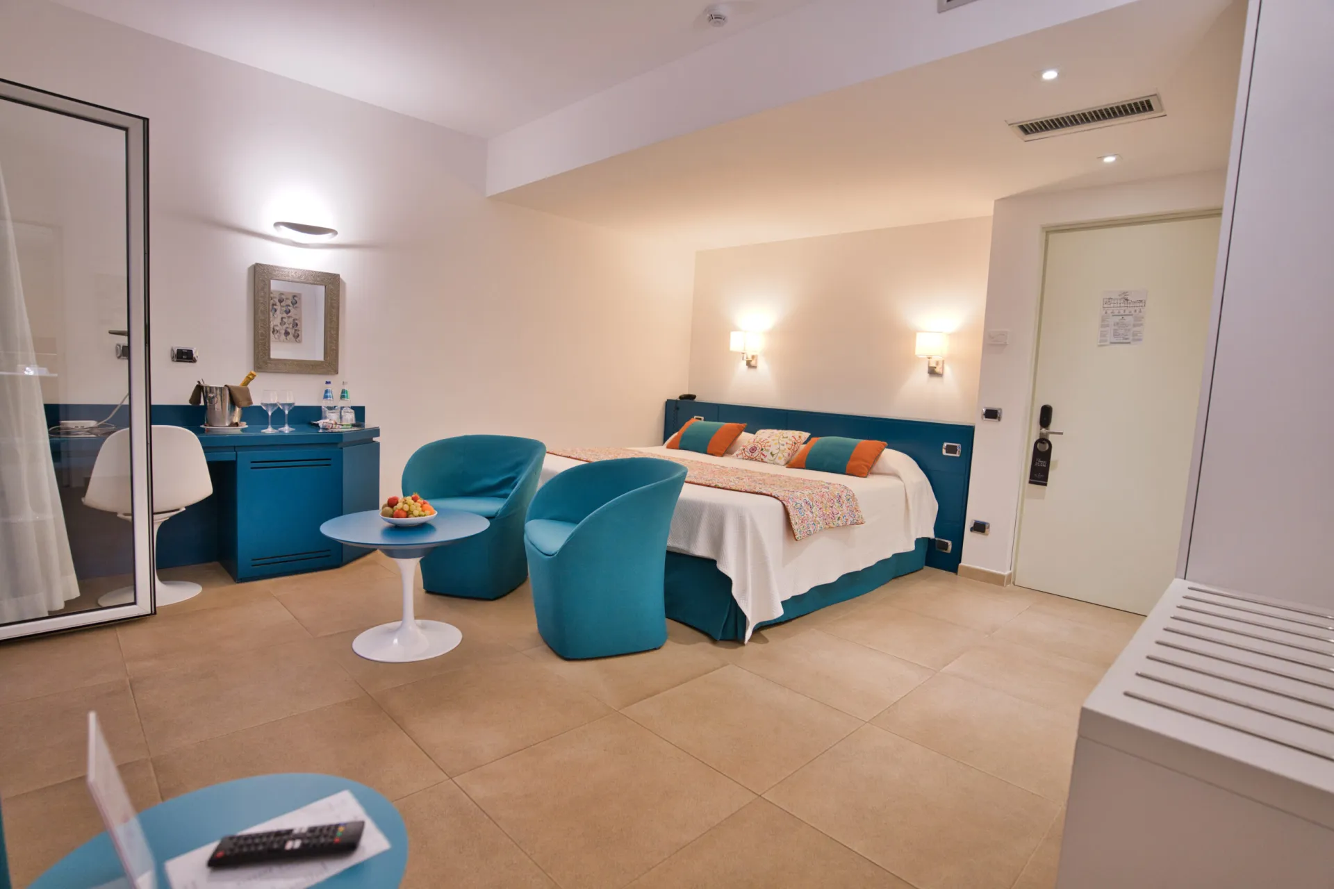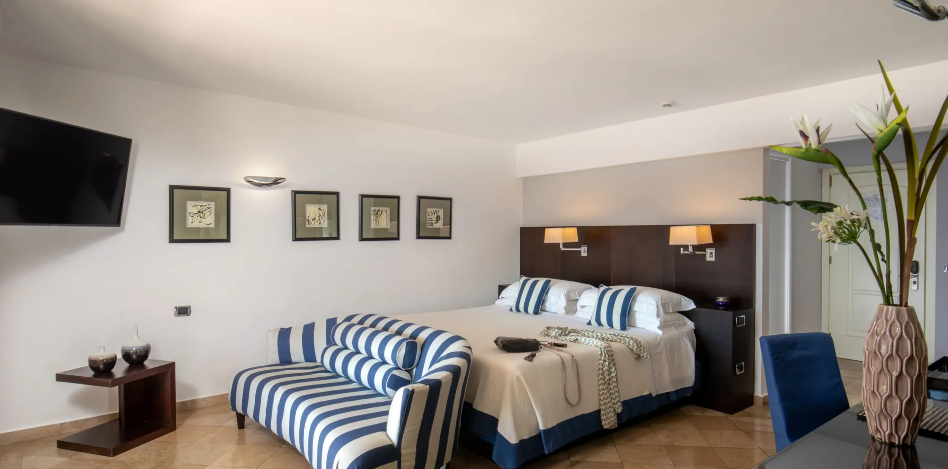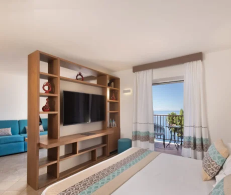 Te przestronne i komfortowe, jasne pokoje wyposażone są w łóżko typu king-size, część wypoczynkową z sofą. Prywatny umeblowany taras z widokiem na morze sprawi, że będziesz mógł podziwiać śródziemnomorski scenariusz. Przeznaczony dla 3 osób.