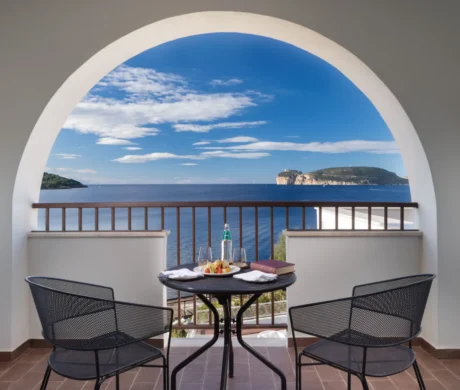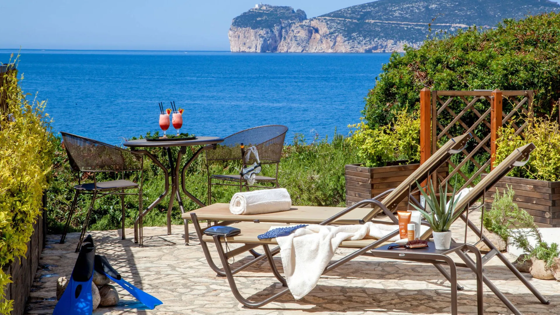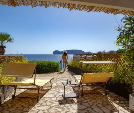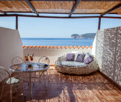 Apartament położony na ostatnim piętrze, charakteryzuje się spektakularnym tarasem z solarium i pięknym widokiem na naturalny rezerwat morski Capo Caccia. Apartament wyposażony jest w łóżko typu king-size, miejsce do czytania, łazienkę. Przeznaczony dla 2 osób.