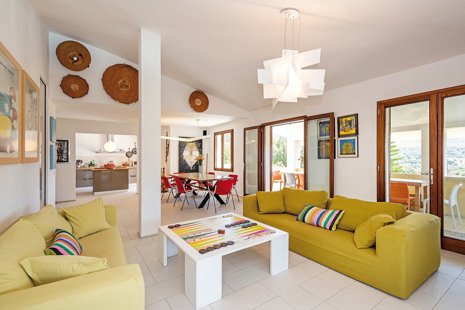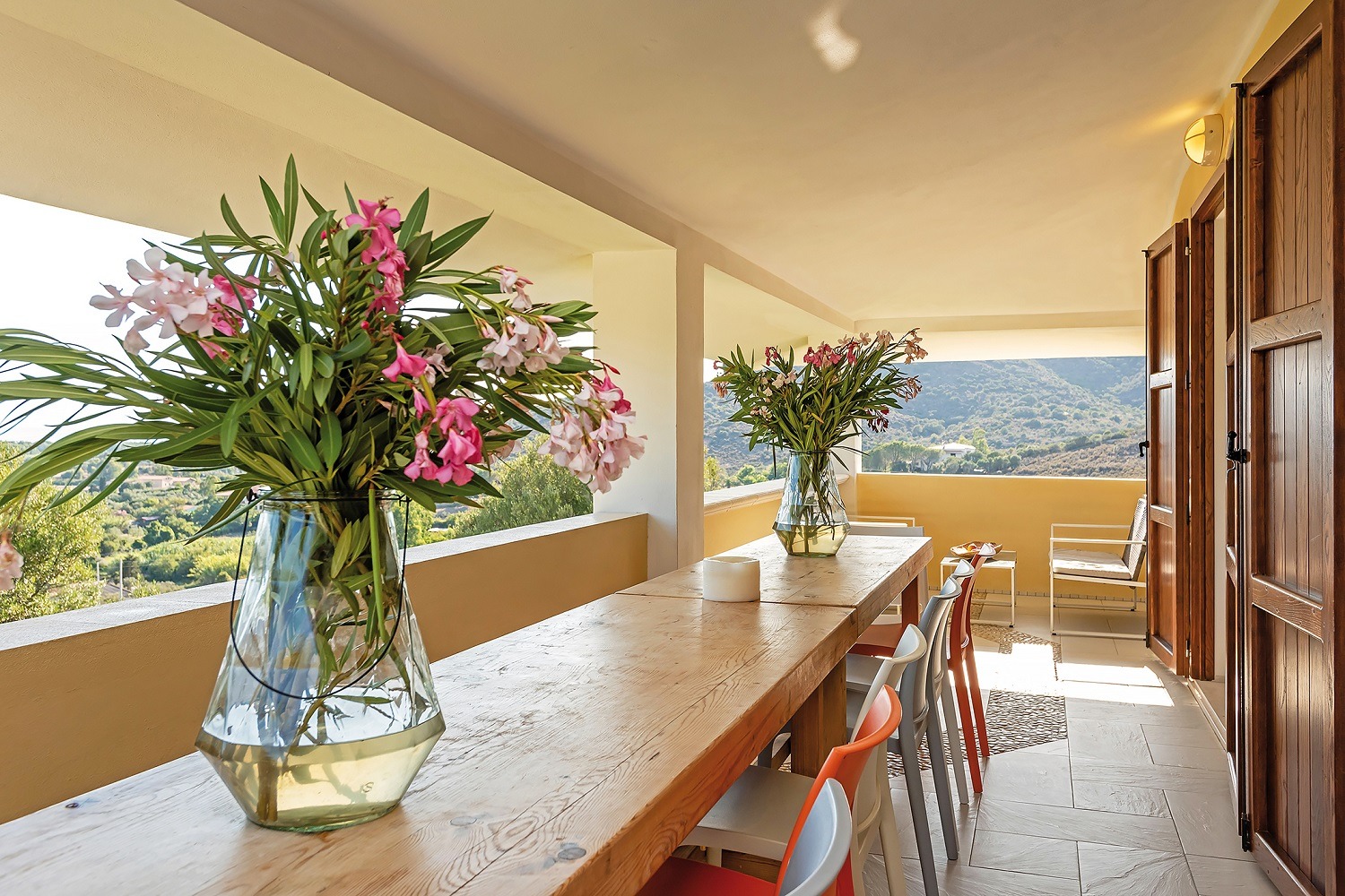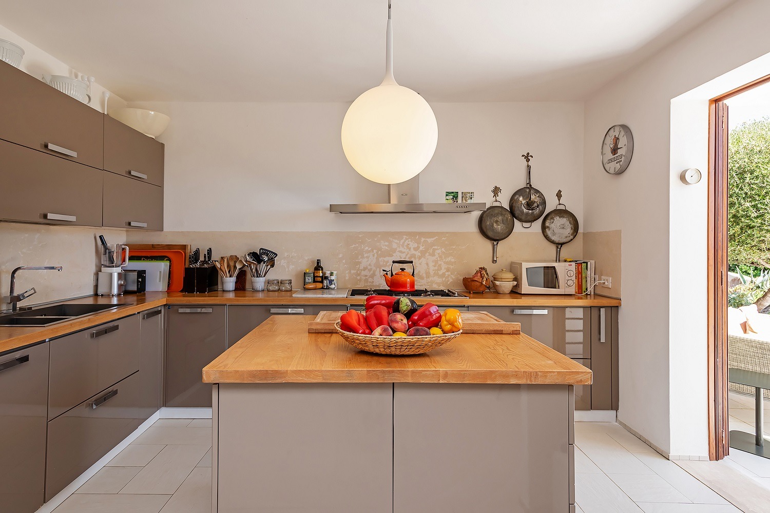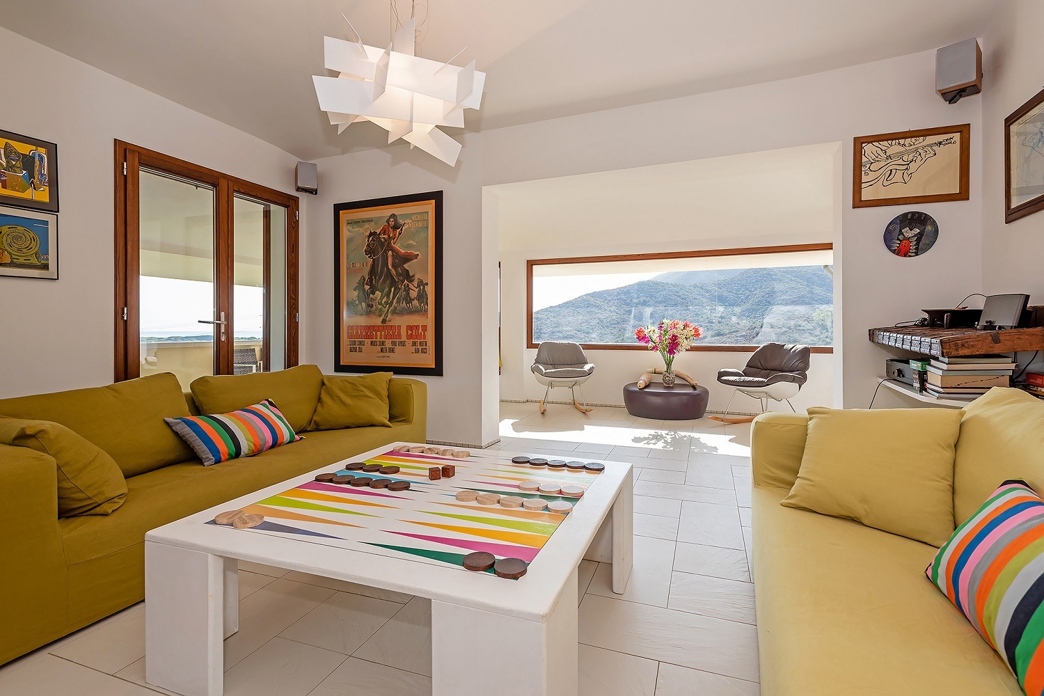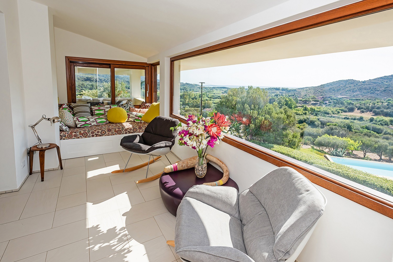 Willa Aurata to imponująca, wielopoziomowa willa położona pośród zielonych wzgórz Costa Verde, zaledwie 1,5 km od szerokiej, piaszczystej plaży Portixeddu. Idealne dla dużych rodzin lub grup przyjaciół. Wnętrze willi urządzone jest w stylu nieformalnej elegancji, tworząc przytulną i swobodną atmosferę. Główna część dzienna obejmuje przestronny salon z jadalnią oraz przeszkloną werandę z widokiem na morze i okoliczne wzgórza. Z salonu oraz kuchni prowadzą podwójne drzwi na taras, na którym znajduje się długi stół jadalny mogący pomieścić wszystkich gości. Kuchnia jest nowoczesna, w pełni wyposażona.