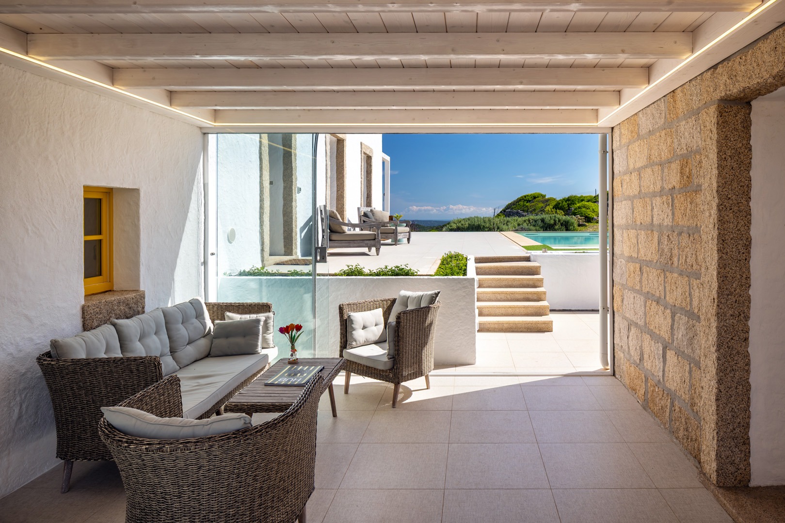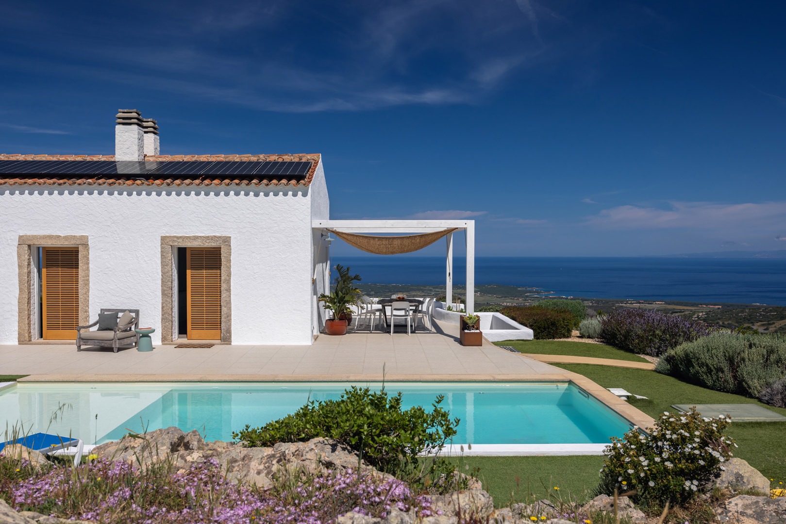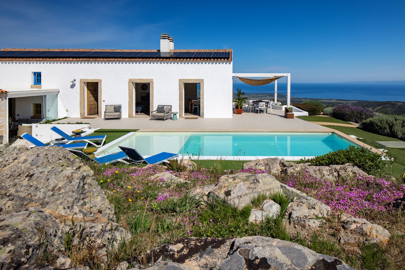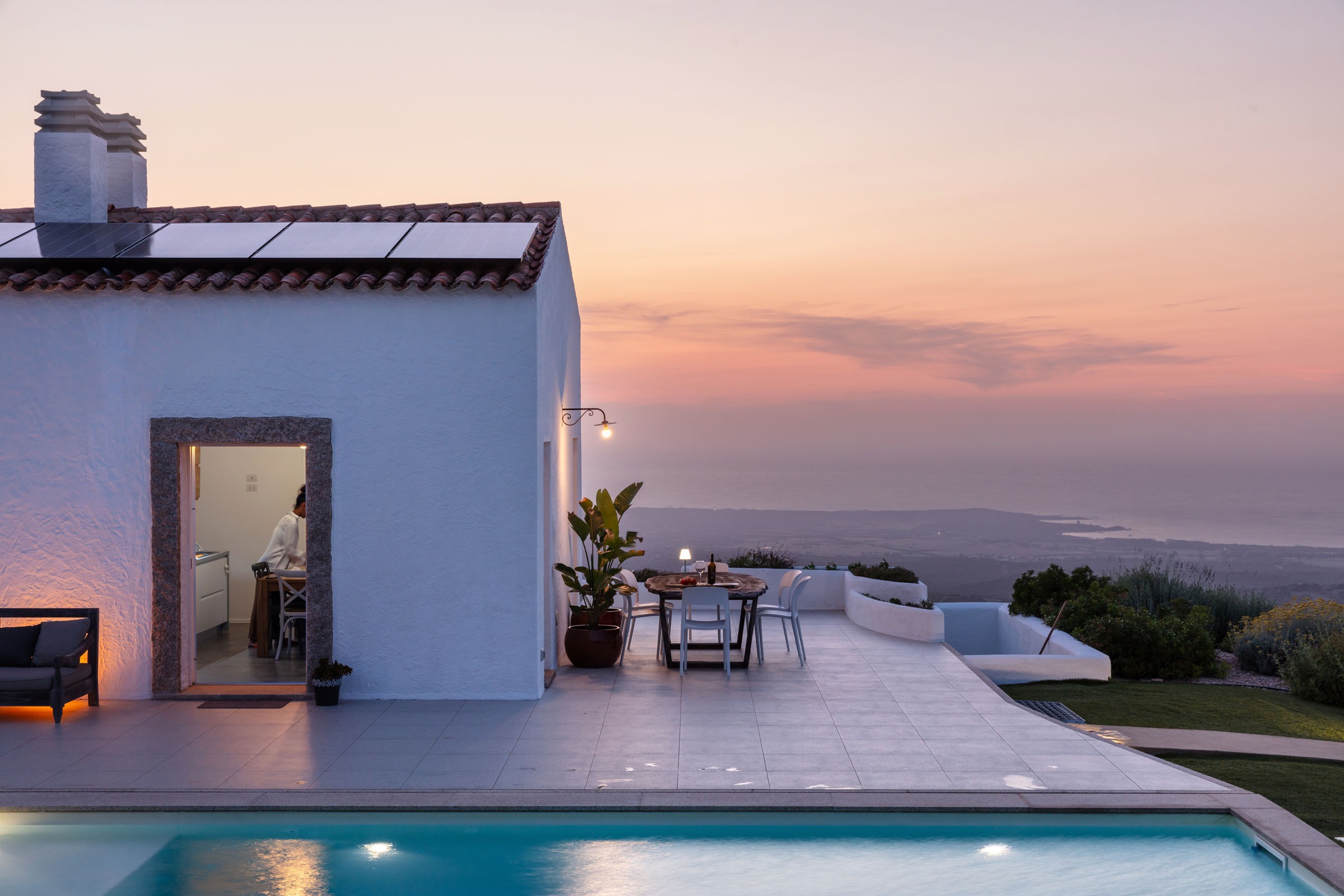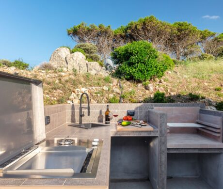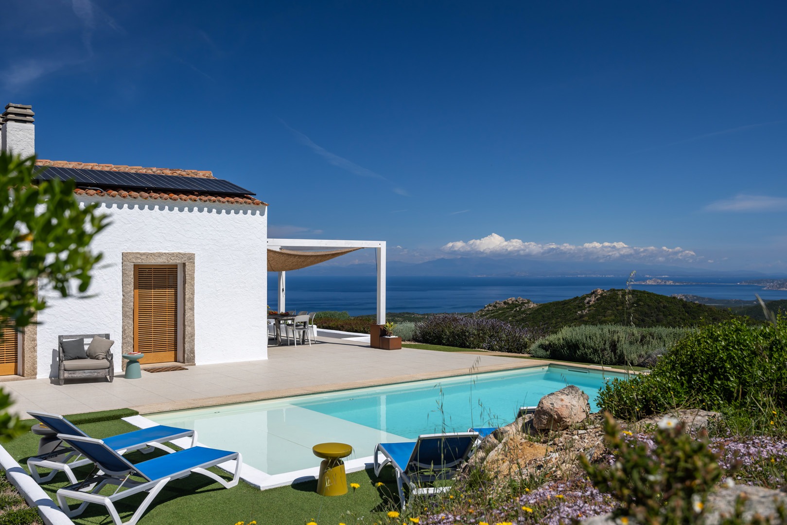 Na zewnątrz znajduje się wyjątkowa strefa relaksu z basenem zaprojektowanym tak, aby zapewnić maksymalne nasłonecznienie i ochronę przed wiatrem. Z basenu oraz ogrodu rozciąga się spektakularny widok na północne wybrzeże Sardynii, obejmujący m.in. wyspę Asinara, Capo Testa oraz klify Bonifacio na Korsyce. Na zewnątrz znajduje się również kuchnia z grillem.