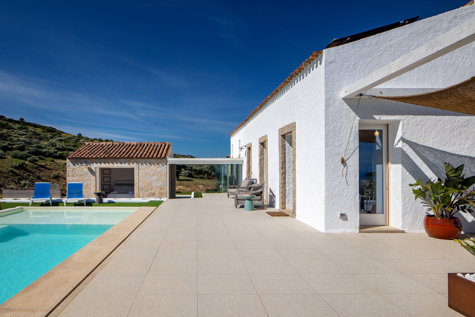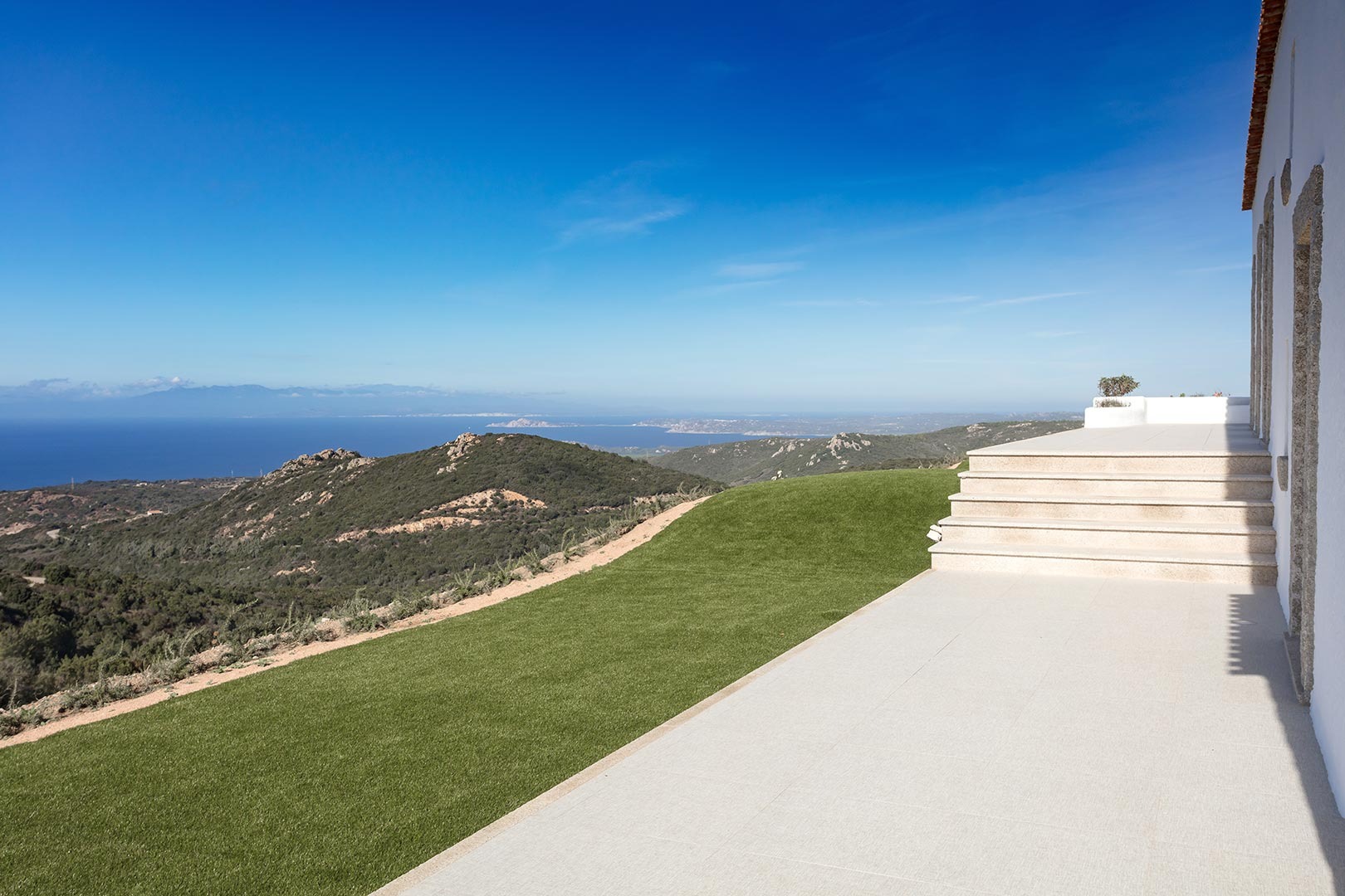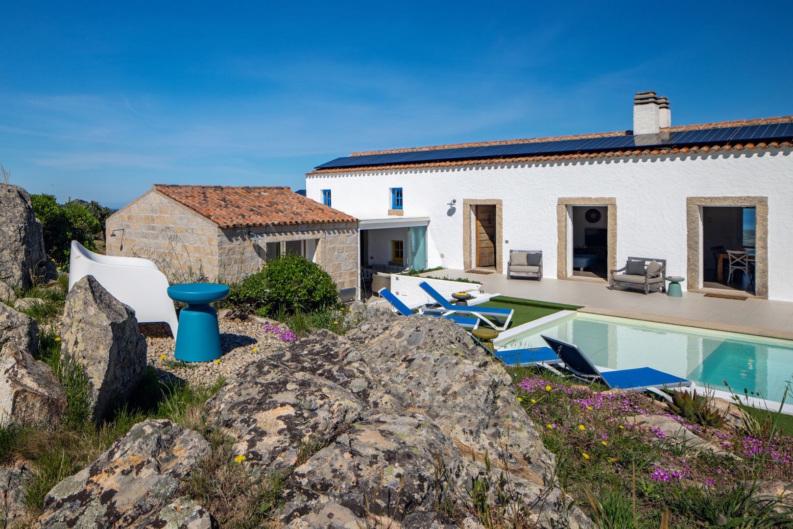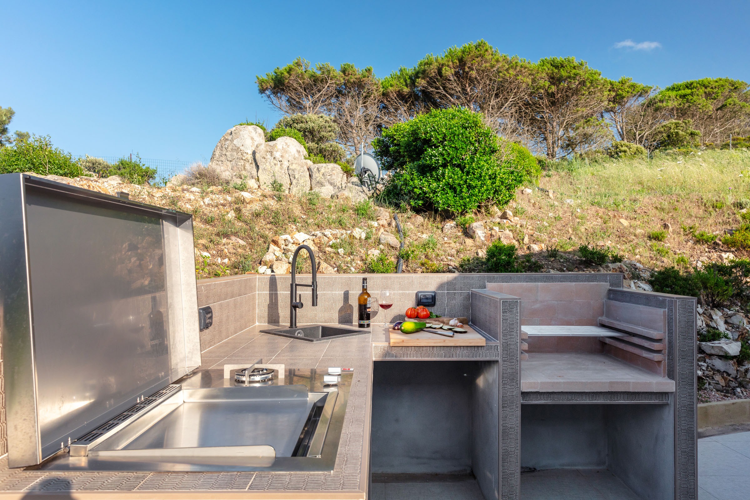 Na zewnątrz znajduje się wyjątkowa strefa relaksu z basenem zaprojektowanym tak, aby zapewnić maksymalne nasłonecznienie i ochronę przed wiatrem. Z basenu oraz ogrodu rozciąga się spektakularny widok na północne wybrzeże Sardynii, obejmujący m.in. wyspę Asinara, Capo Testa oraz klify Bonifacio na Korsyce. Na zewnątrz znajduje się również kuchnia z grillem.