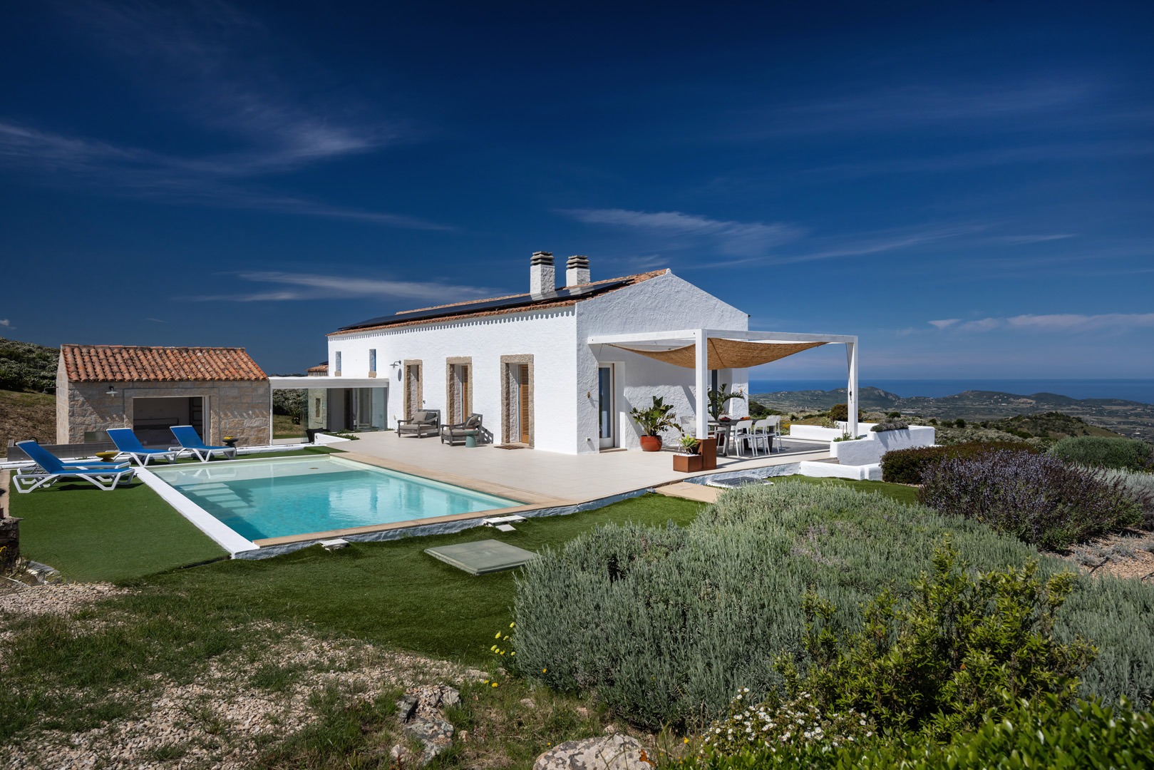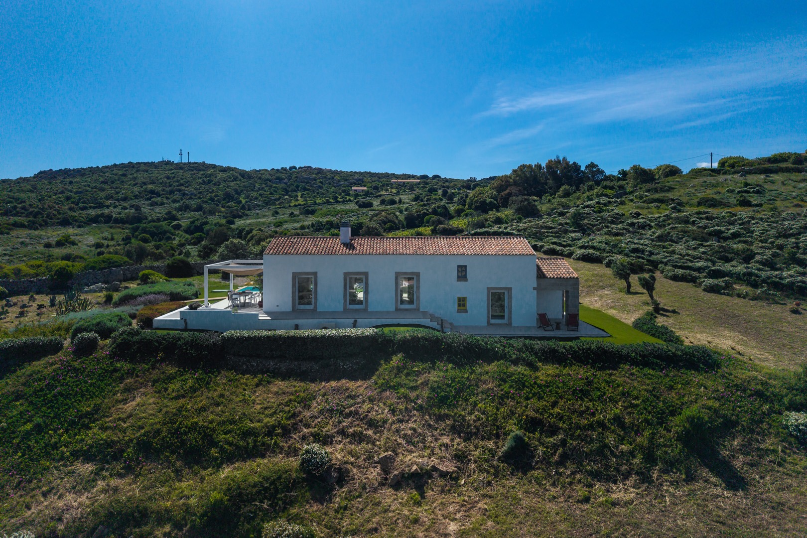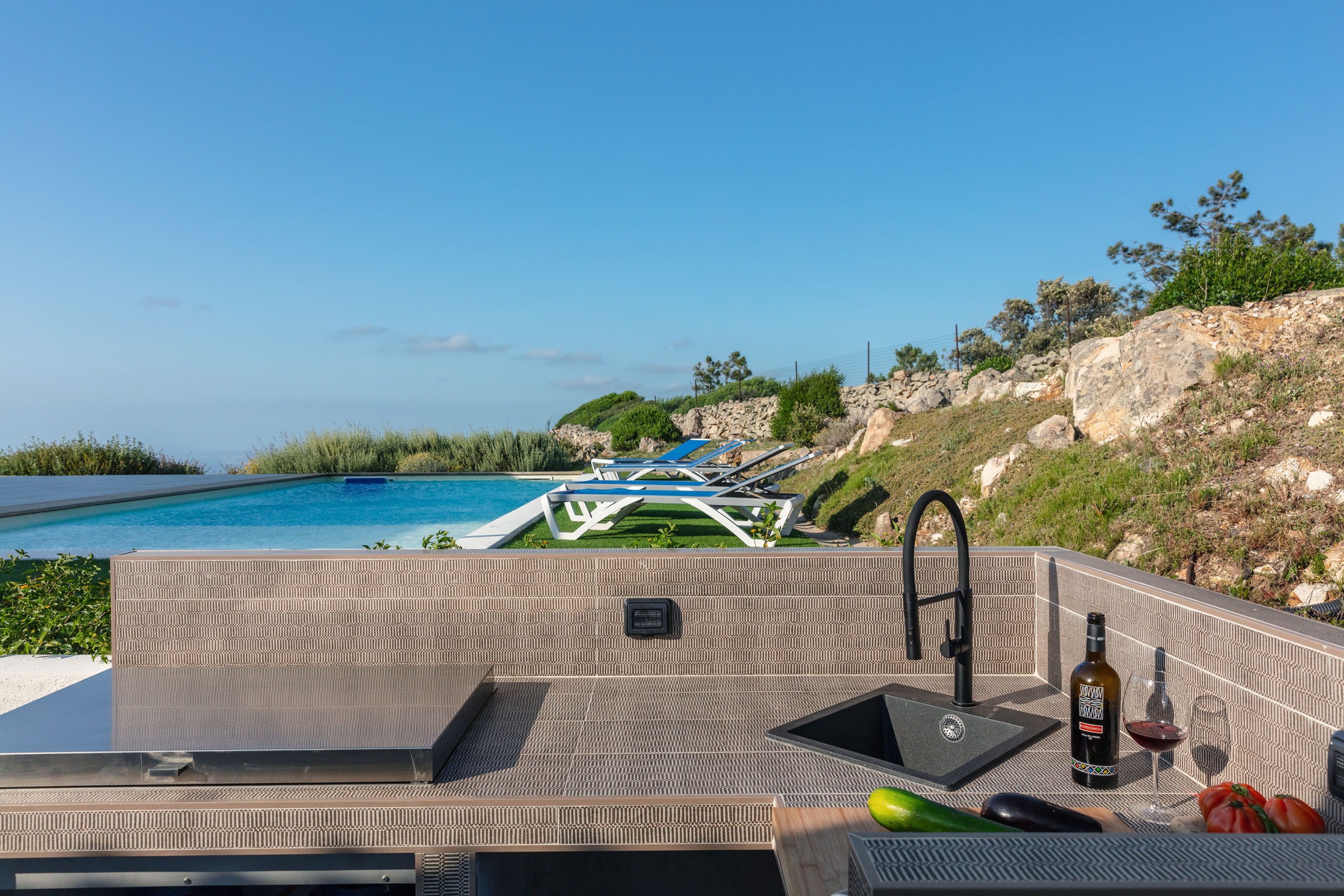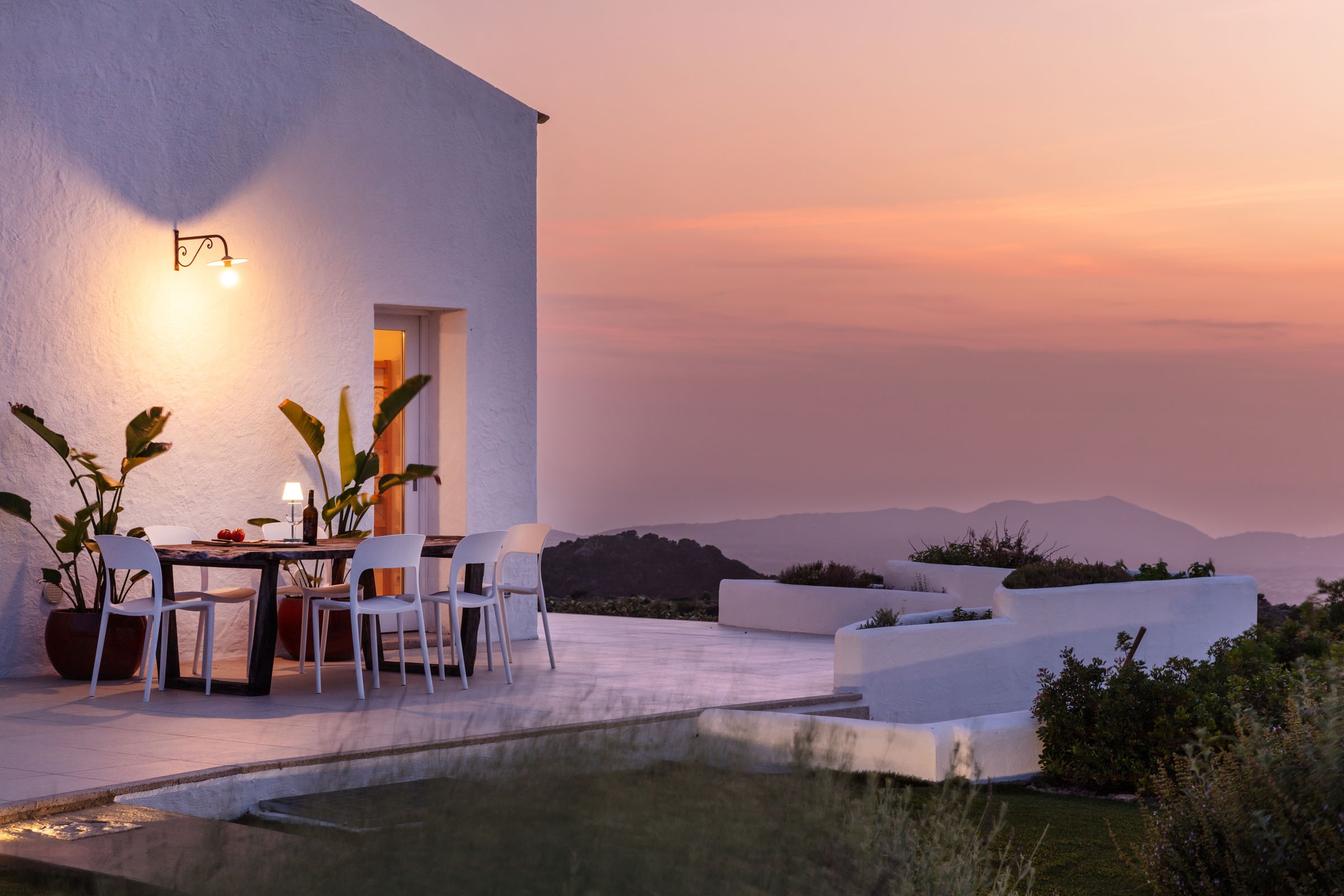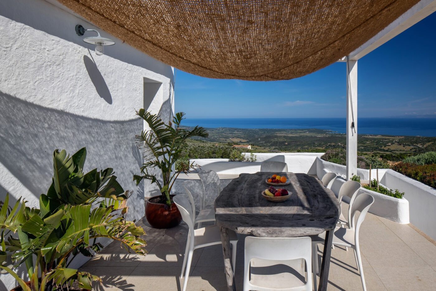Na zewnątrz znajduje się wyjątkowa strefa relaksu z basenem zaprojektowanym tak, aby zapewnić maksymalne nasłonecznienie i ochronę przed wiatrem. Z basenu oraz ogrodu rozciąga się spektakularny widok na północne wybrzeże Sardynii, obejmujący m.in. wyspę Asinara, Capo Testa oraz klify Bonifacio na Korsyce. Na zewnątrz znajduje się również kuchnia z grillem.