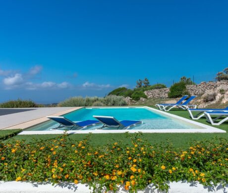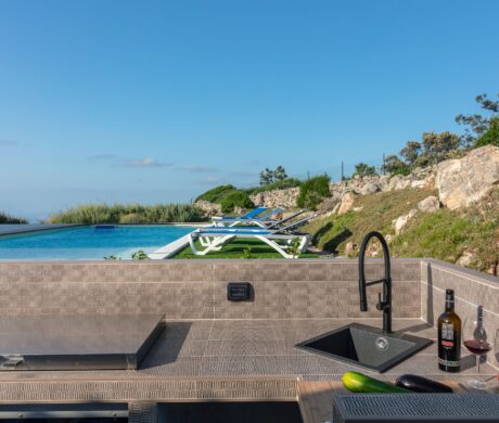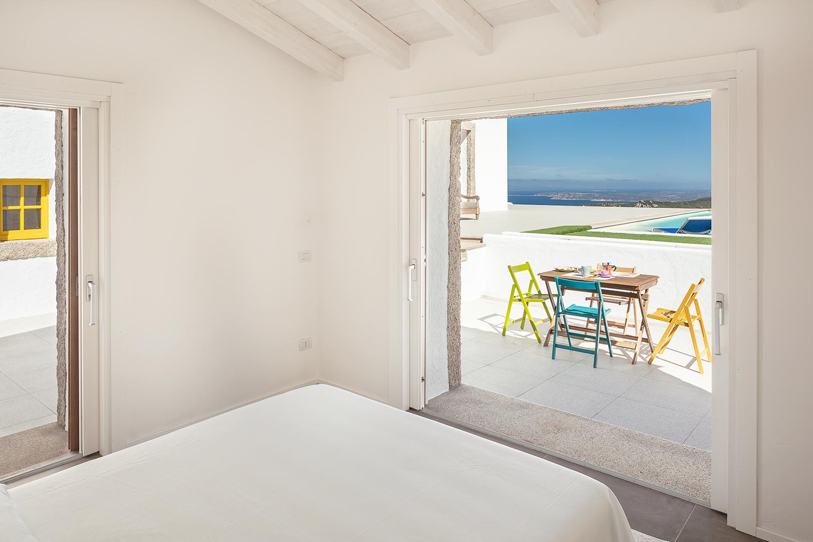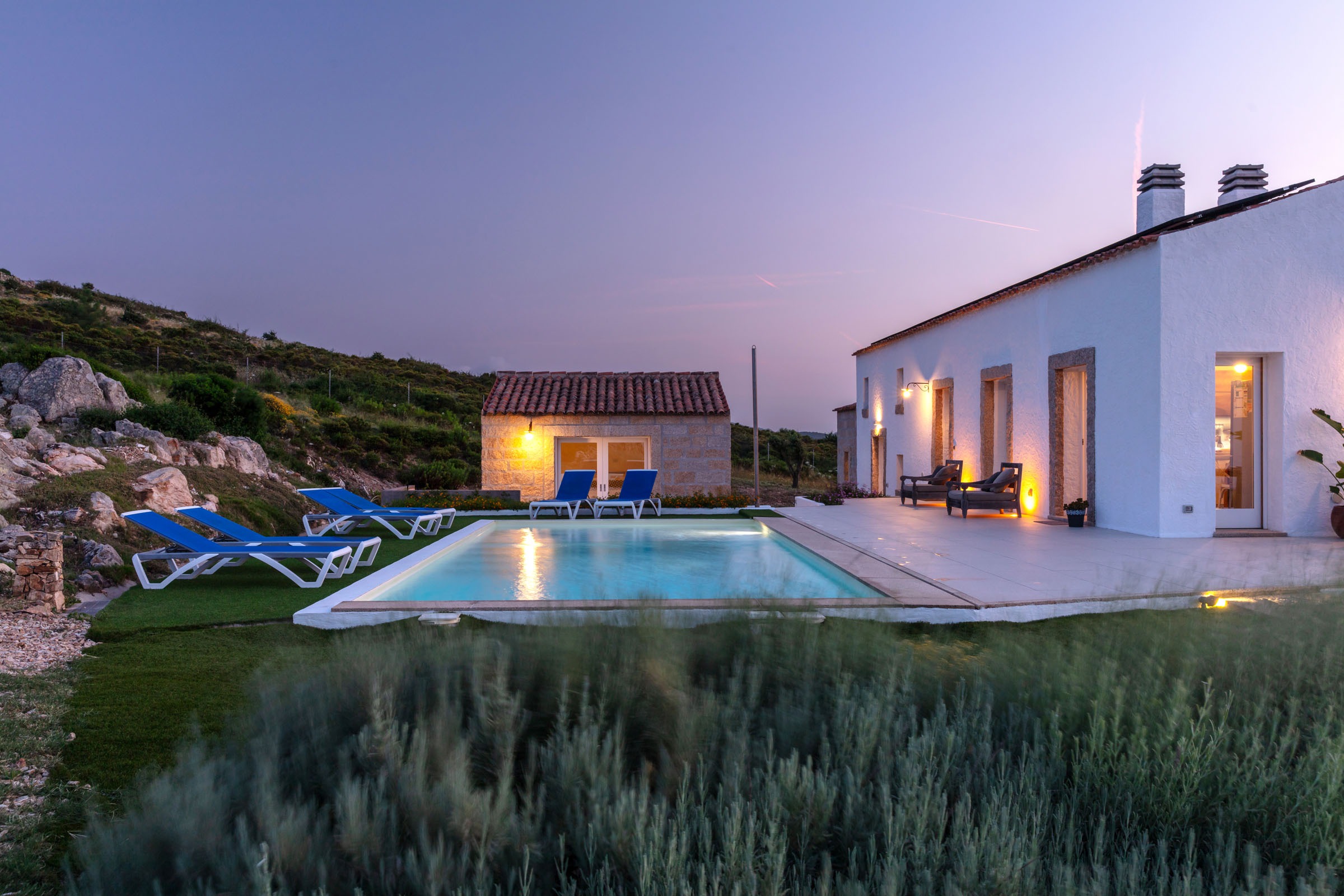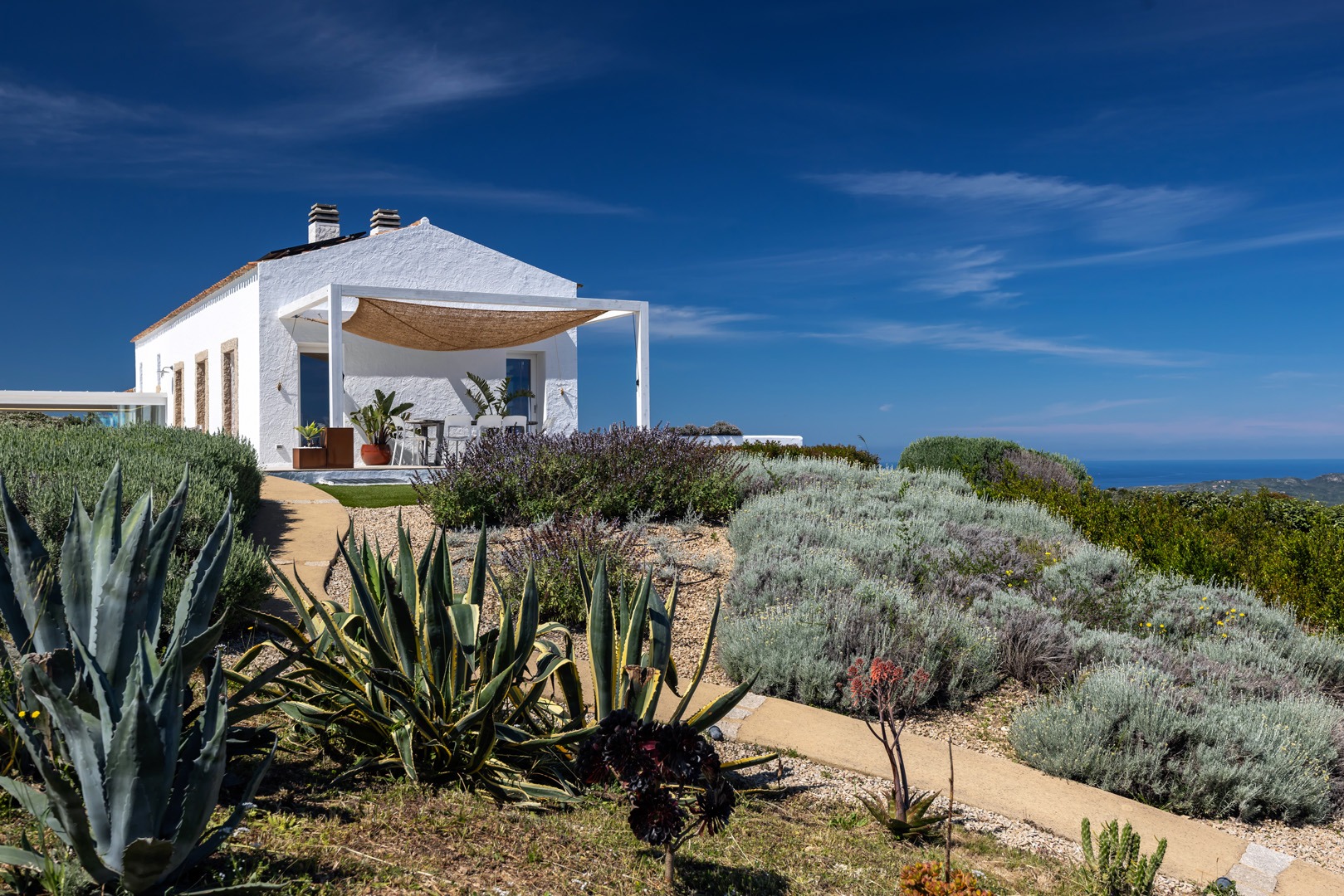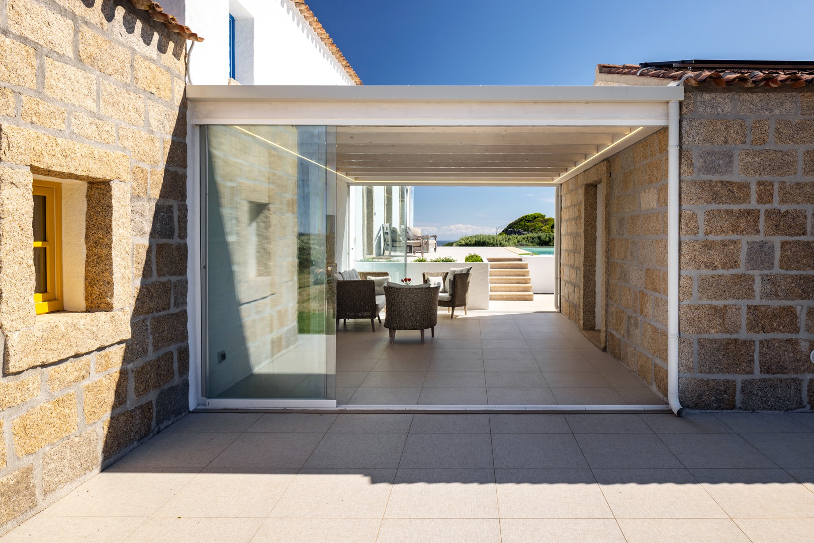 Na zewnątrz znajduje się wyjątkowa strefa relaksu z basenem zaprojektowanym tak, aby zapewnić maksymalne nasłonecznienie i ochronę przed wiatrem. Z basenu oraz ogrodu rozciąga się spektakularny widok na północne wybrzeże Sardynii, obejmujący m.in. wyspę Asinara, Capo Testa oraz klify Bonifacio na Korsyce. Na zewnątrz znajduje się również kuchnia z grillem.