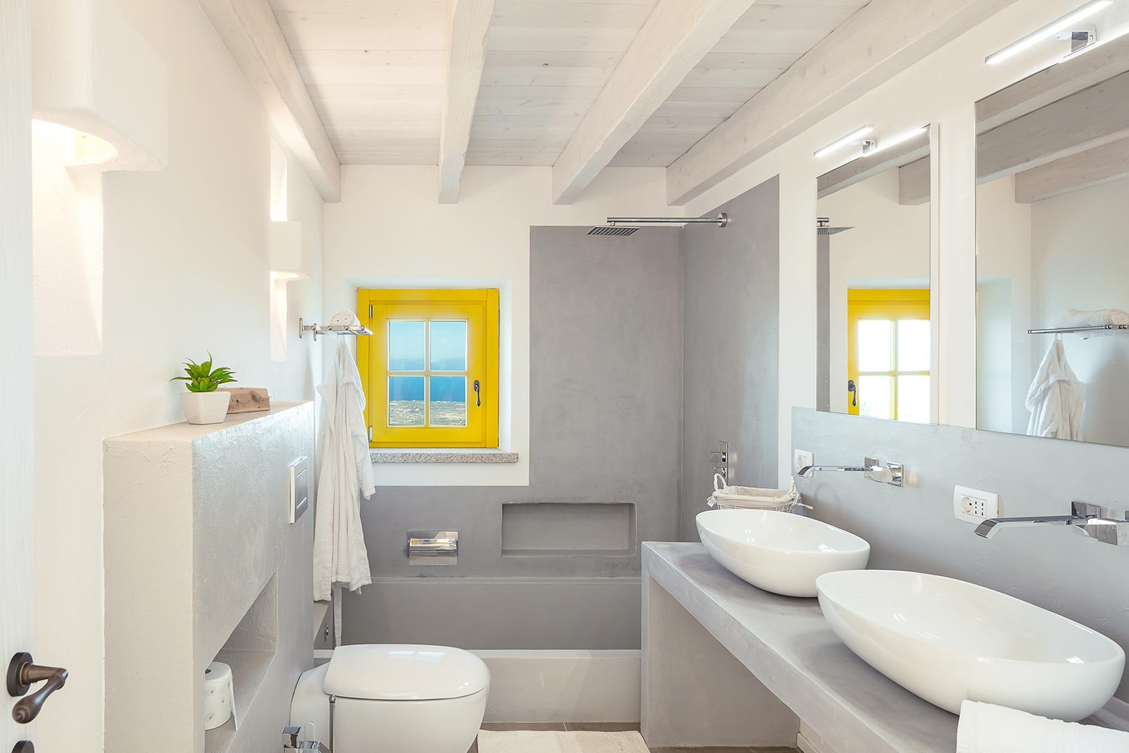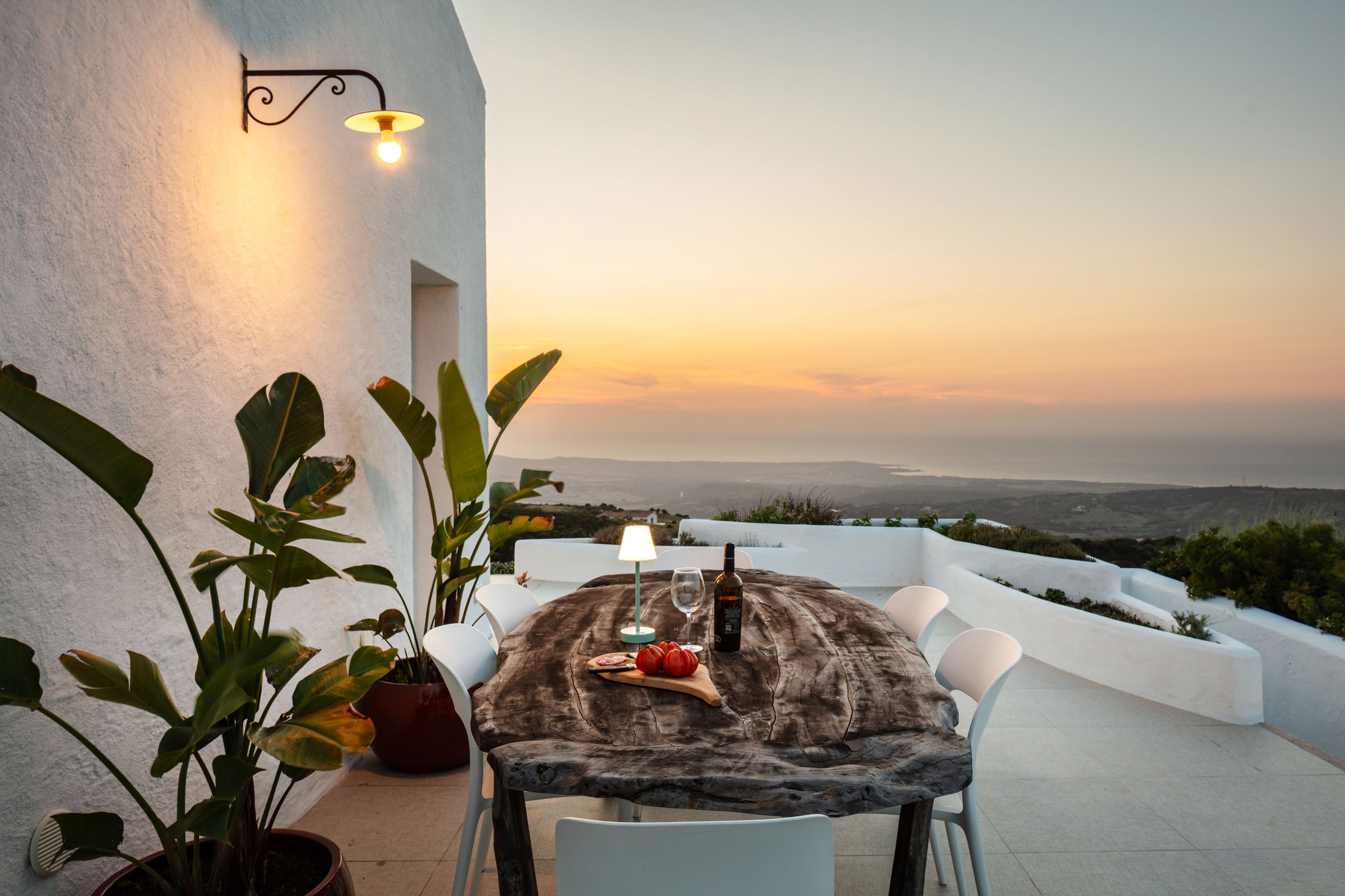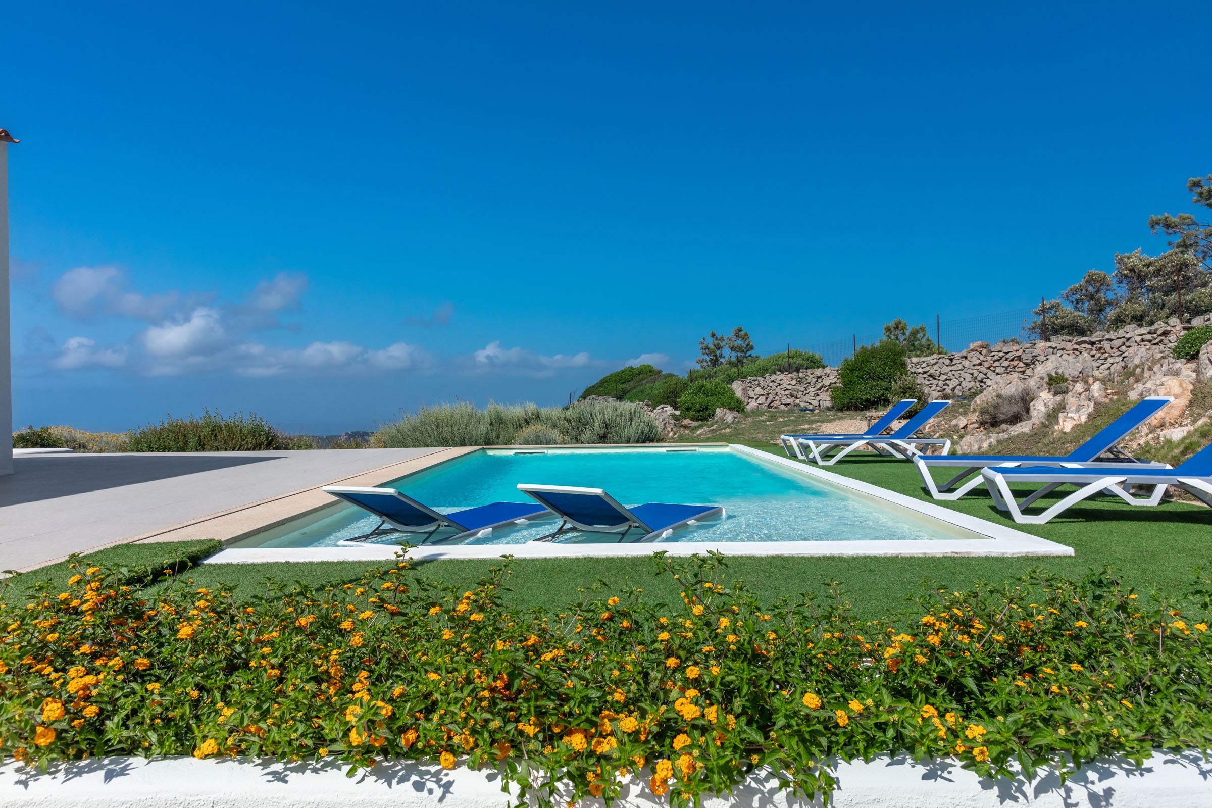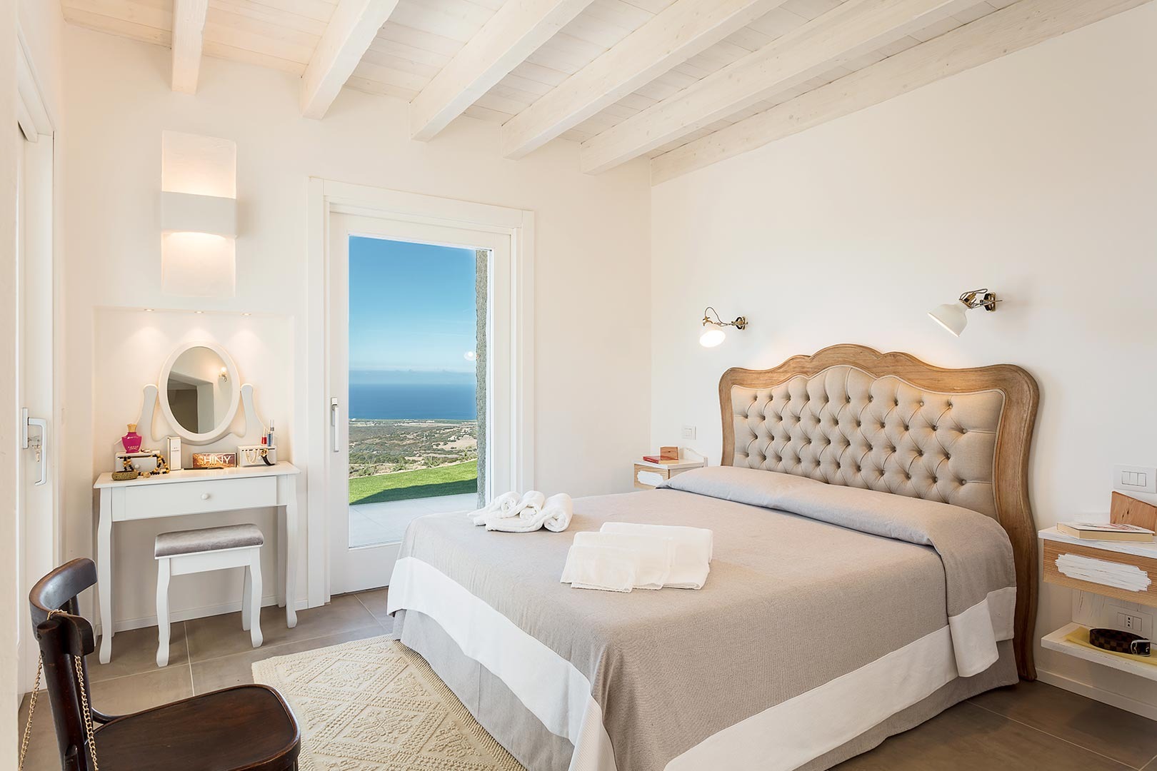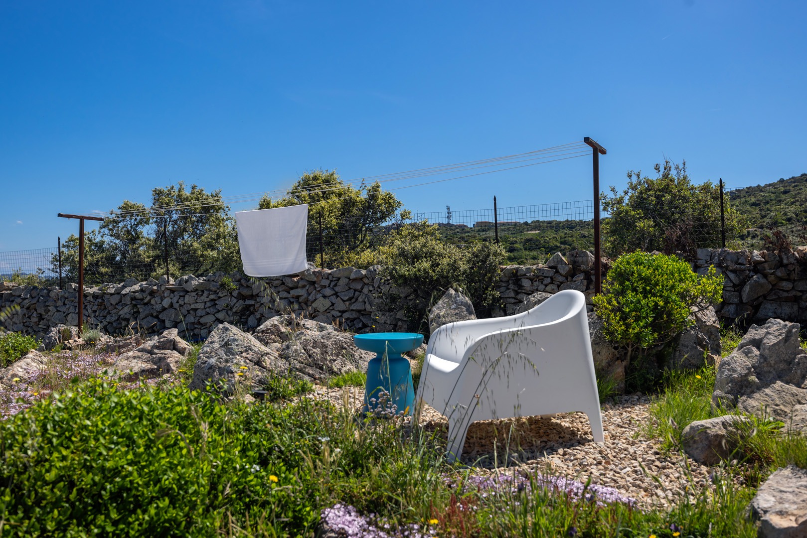 Na zewnątrz znajduje się wyjątkowa strefa relaksu z basenem zaprojektowanym tak, aby zapewnić maksymalne nasłonecznienie i ochronę przed wiatrem. Z basenu oraz ogrodu rozciąga się spektakularny widok na północne wybrzeże Sardynii, obejmujący m.in. wyspę Asinara, Capo Testa oraz klify Bonifacio na Korsyce. Na zewnątrz znajduje się również kuchnia z grillem.