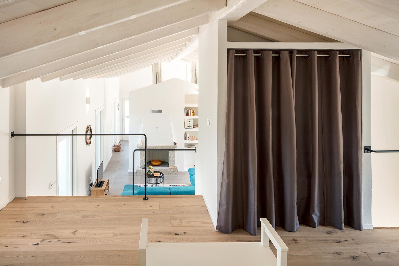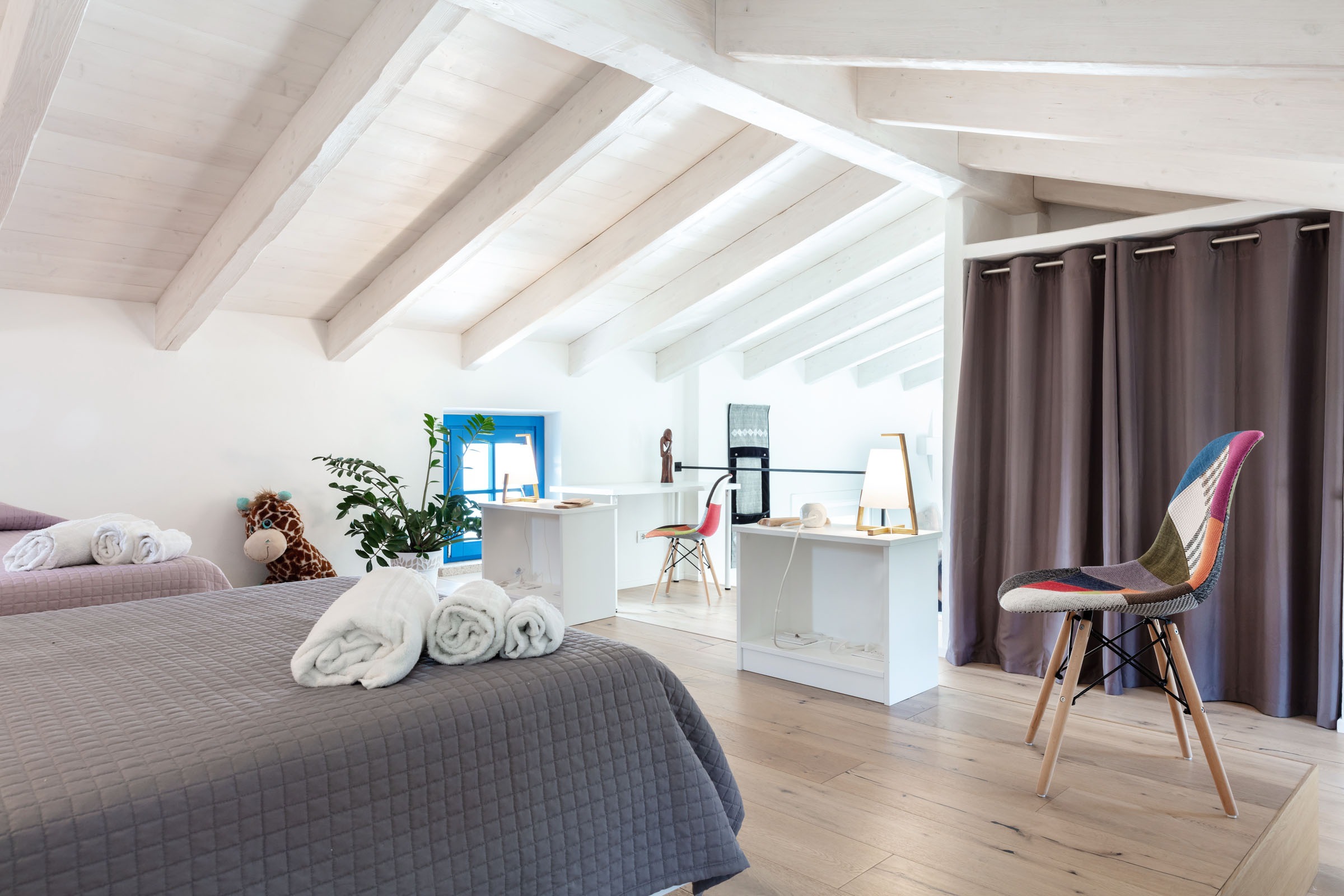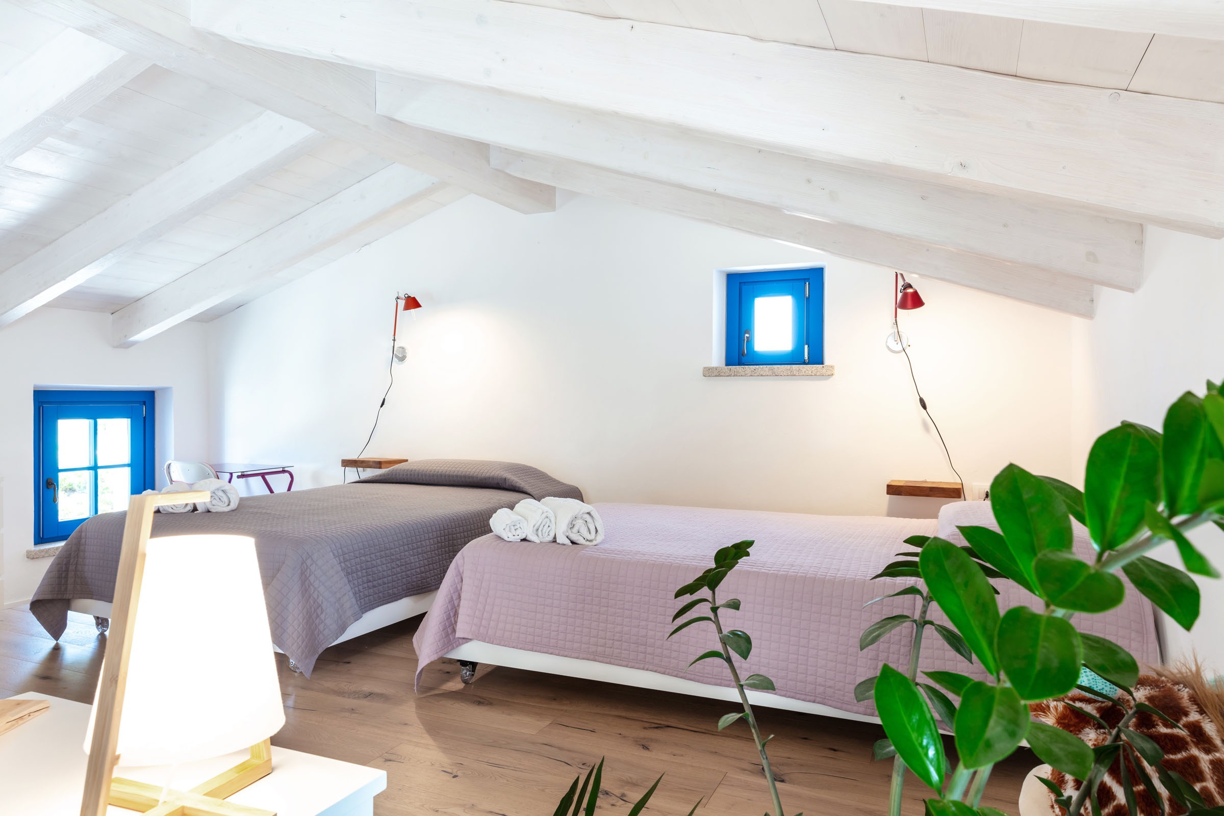 Dom składa się z dwóch brył tworzących zaciszne, osłonięte patio, w którym znajduje się strefa basenowa i relaksacyjna. Wnętrza są przestronne i pełne światła – znajdziecie tu komfortowy salon, w pełni wyposażoną kuchnię oraz elegancko zaaranżowane przestrzenie wypoczynkowe. Willa oferuje dwie sypialnie dwuosobowe oraz wyjątkową, dużą antresolę z dodatkowymi miejscami do spania. Do dyspozycji gości są także dwie łazienki, w tym jedna o dużych rozmiarach, wyposażona w mini basen.