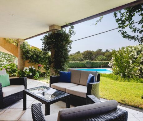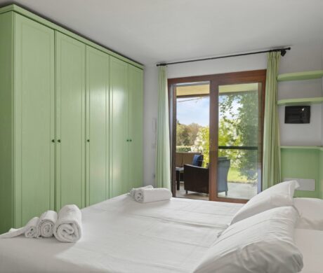 Na parterze mieszczą się dwie sypialnie dwuosobowe oraz dodatkowy pokój z dwoma łóżkami pojedynczymi. Wnętrza utrzymane są w spokojnej kolorystyce inspirowanej naturą wyspy, a ręcznie wykonane elementy wyposażenia nadają im autentyczny charakter. Do dyspozycji gości jest również druga łazienka. Na zewnątrz czeka przestronny ogród z zadbanym trawnikiem oraz roślinnością śródziemnomorską. Wspólny basen typu infinity z hydromasażem stanowi idealne miejsce na relaks w ciągu dnia.