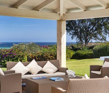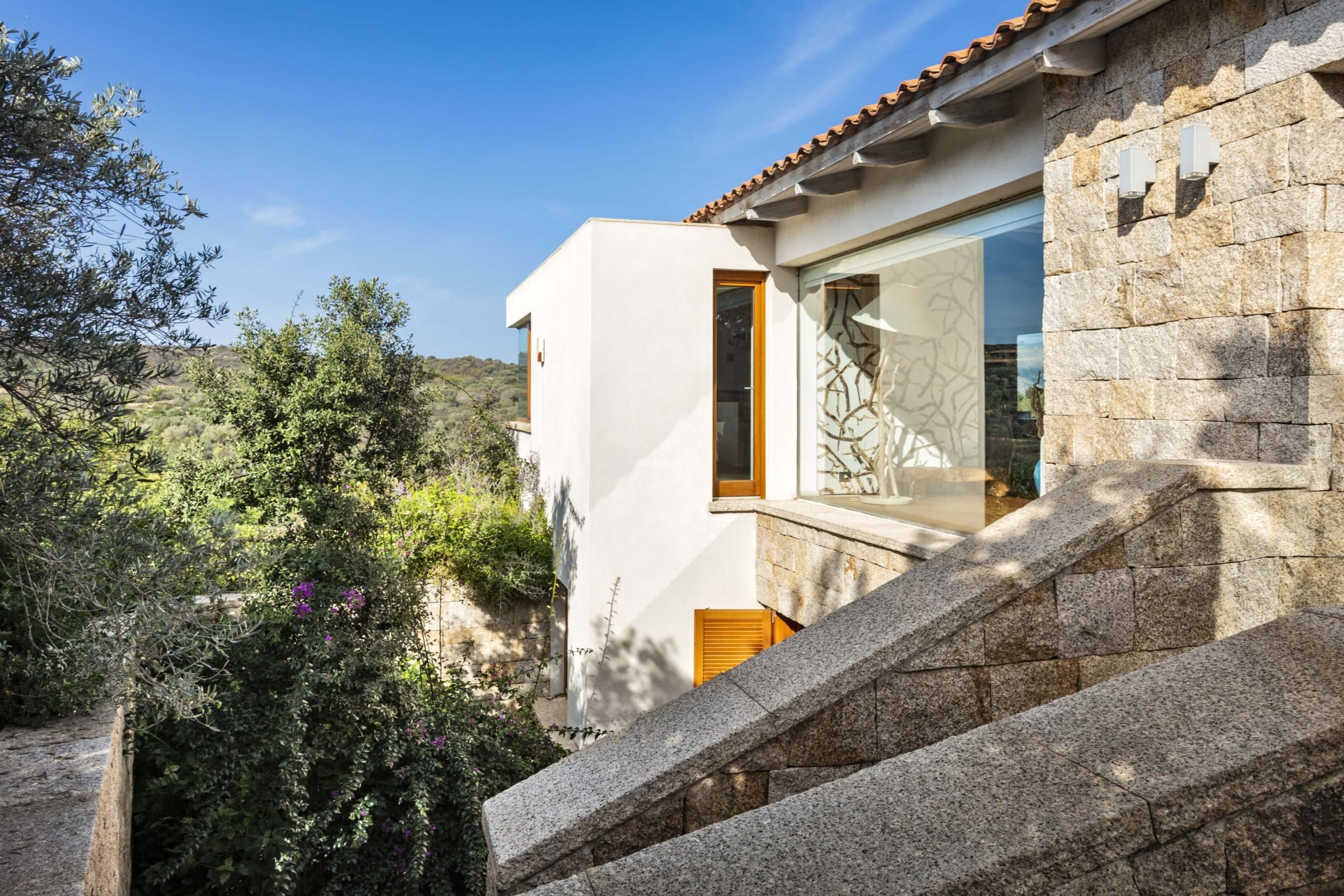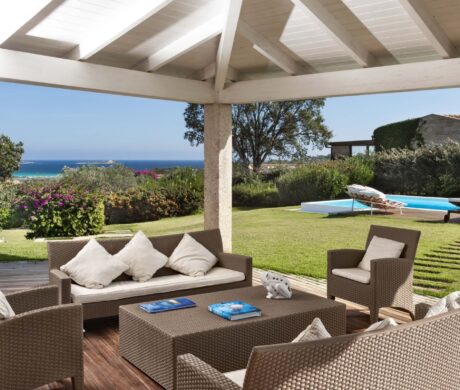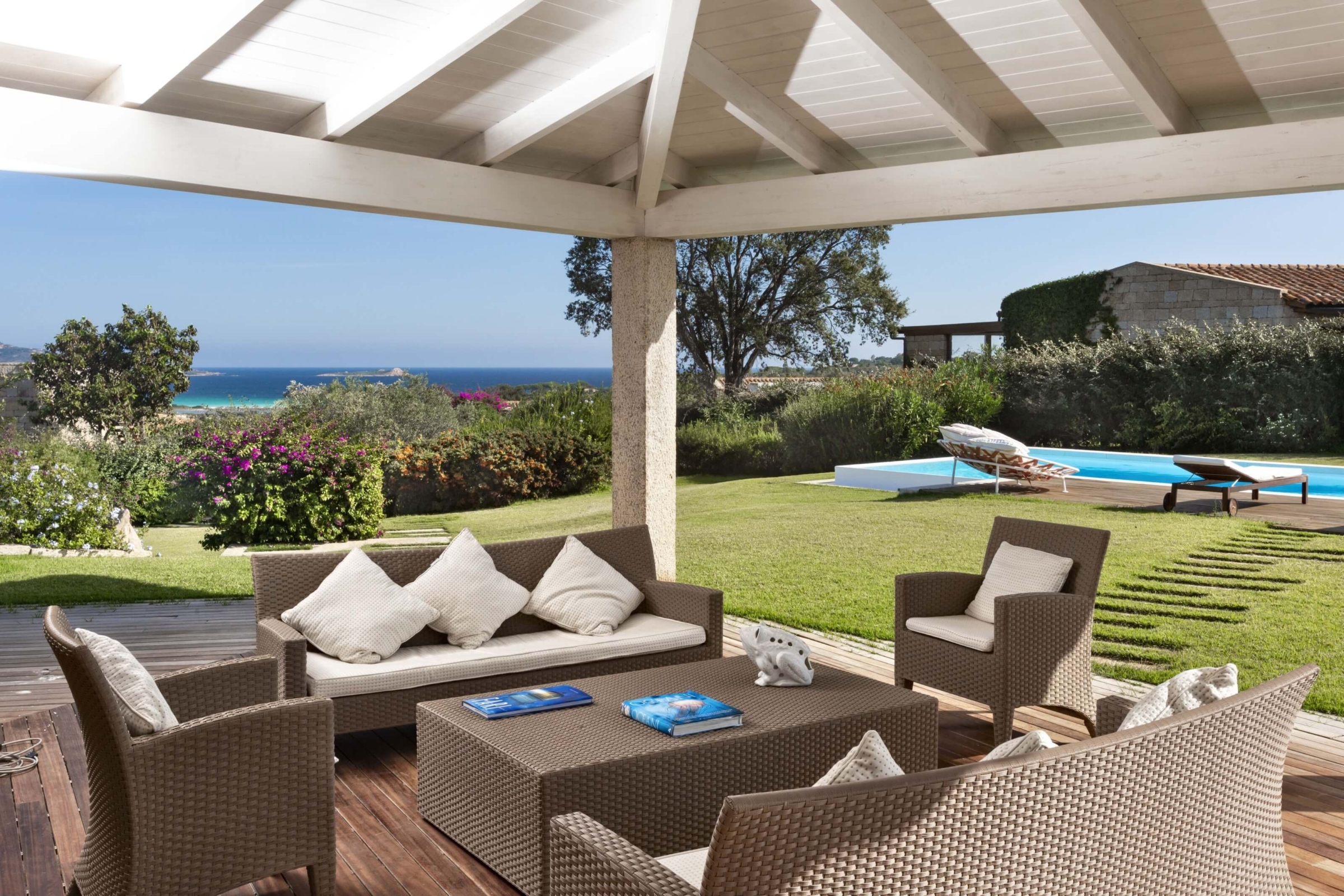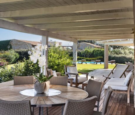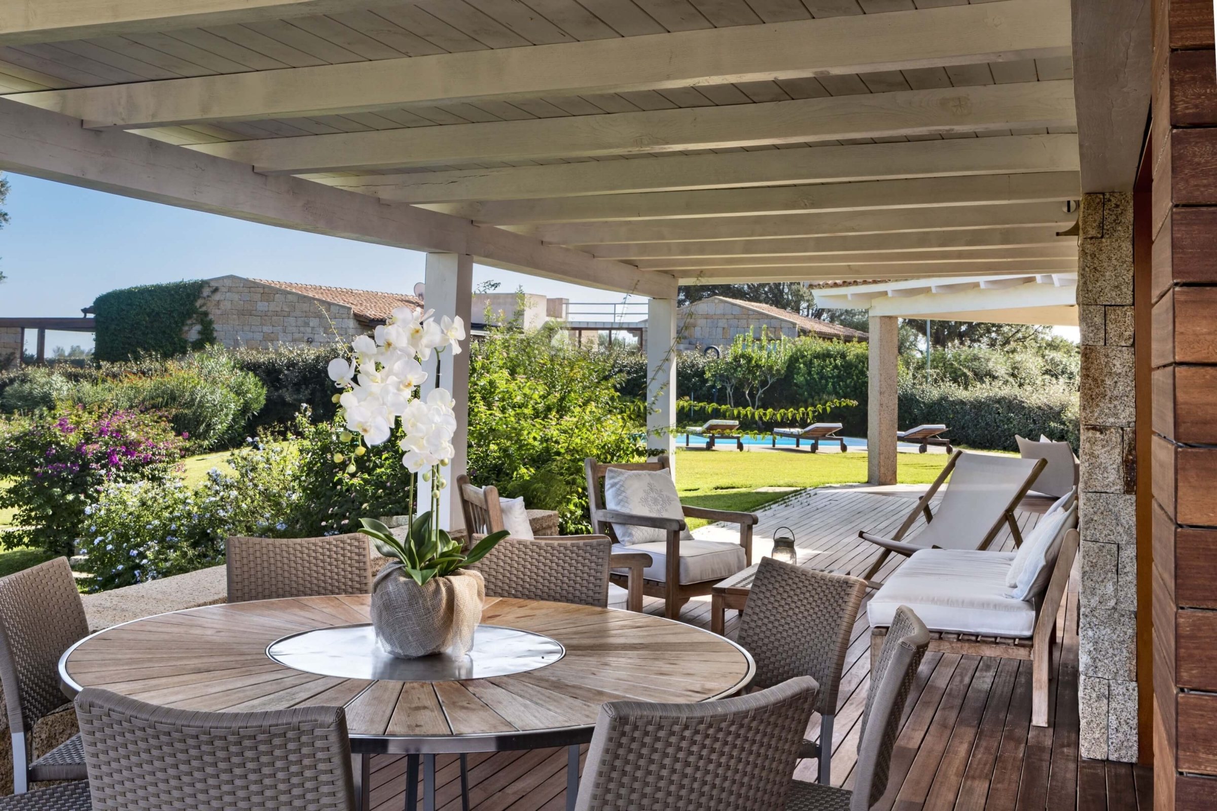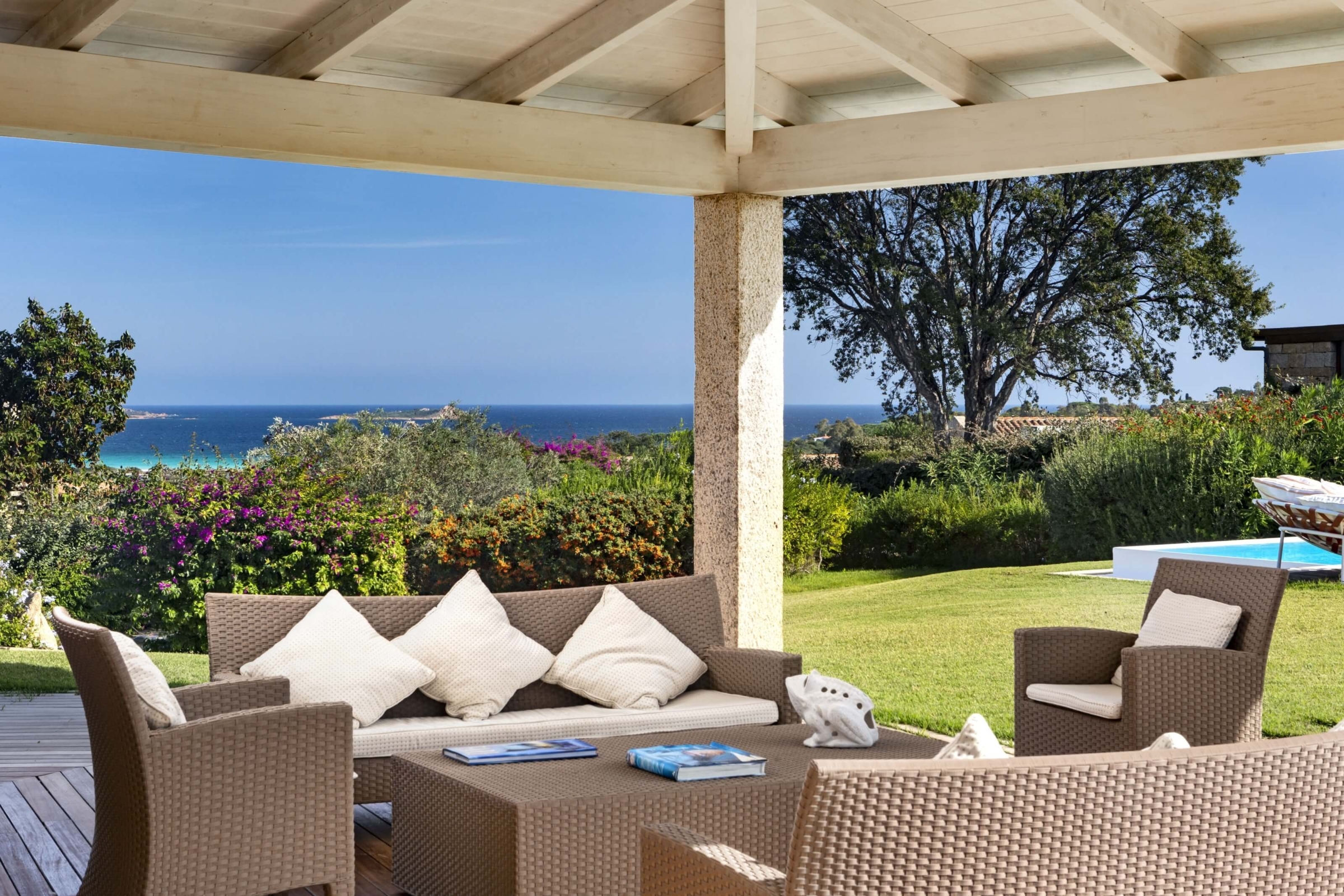 Na zewnątrz znajduje się duża weranda, która otacza willę z trzech stron – jest to fantastyczne miejsce na aperitif lub kolację w gronie najbliższych. Podgrzewany basen z leżakami zbudowany został 15 metrów od willi, rozciera się stąd widok na morze. Zadbany ogród pokryty jest miękkim trawnikiem i rodzimymi roślinami, takimi jak mirt czy drzewa oliwne, ogród ma powierzchnię około 2000 m2.
