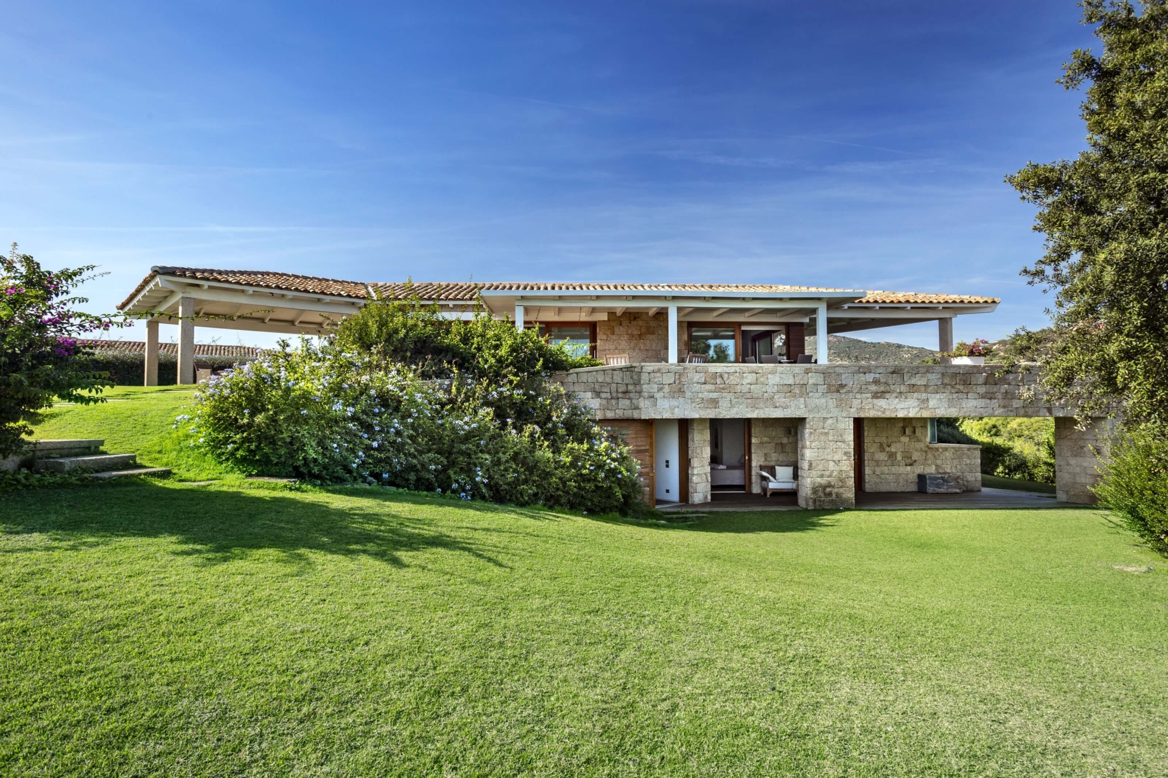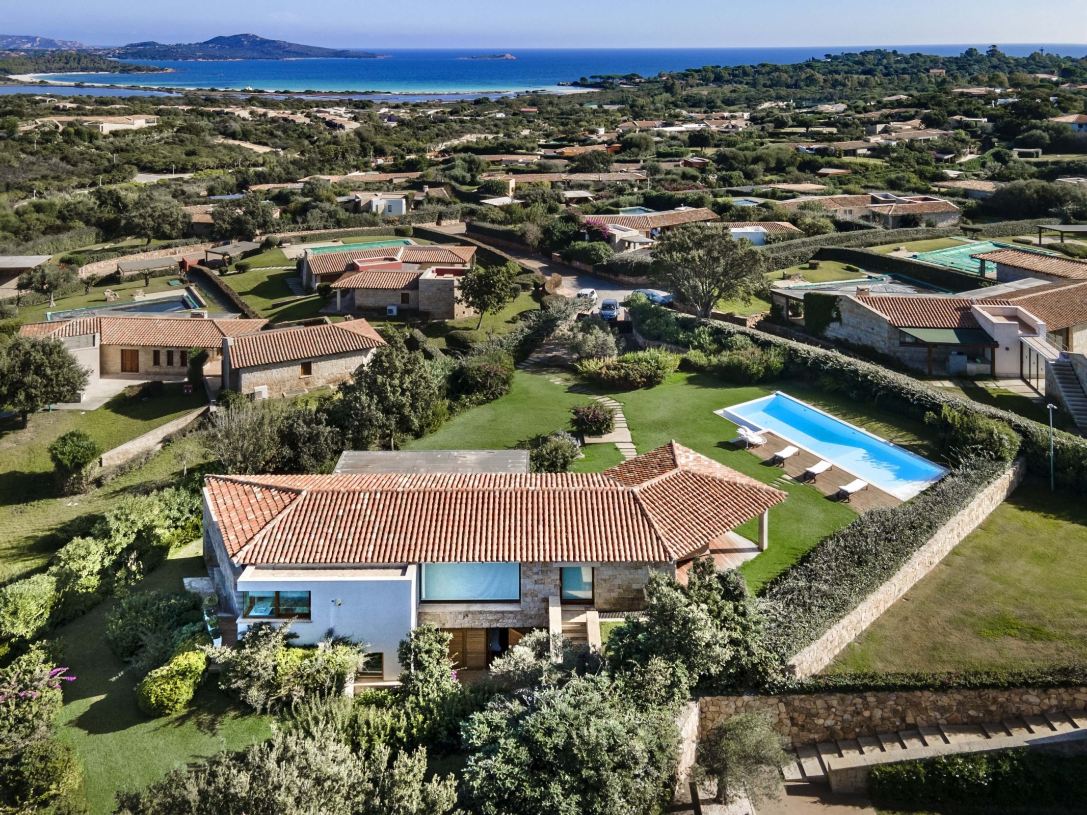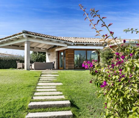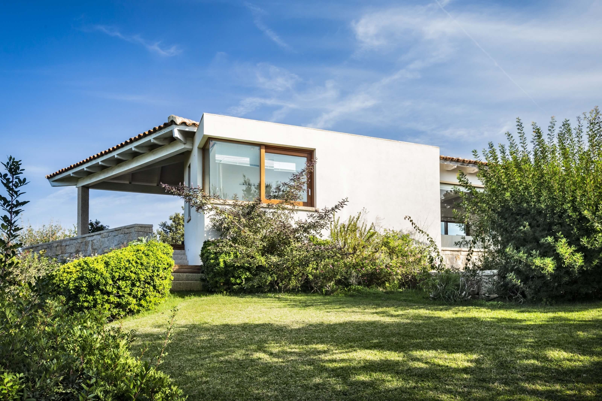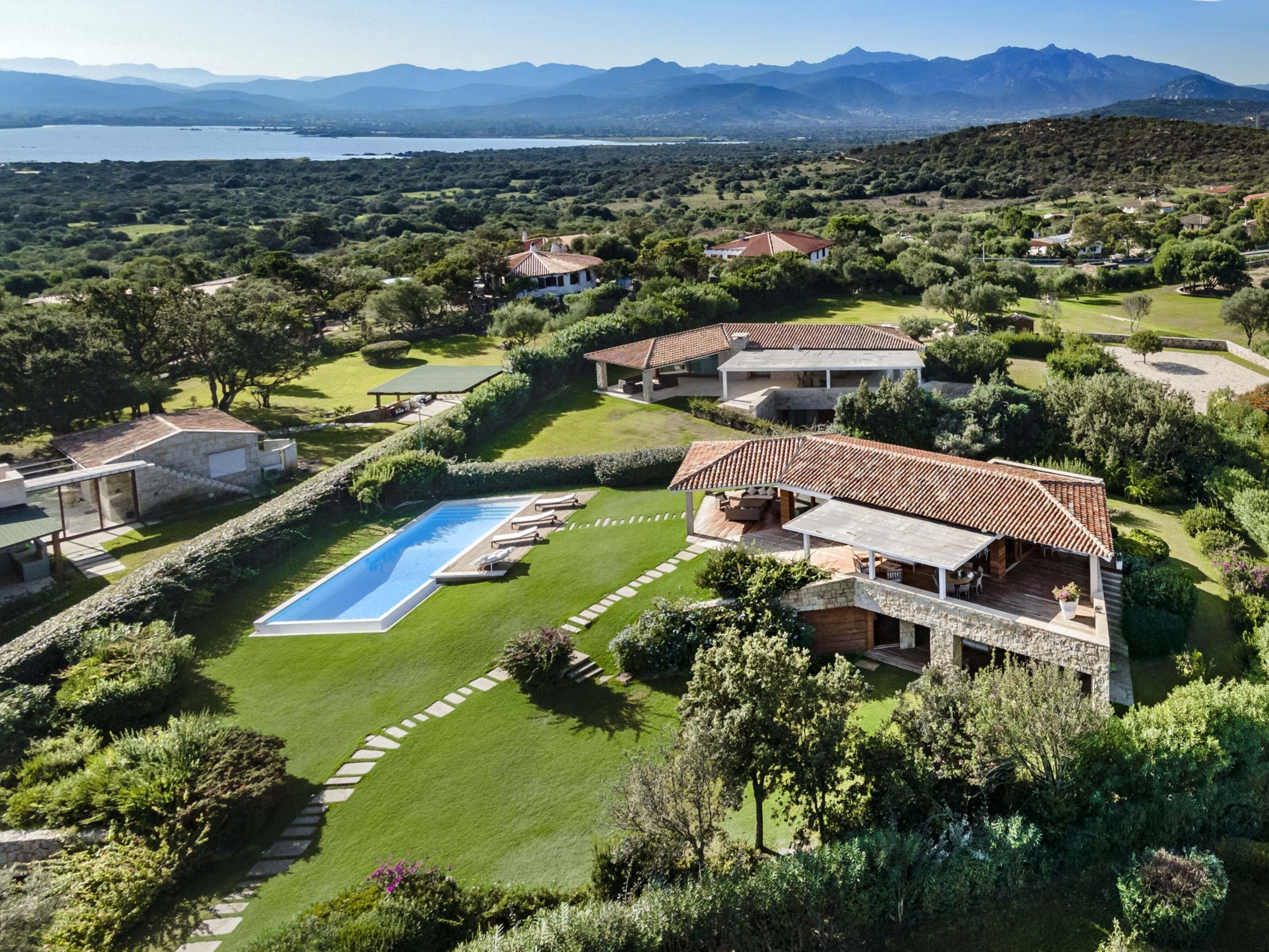 Na zewnątrz znajduje się duża weranda, która otacza willę z trzech stron – jest to fantastyczne miejsce na aperitif lub kolację w gronie najbliższych. Podgrzewany basen z leżakami zbudowany został 15 metrów od willi, rozciera się stąd widok na morze. Zadbany ogród pokryty jest miękkim trawnikiem i rodzimymi roślinami, takimi jak mirt czy drzewa oliwne, ogród ma powierzchnię około 2000 m2.
