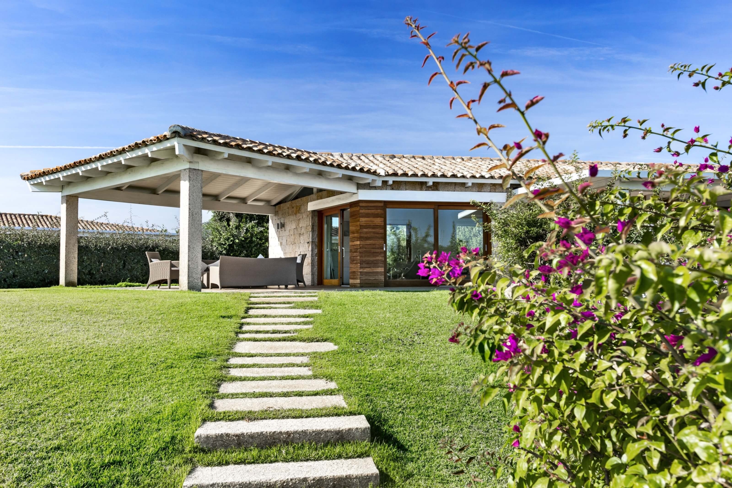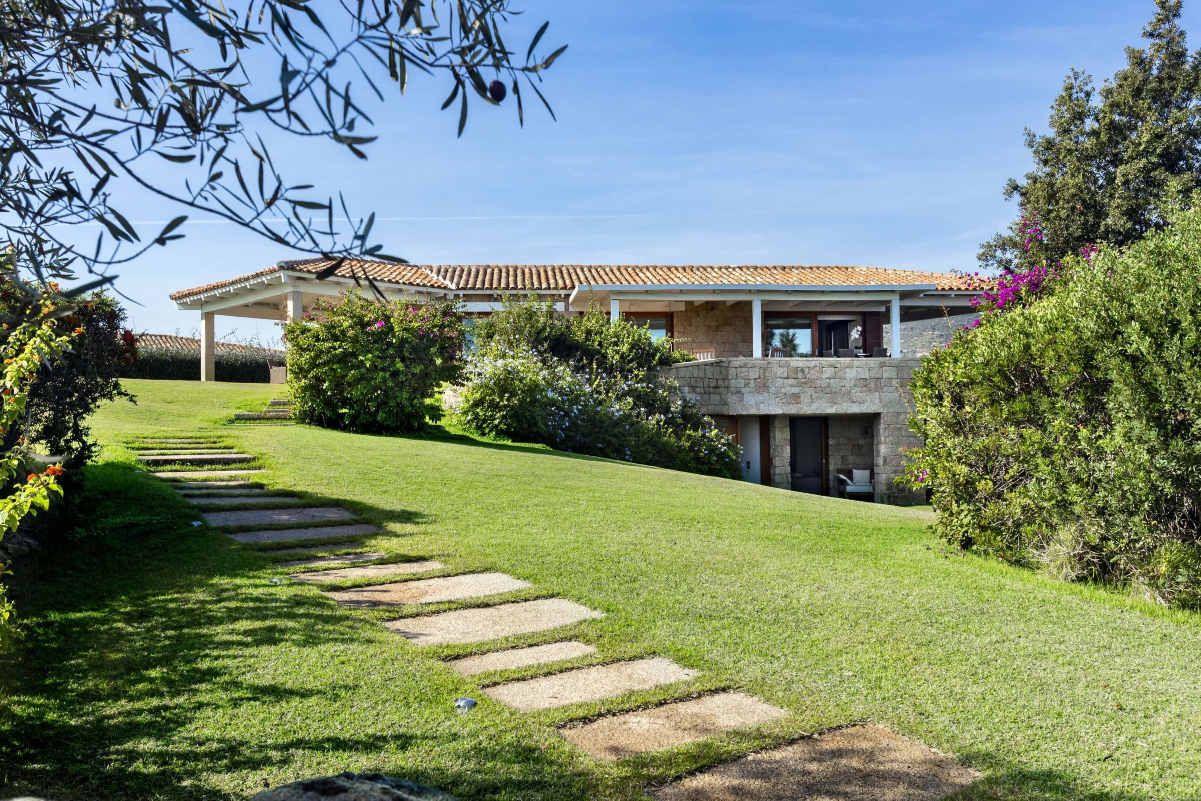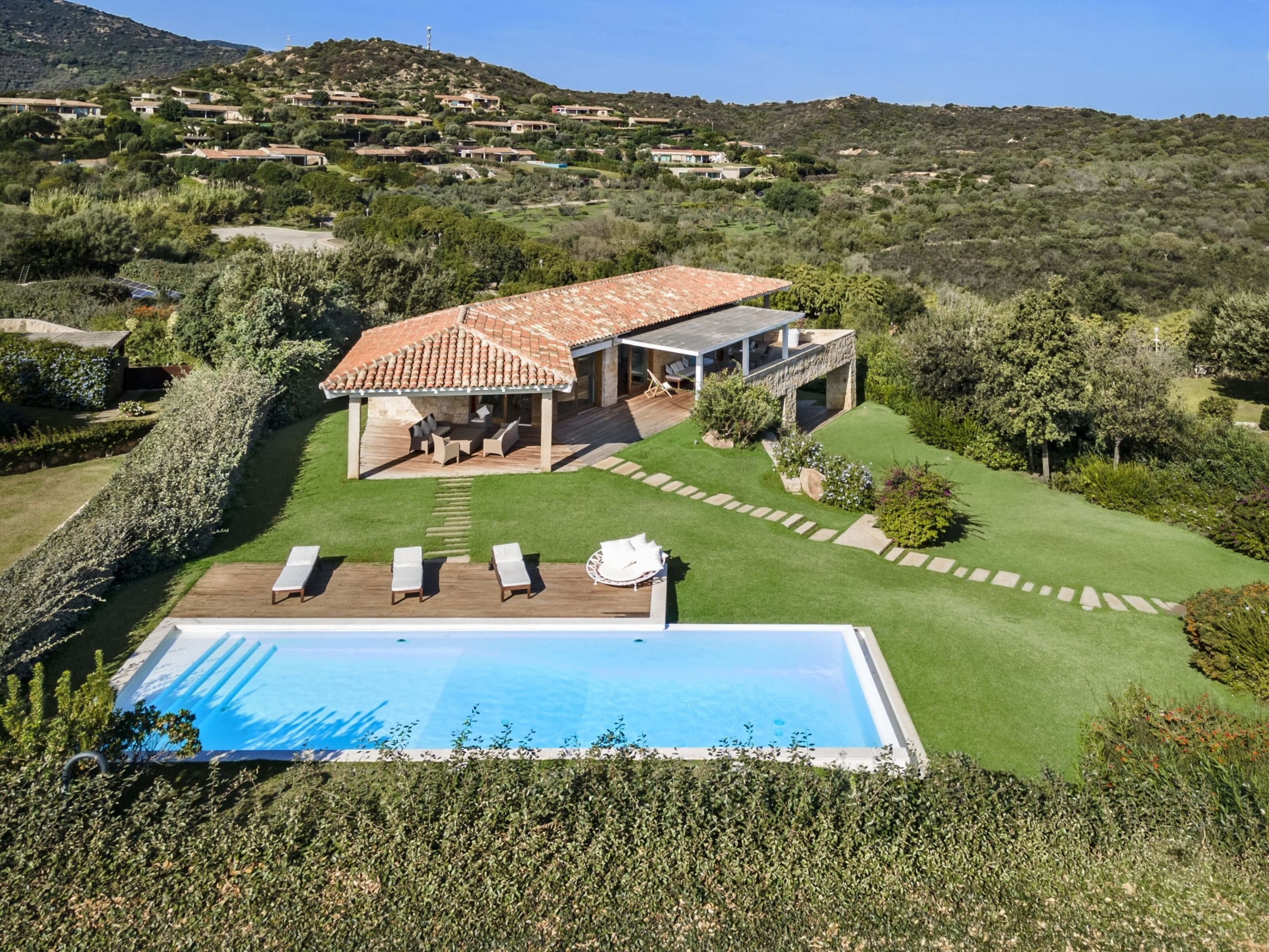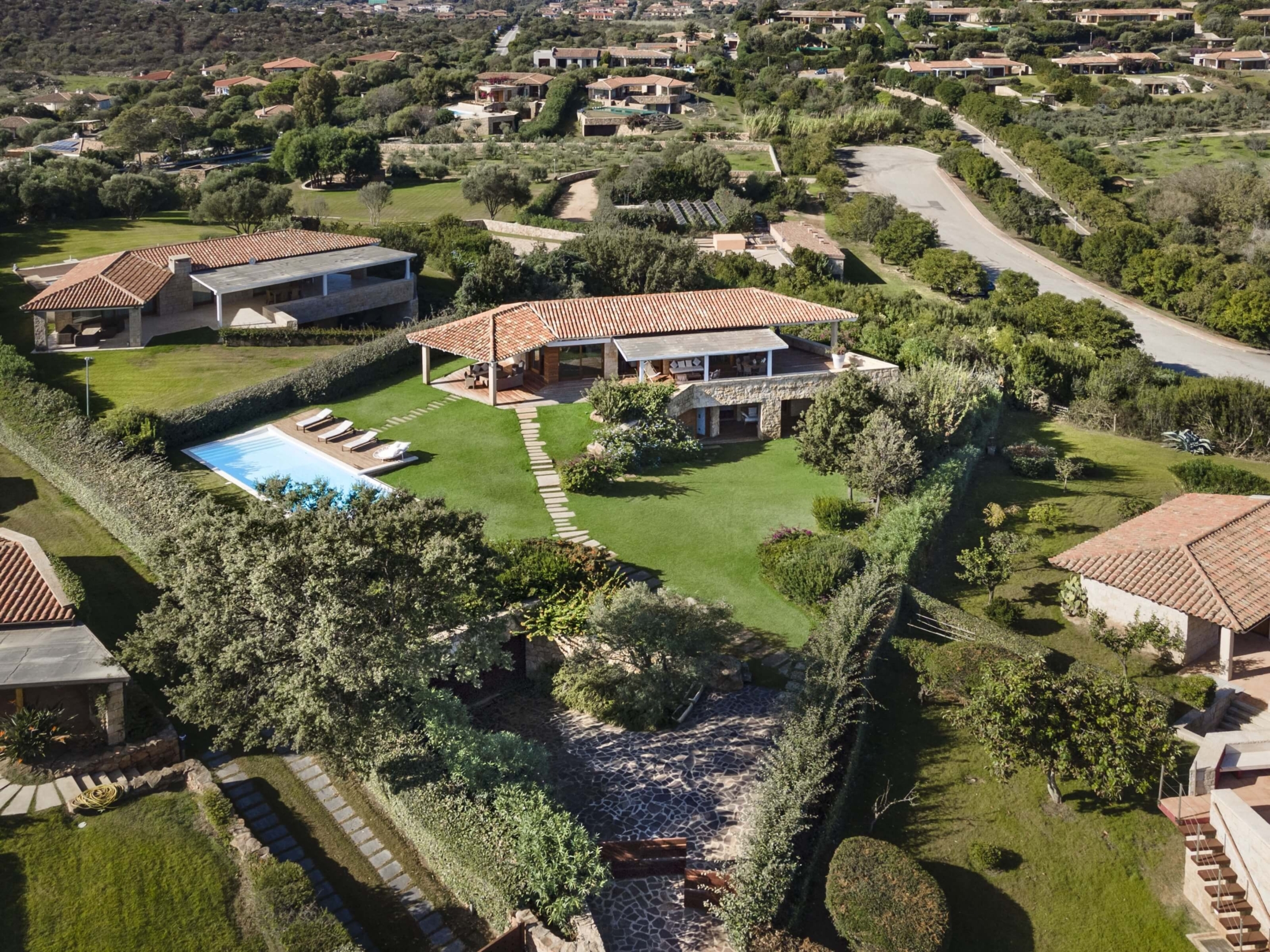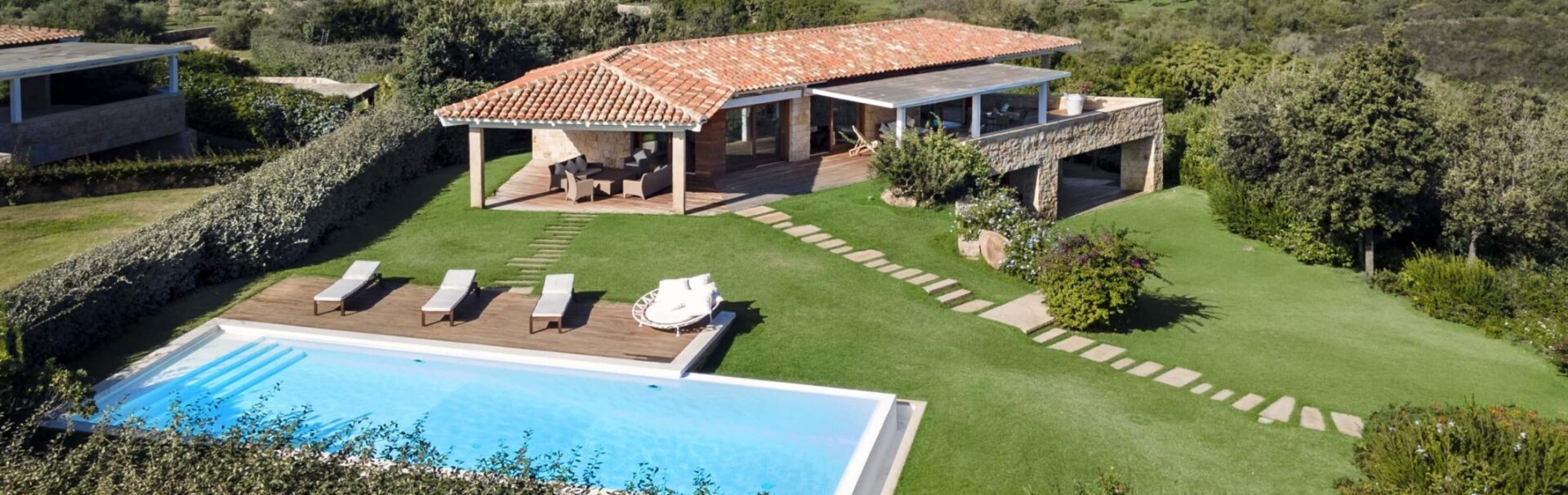Na zewnątrz znajduje się duża weranda, która otacza willę z trzech stron – jest to fantastyczne miejsce na aperitif lub kolację w gronie najbliższych. Podgrzewany basen z leżakami zbudowany został 15 metrów od willi, rozciera się stąd widok na morze. Zadbany ogród pokryty jest miękkim trawnikiem i rodzimymi roślinami, takimi jak mirt czy drzewa oliwne, ogród ma powierzchnię około 2000 m2.