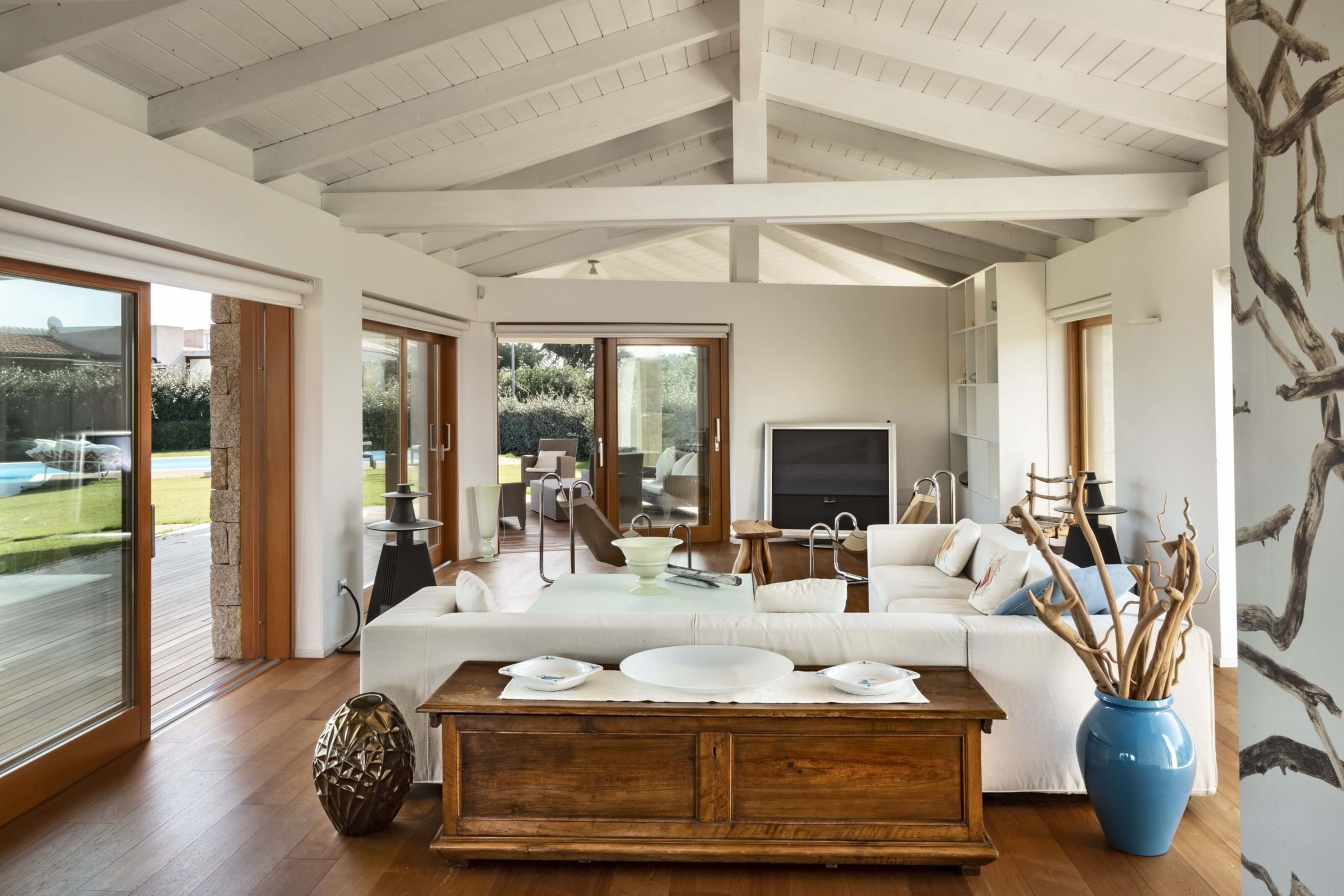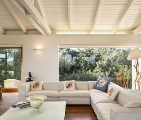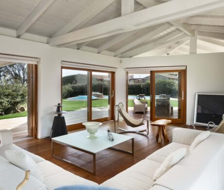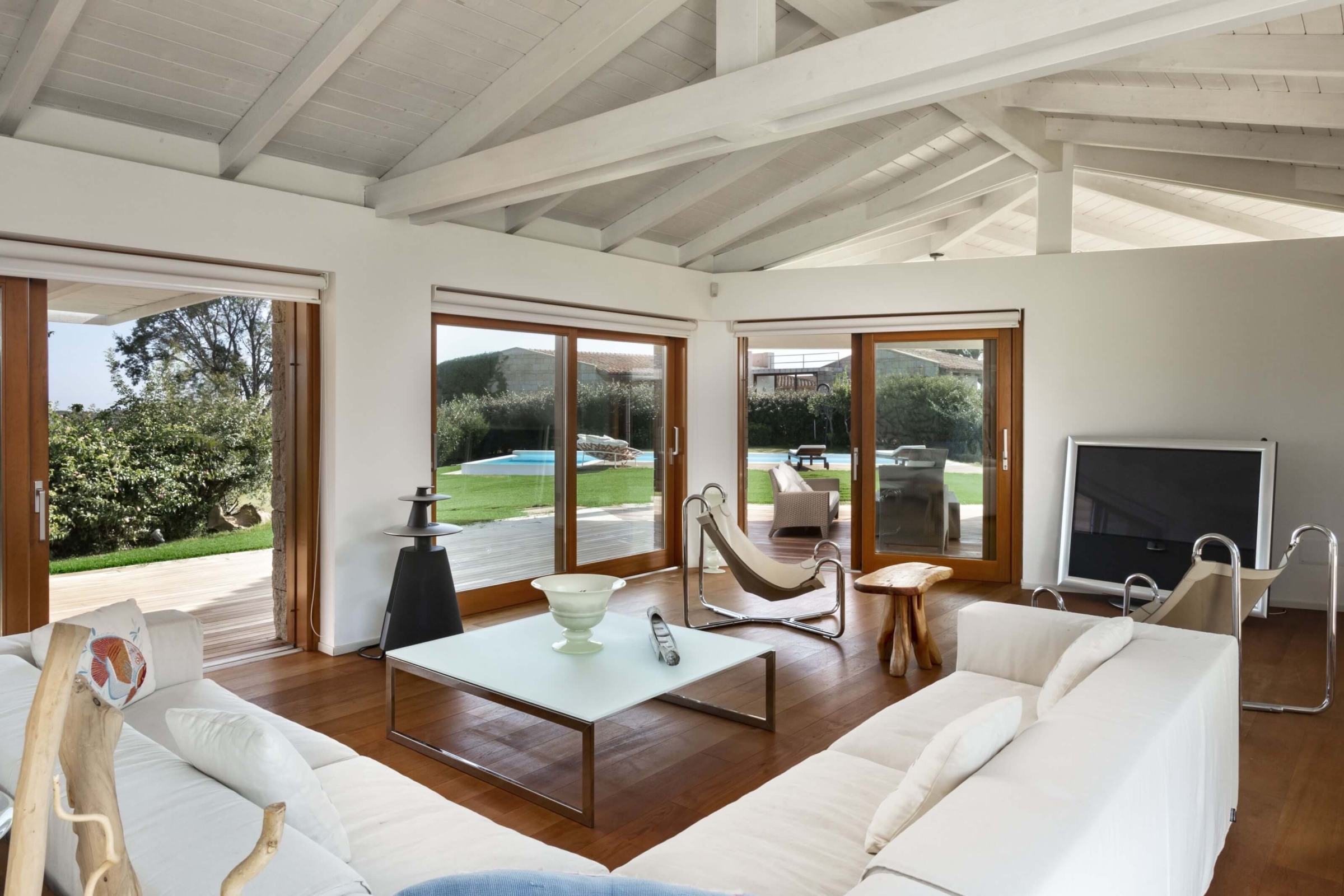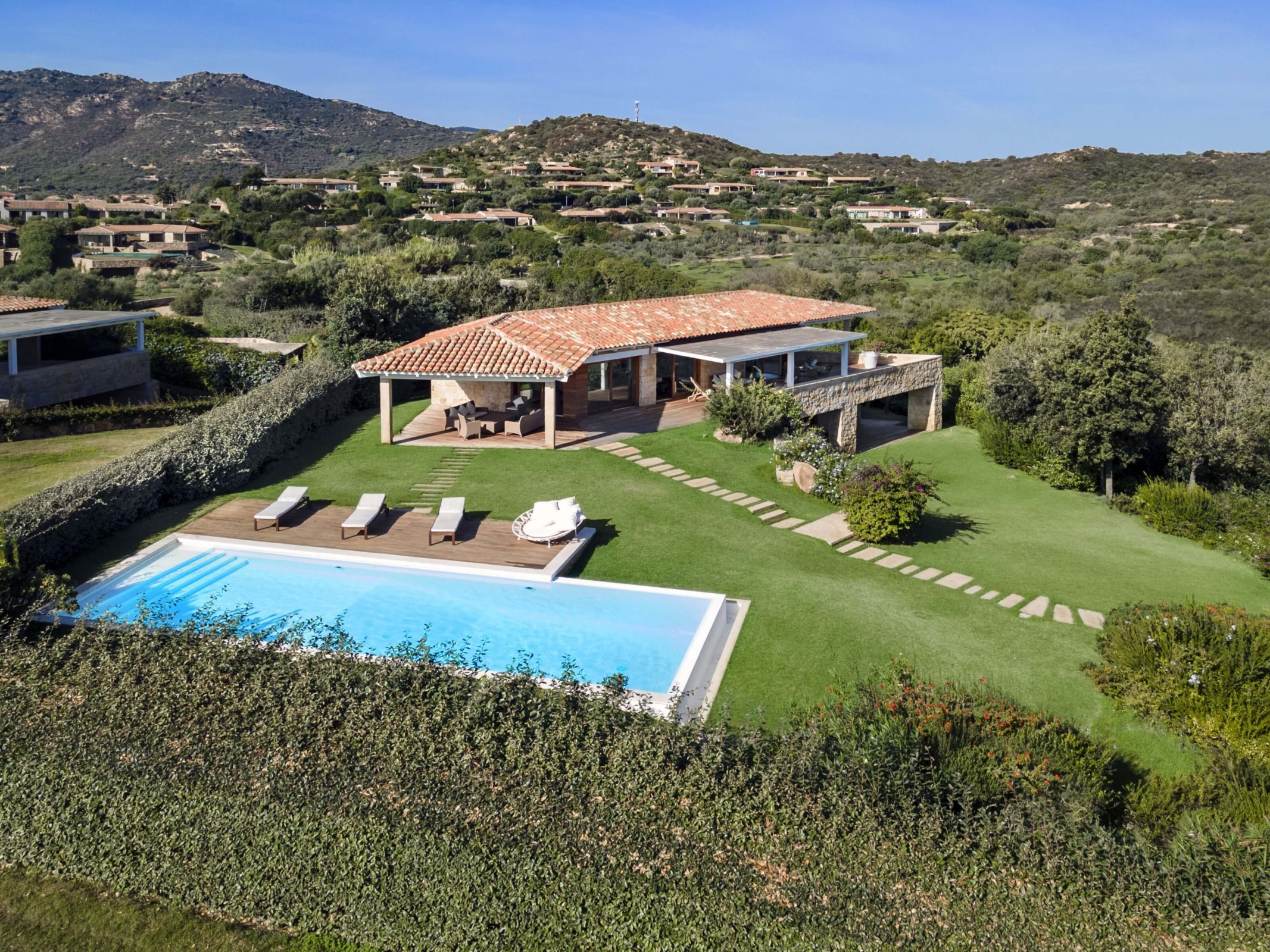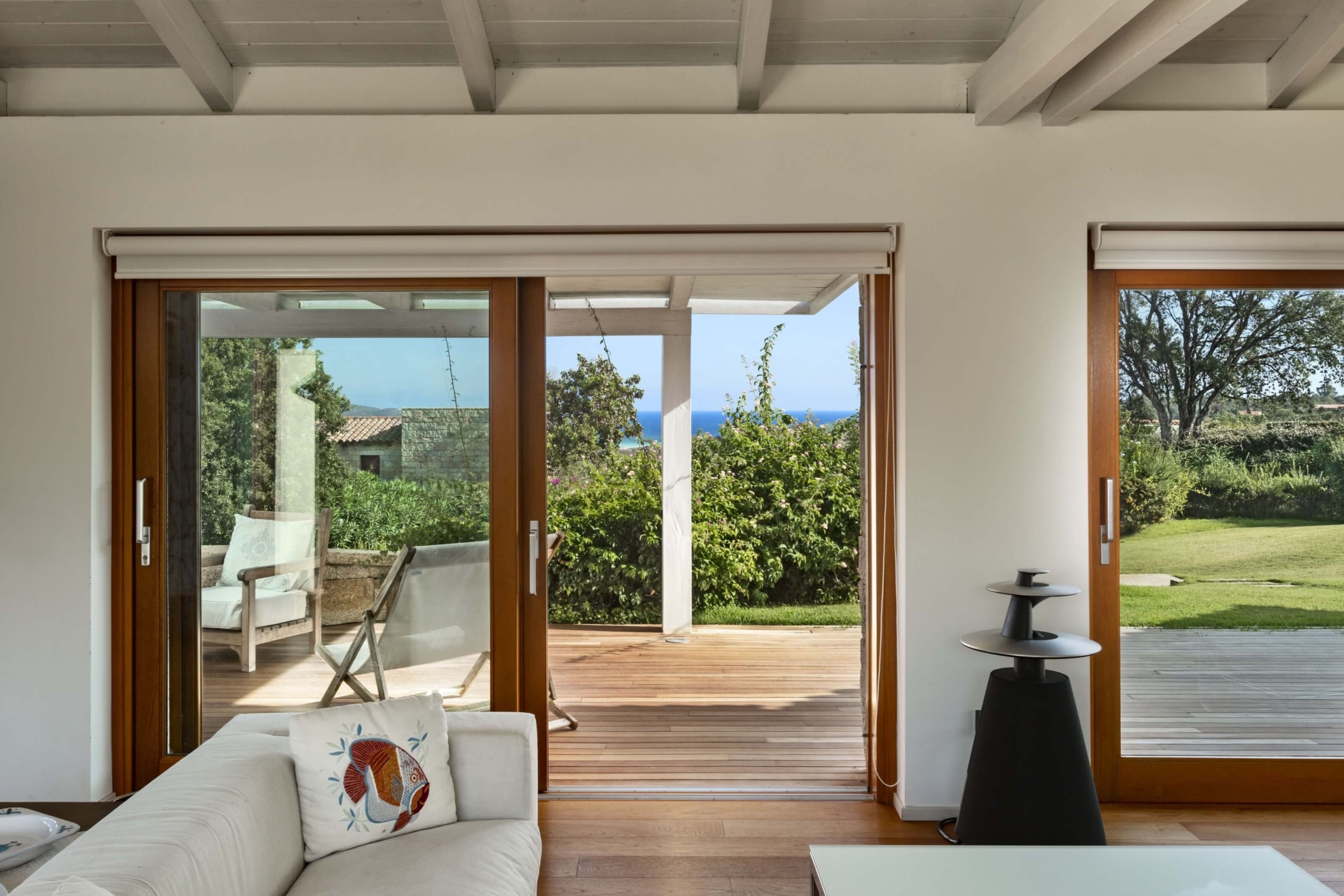 Na zewnątrz znajduje się duża weranda, która otacza willę z trzech stron – jest to fantastyczne miejsce na aperitif lub kolację w gronie najbliższych. Podgrzewany basen z leżakami zbudowany został 15 metrów od willi, rozciera się stąd widok na morze. Zadbany ogród pokryty jest miękkim trawnikiem i rodzimymi roślinami, takimi jak mirt czy drzewa oliwne, ogród ma powierzchnię około 2000 m2.