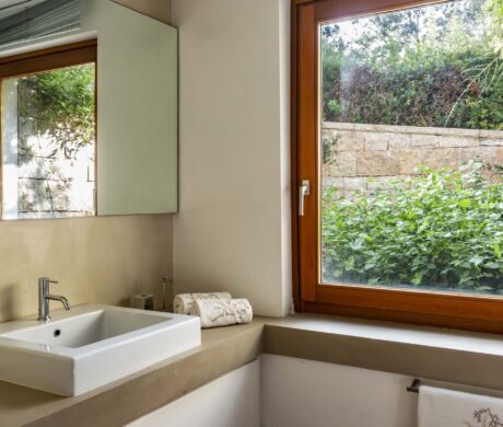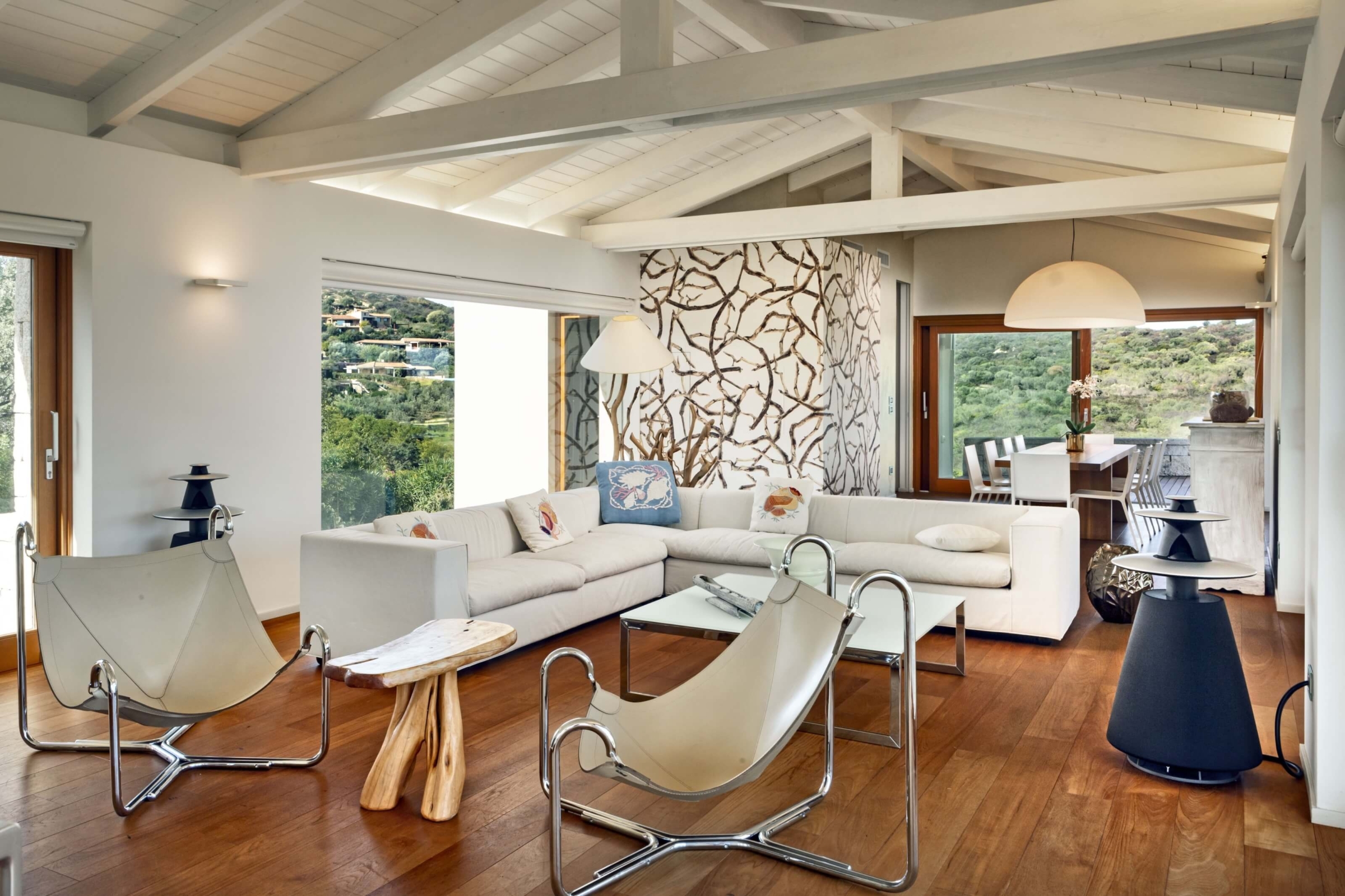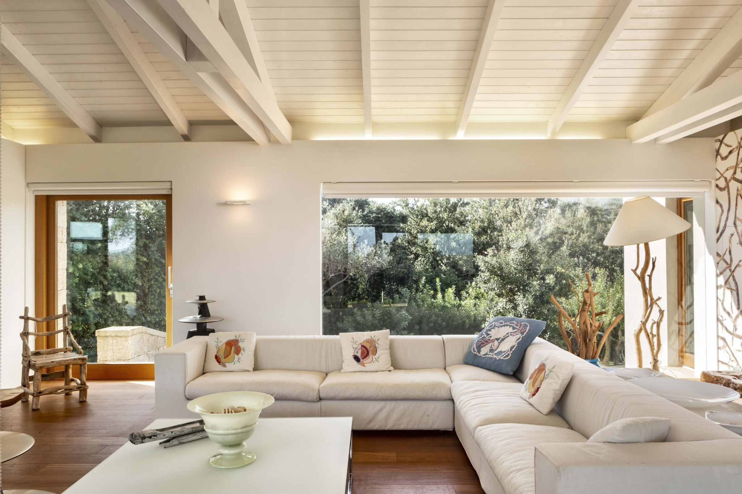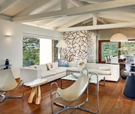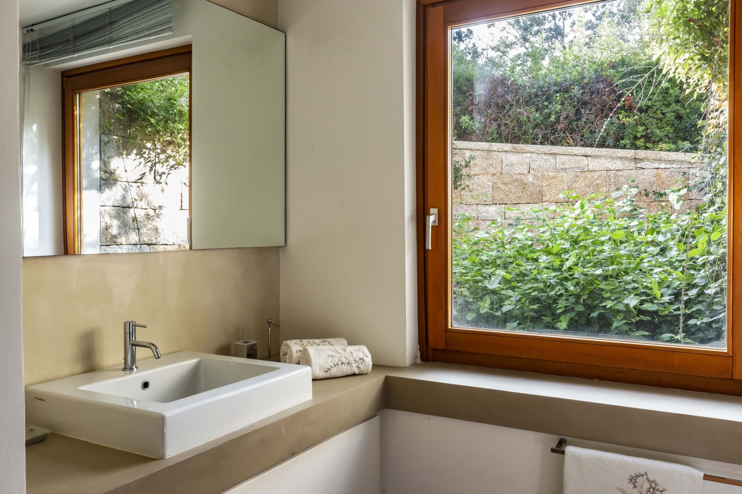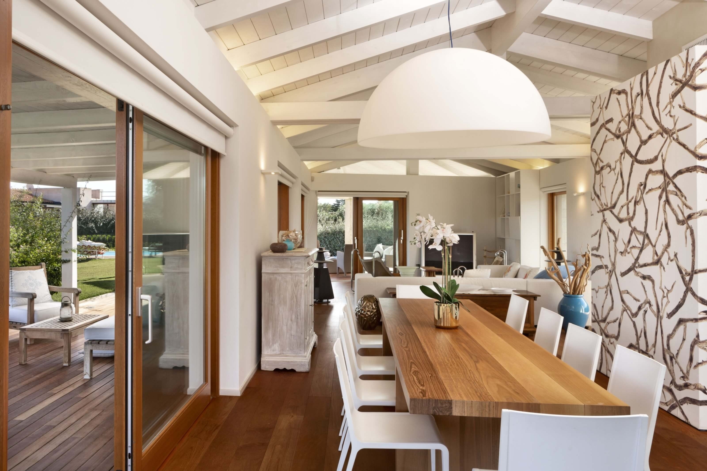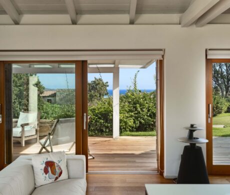 Na zewnątrz znajduje się duża weranda, która otacza willę z trzech stron – jest to fantastyczne miejsce na aperitif lub kolację w gronie najbliższych. Podgrzewany basen z leżakami zbudowany został 15 metrów od willi, rozciera się stąd widok na morze. Zadbany ogród pokryty jest miękkim trawnikiem i rodzimymi roślinami, takimi jak mirt czy drzewa oliwne, ogród ma powierzchnię około 2000 m2.