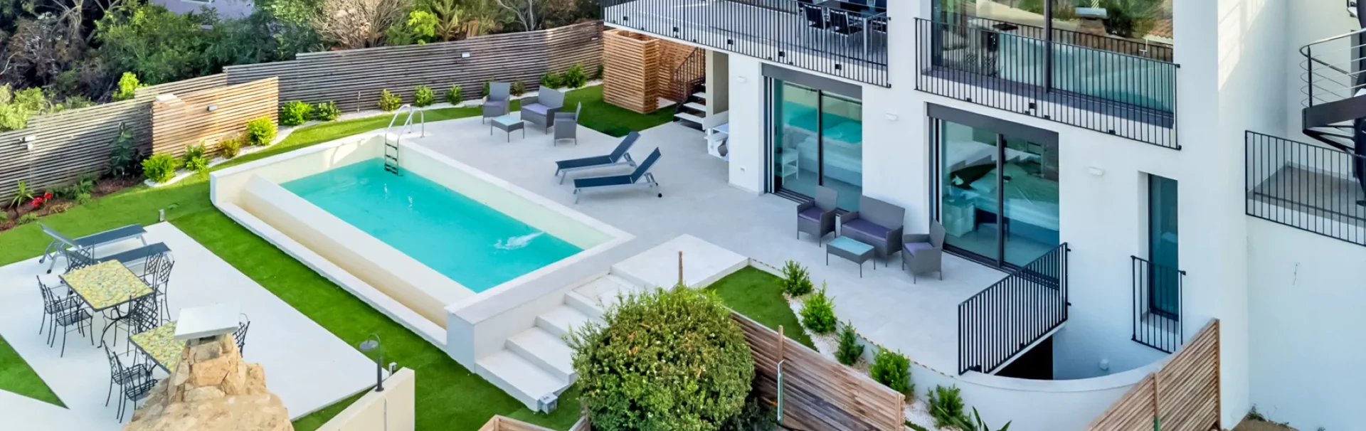 Willa znajduje się w bardzo cichym i prywatnym miejscu. Zaaranżowana jest na czterech poziomach – poziom częściowo podziemny, parter, piętro i solarium. Znajdziecie tu duży i wyposażony teren zewnętrzny z podgrzewanym basenem z przeciwprądem, miejscem do opalania, meblami ogrodowymi, nową, zadaszoną i przeszkloną altaną i duża przestrzeń do wypoczynku i do spożywania posiłków. Do dyspozycji gości jest również łazienka dostępna bezpośrednio z zewnątrz i z basenu, z prysznicem oraz dodatkowy, osłonięty prysznic na zewnątrz. Willa jest wyposażona w dodatkową dużą kuchnię na świeżym powietrzu z płytą indukcyjną, a także grillem opalanym drewnem.