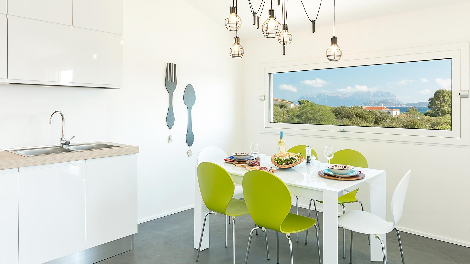 Willa rozłożona jest na trzech poziomach i została zaprojektowana z myślą o maksymalnym komforcie gości. Dodatkowym atutem jest winda wewnętrzna, dzięki której obiekt jest wygodny również dla osób z ograniczoną mobilnością. Na pierwszym piętrze znajduje się przestronny salon z eleganckim wyposażeniem, w tym wygodną sofą i dekoracjami inspirowanymi lokalną tradycją. Z salonu wychodzi się na duży, panoramiczny taras z widokiem na morze i plażę. Obok znajduje się nowoczesna, w pełni wyposażona kuchnia z częścią jadalnianą, której okno kadruje wyjątkowy widok na wyspę Tavolara.