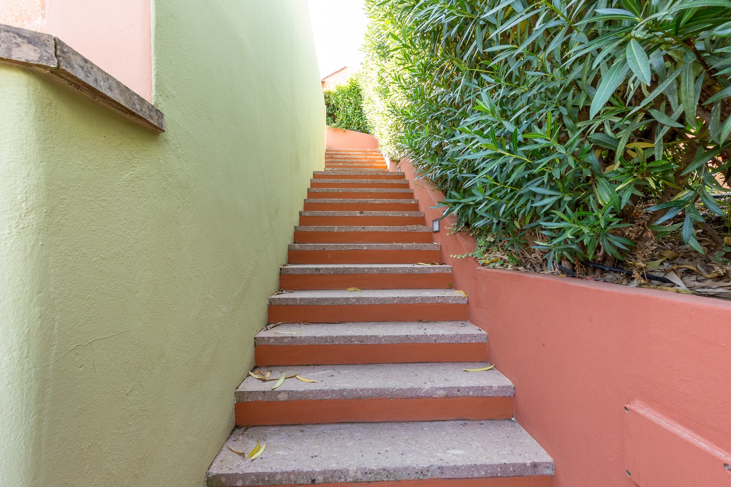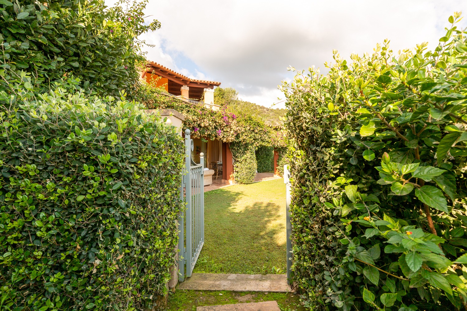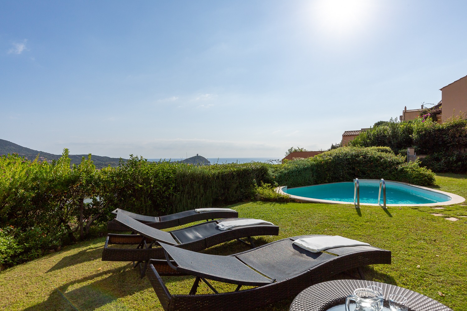 Zewnętrzna część willi to jej prawdziwy atut. Prywatny basen otoczony jest zadbanym trawnikiem i śródziemnomorską roślinnością, wokół znajdują się leżaki. Weranda z widokiem na morze i basen zachęca do relaksu przy posiłkach na świeżym powietrzu – znajduje się tam duży stół jadalny i wygodne sofy. Przed główną sypialnią położony jest kameralny taras, doskonały na poranną kawę. W ogrodzie znajduje się również prysznic zewnętrzny, a na posesji garaż z miejscem na jeden samochód. Od poziomu parkingu do wejścia prowadzi około 60 schodów.
