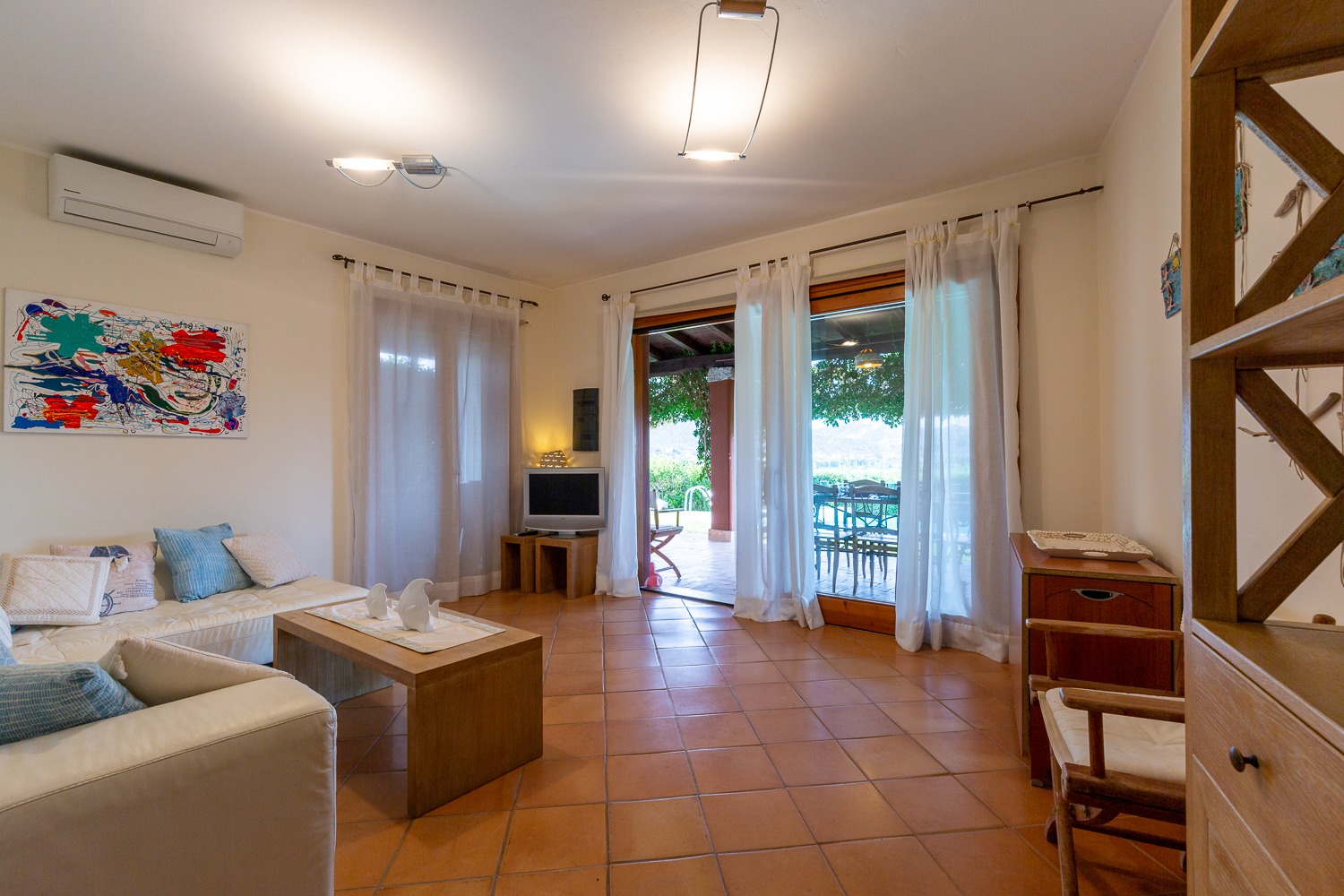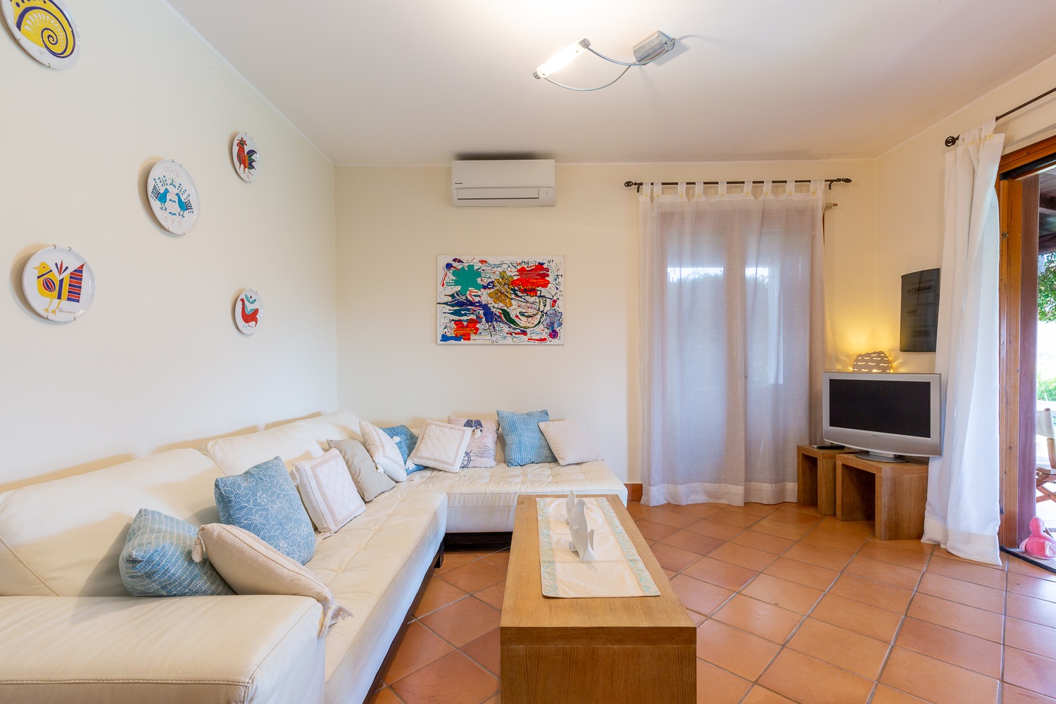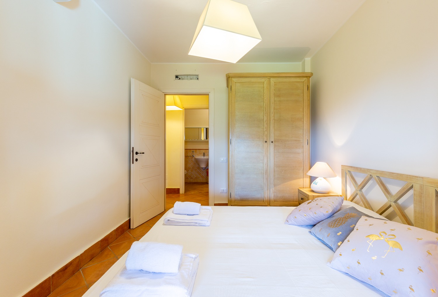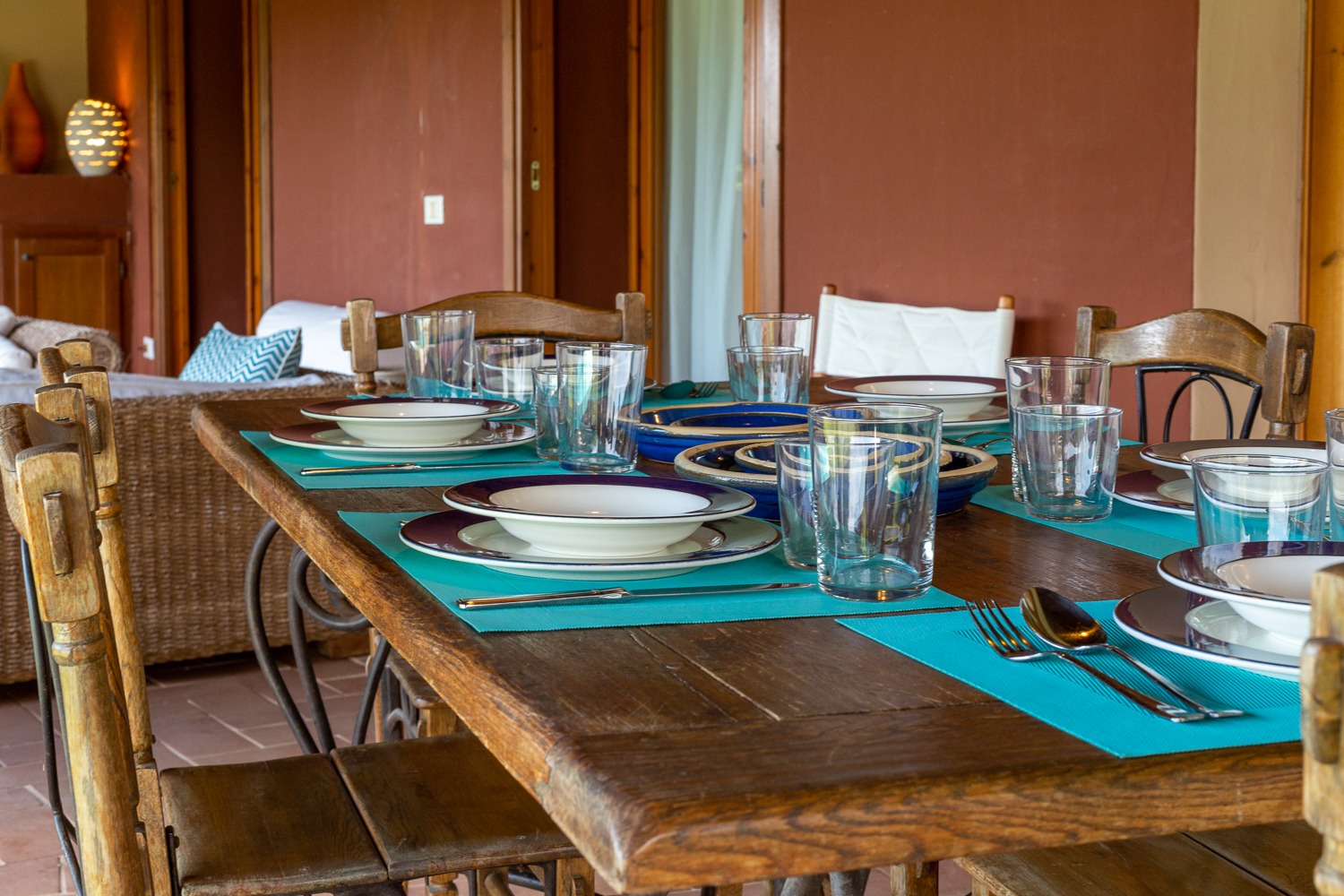 Ta przytulna willa to idealne miejsce na wakacje w otoczeniu natury. Wnętrze obejmuje przestronny salon połączony z jadalnią, z którego rozciąga się widok na basen i ogród. Z salonu można wyjść bezpośrednio na dużą, osłoniętą werandę biegnącą wzdłuż całego budynku. Kuchnia jest niewielka, ale dobrze wyposażona i funkcjonalna. W willi znajdują się trzy sypialnie – jedna z łóżkiem podwójnym i prywatnym tarasem z wyjściem do ogrodu, druga z dwoma pojedynczymi łóżkami, które można połączyć, oraz trzecia, mniejsza, z praktycznymi łóżkami piętrowymi. Goście mają do dyspozycji dwie łazienki: jedną z wanną i drugą z prysznicem.
