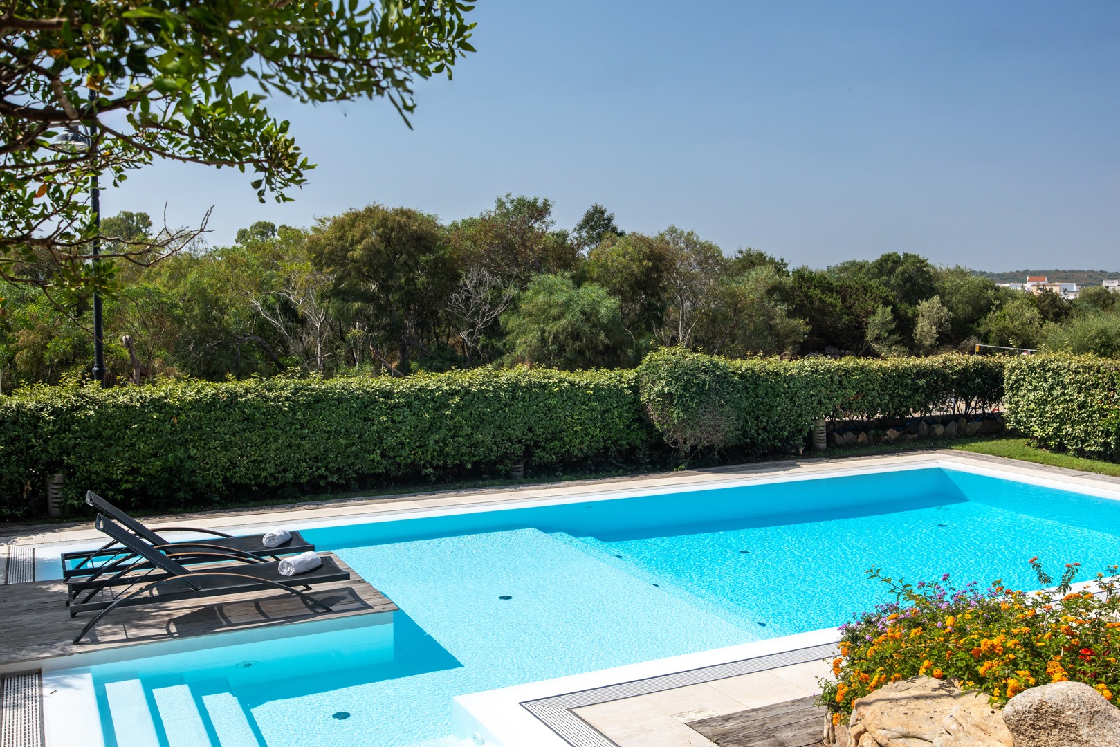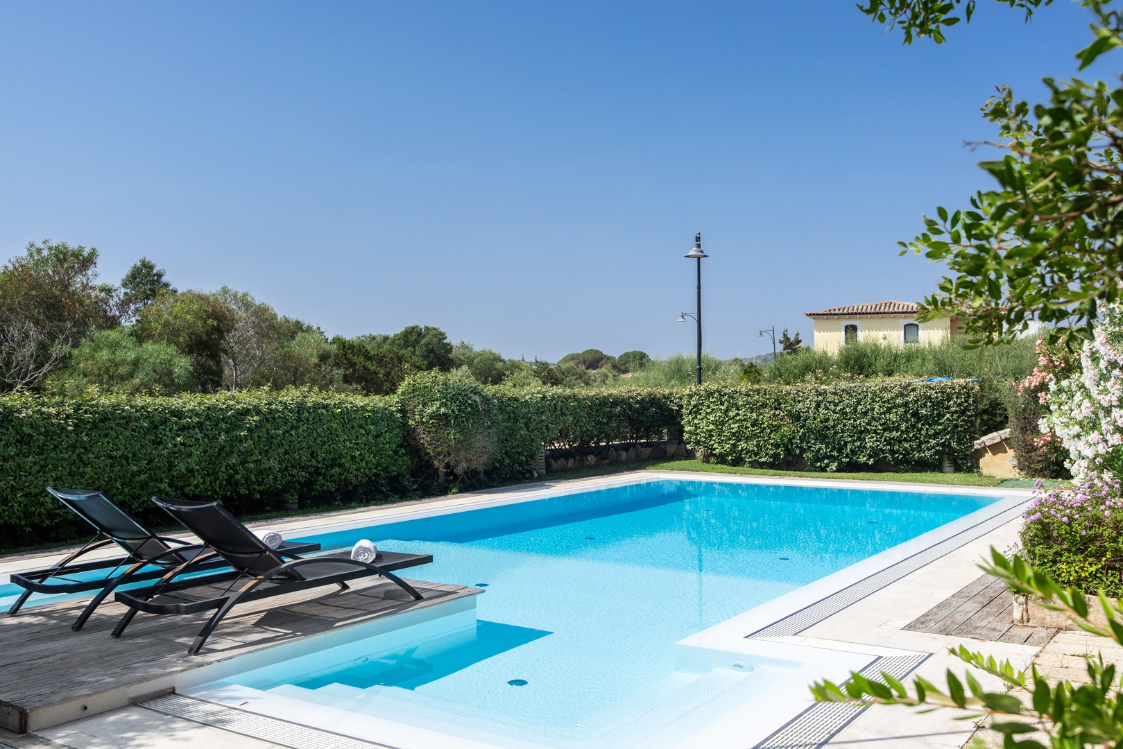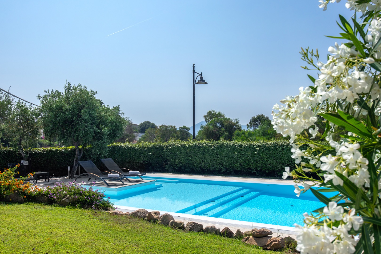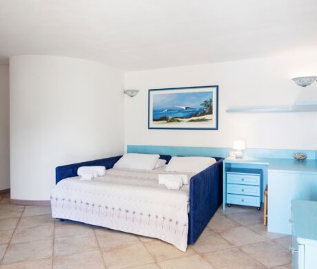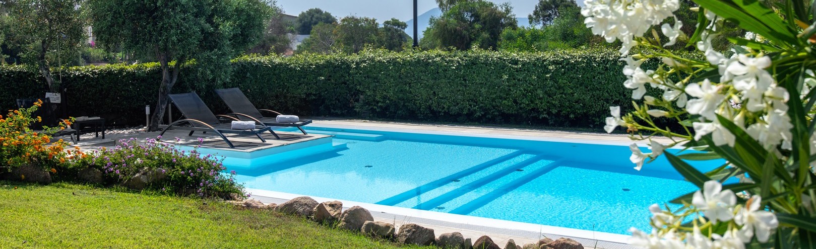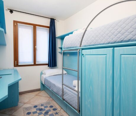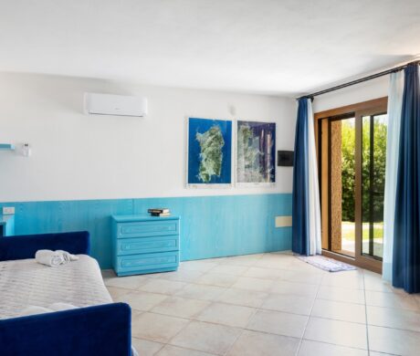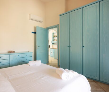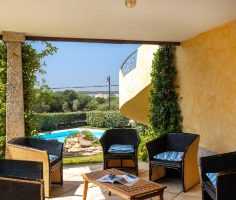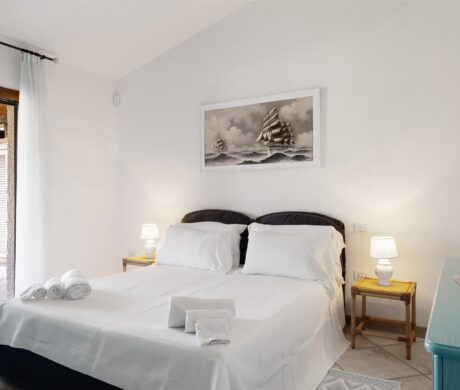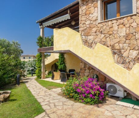 Na parterze znajdują się dwie komfortowe sypialnie dwuosobowe oraz dodatkowy pokój z dwoma łóżkami pojedynczymi. Wszystkie wnętrza zostały urządzone z wykorzystaniem ręcznie wykonanych elementów oraz tkanin inspirowanych kolorami morza i natury Sardynii. Do dyspozycji gości jest także druga łazienka. Na zewnątrz znajduje się rozległy, zadbany ogród z trawnikiem i śródziemnomorską roślinnością, który tworzy przyjemną przestrzeń do wypoczynku. Największą atrakcją jest duży basen typu infinity z częścią hydromasażu, wspólny dla dwóch bliźniaczych willi.