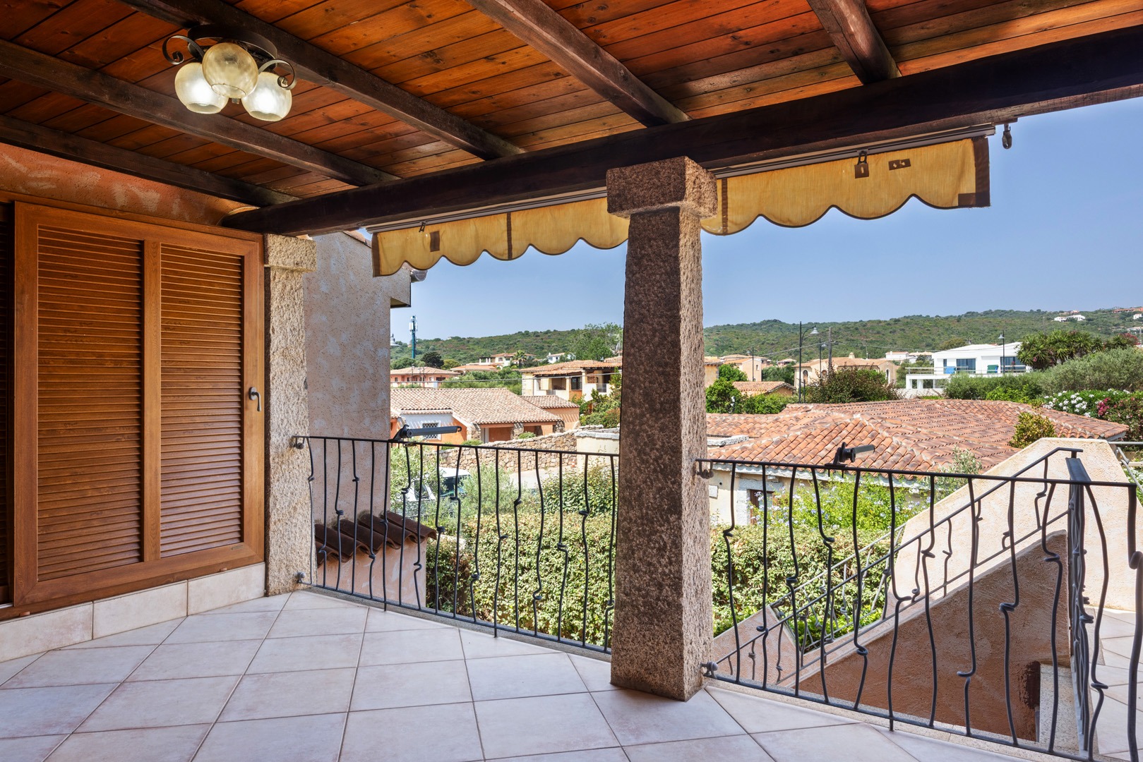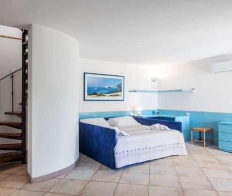 Willa rozłożona jest na dwóch poziomach i posiada niezależne wejście, a jej wnętrza połączone są charakterystycznymi schodami spiralnymi. Na piętrze znajduje się przestronny salon z wygodną sofą oraz wyjściem na dużą werandę z widokiem na morze i plażę. Obok mieści się nowoczesna, w pełni wyposażona kuchnia z częścią jadalnianą, której okna otwierają się na wyspę Tavolara. Na tym poziomie znajduje się również jedna sypialnia dwuosobowa z wyjściem na werandę oraz łazienka.