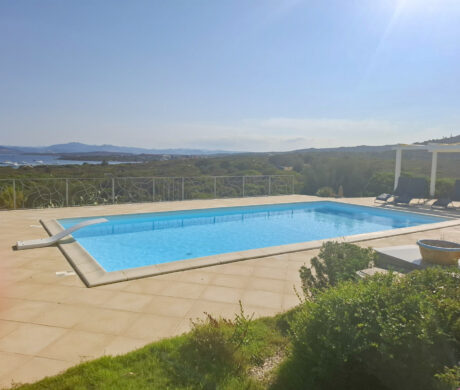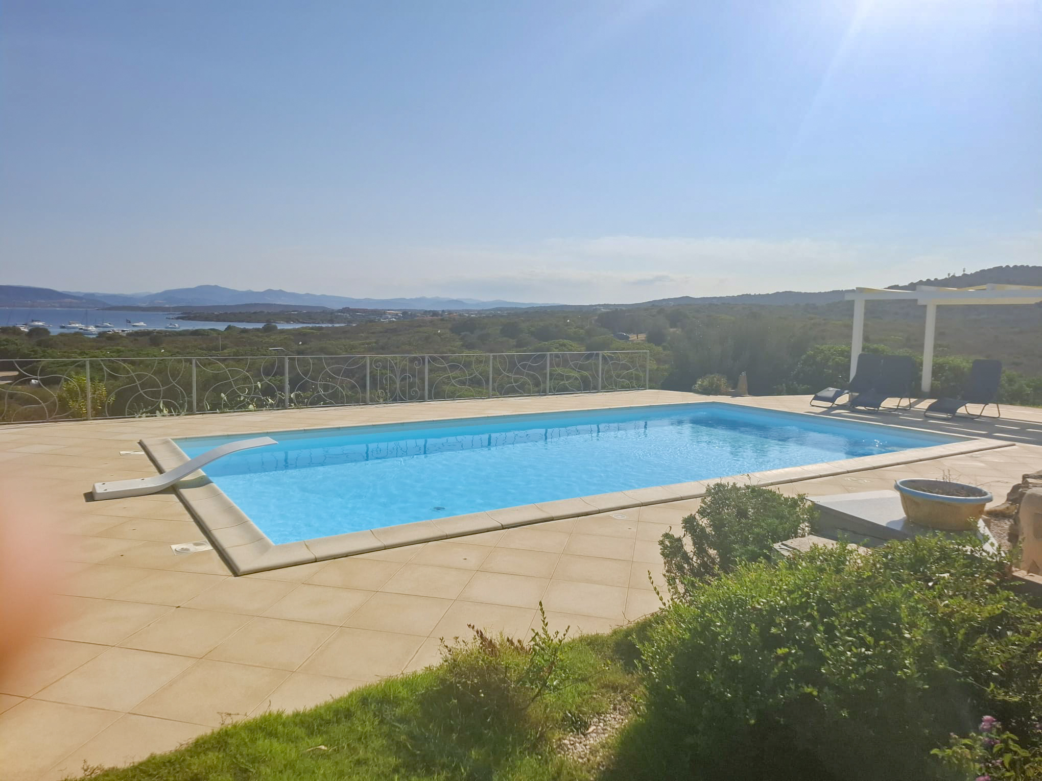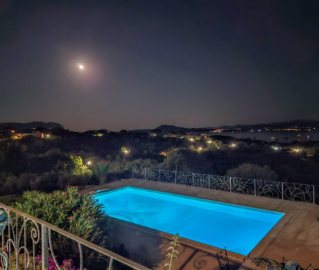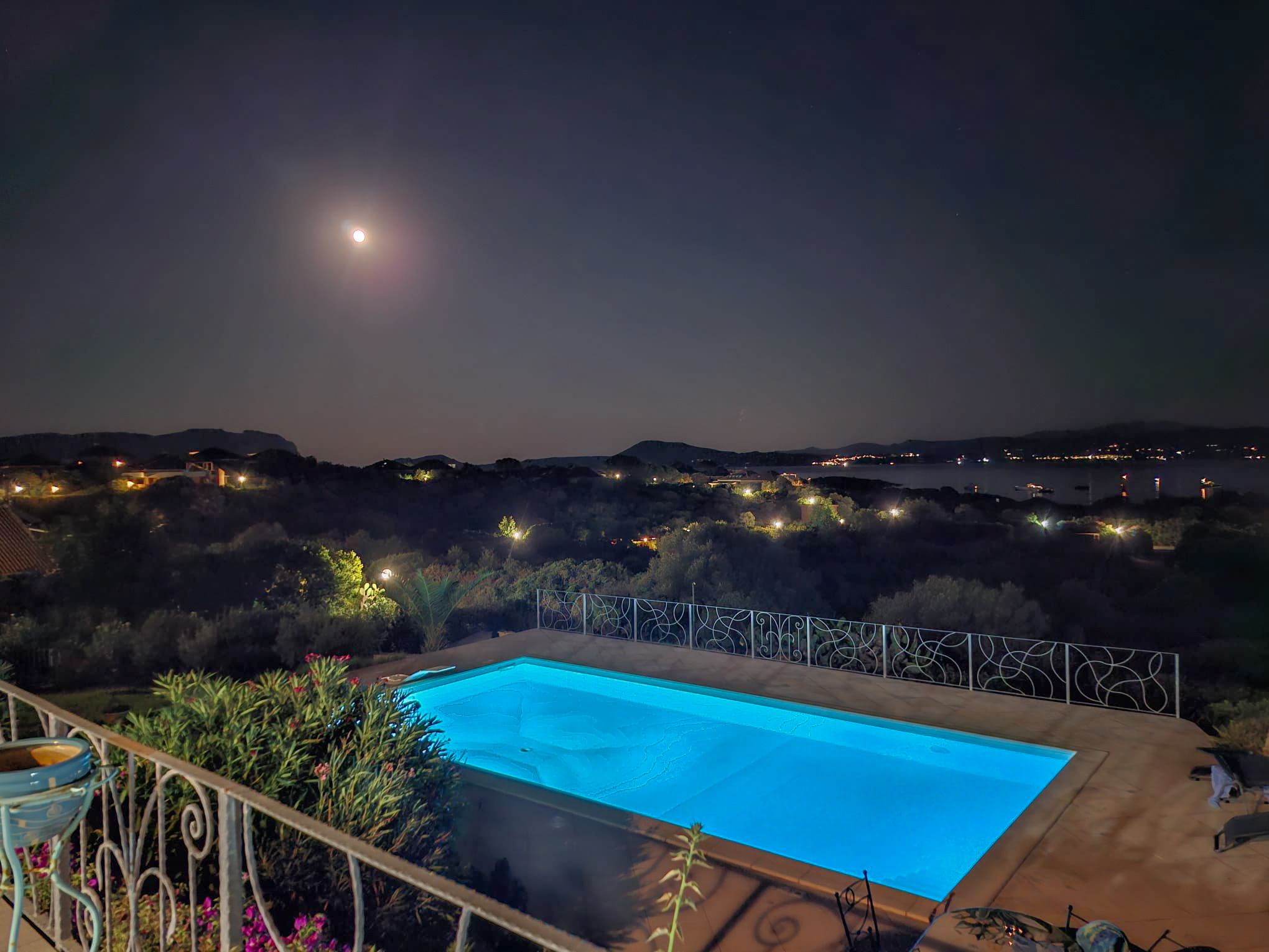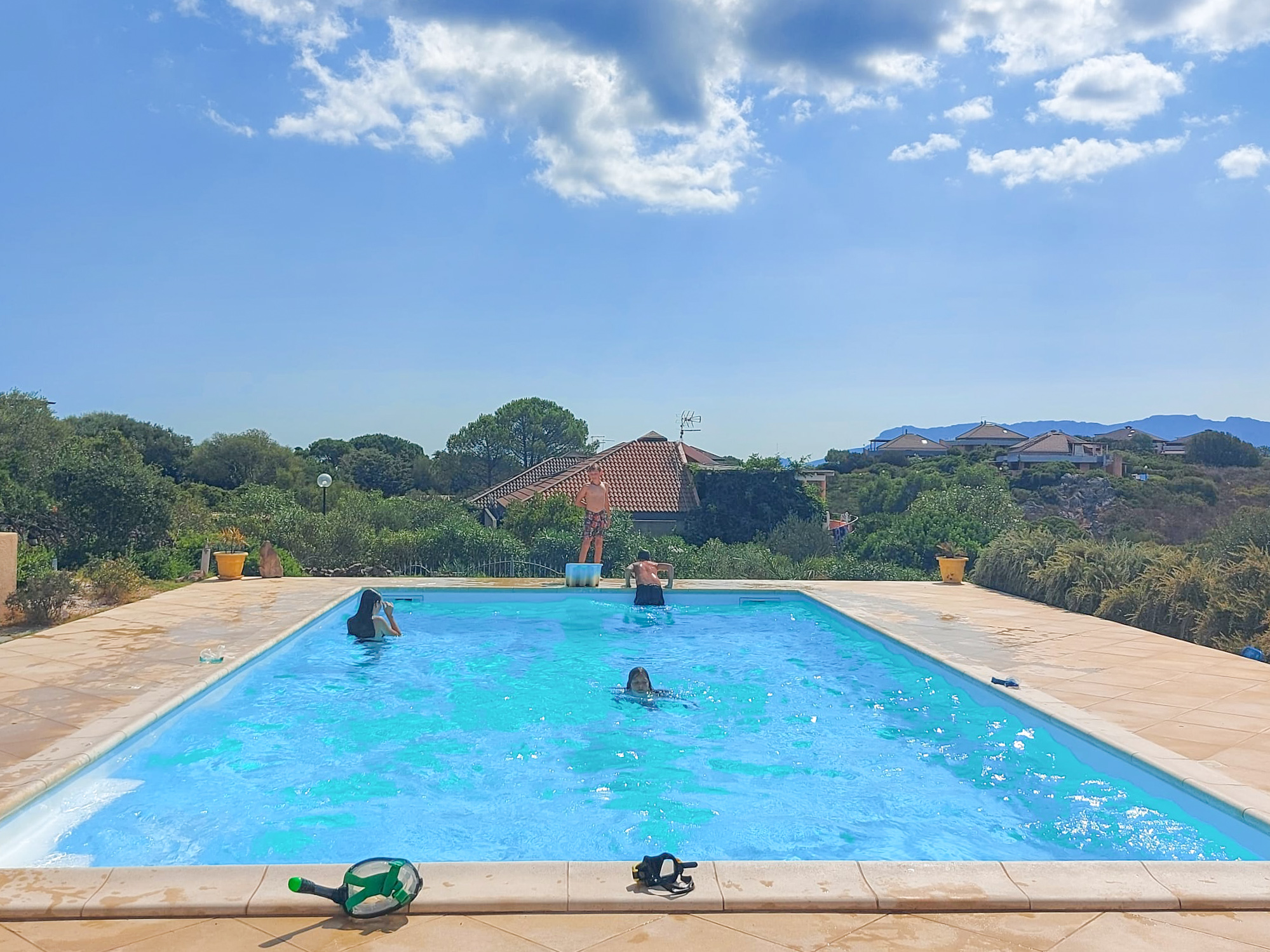 Zewnętrzna część willi zachwyca bujną śródziemnomorską roślinnością, a prywatny basen otoczony jest strefą solarium i rozciąga się z niego piękny widok na morze. Przy basenie znajduje się prysznic zewnętrzny. Na terenie posesji znajduje się również duży podjazd oraz zadaszone miejsce parkingowe, a także dodatkowa przestrzeń na kolejne pojazdy.