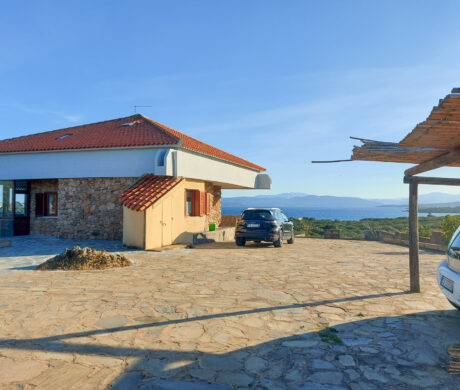 Centralnym punktem domu jest duży salon, z którego wychodzi się na przestronną werandę. Jest ona częściowo zadaszona i wyposażona w duży stół jadalny i dwie kanapy, co tworzy idealne miejsce do relaksu i wspólnych posiłków. Z werandy rozciąga się piękny widok na morze oraz basen, położony nieco niżej i dostępny schodkami.