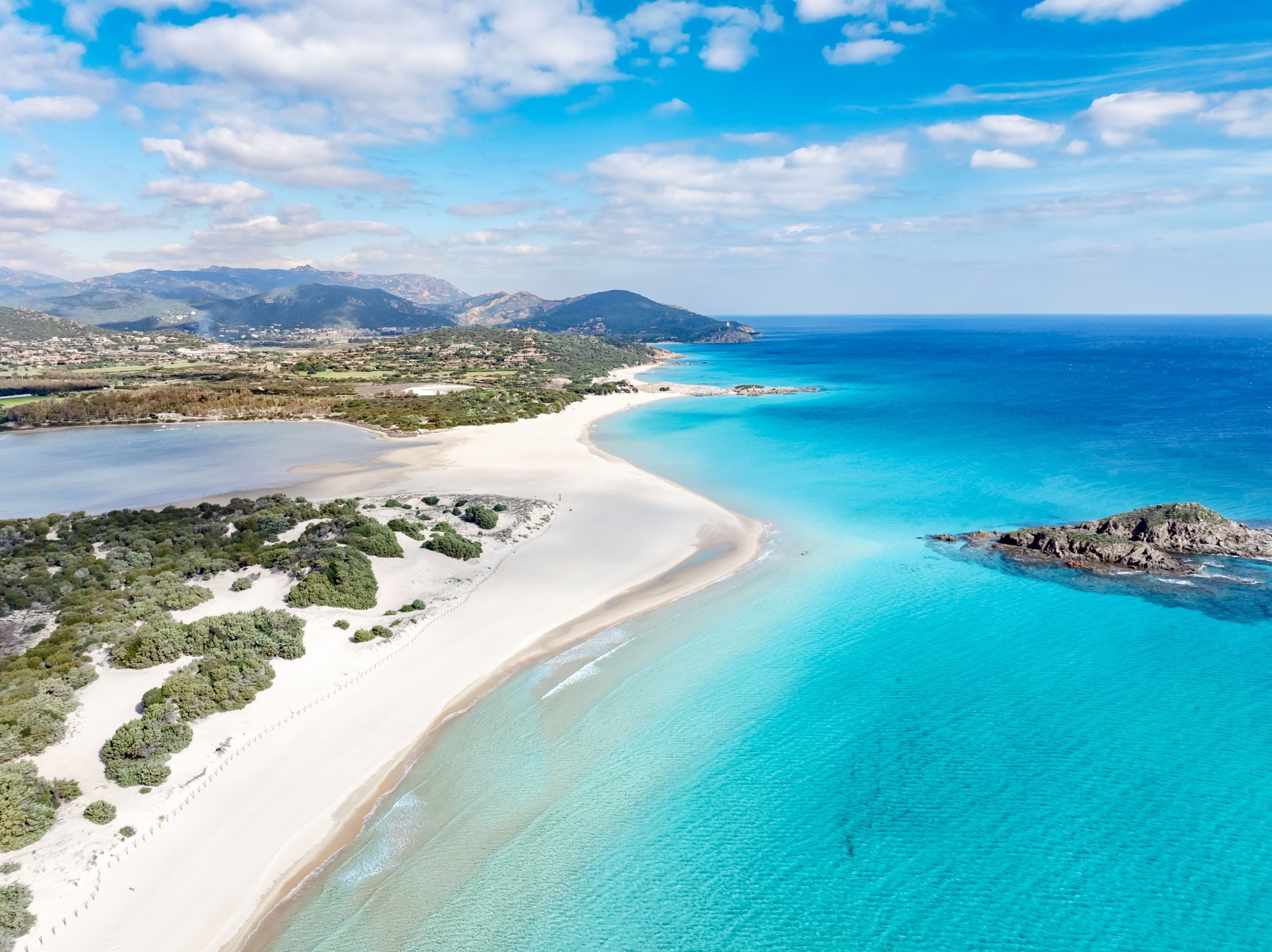 Przenosimy się na wschodnią część południowego wybrzeża, do Chia. Su Giudeu to ikona tego regionu. Szeroka, złocista zatoka otoczona jest imponującymi, chronionymi wydmami, a jej drobny piasek i turkusowa woda tworzą idealne miejsce dla rodzin z dziećmi. Spokojne, płytkie zejście do morza sprzyja bezpiecznym kąpielom. Tuż przy brzegu znajduje się malownicza wysepka o tej samej nazwie, a za plażą rozciągają się słodko-słone laguny – siedlisko flamingów i wielu gatunków ptactwa wodnego.